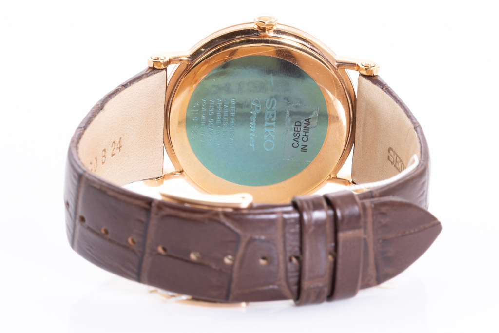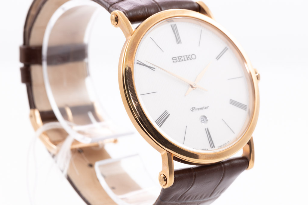 Seiko Premier gold tone stainless steel quartz mens watch. Cream colour dial, date, stainless case, case diameter: 40.7mm, strap length: 22cm, made in Japan, Ref# SKP398P. With Seiko brown leather strap and buckle. With Seiko Certificate of Limited Guarantee and Seiko box. Seiko warranty applies. (As New, Note: minor scratches on case and light wear on strap due to being display stock))