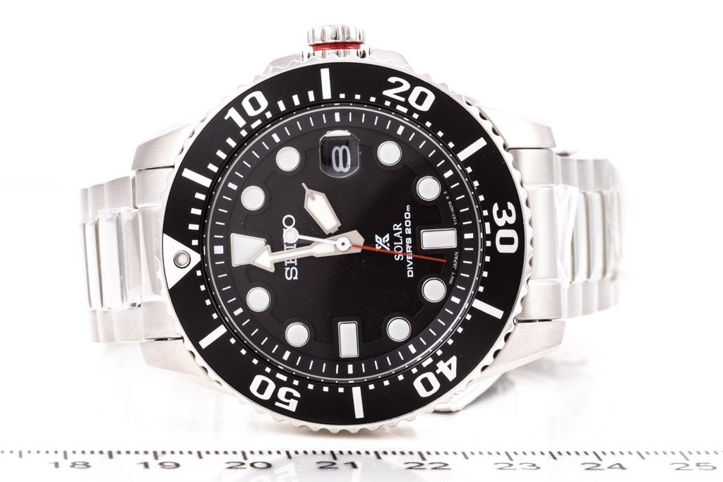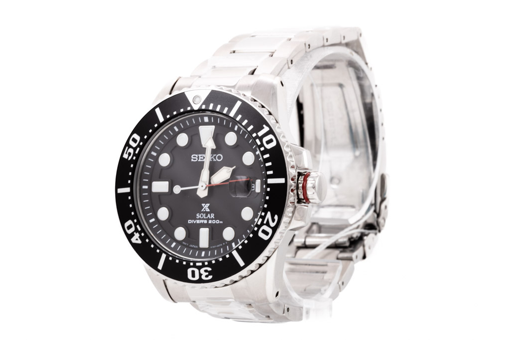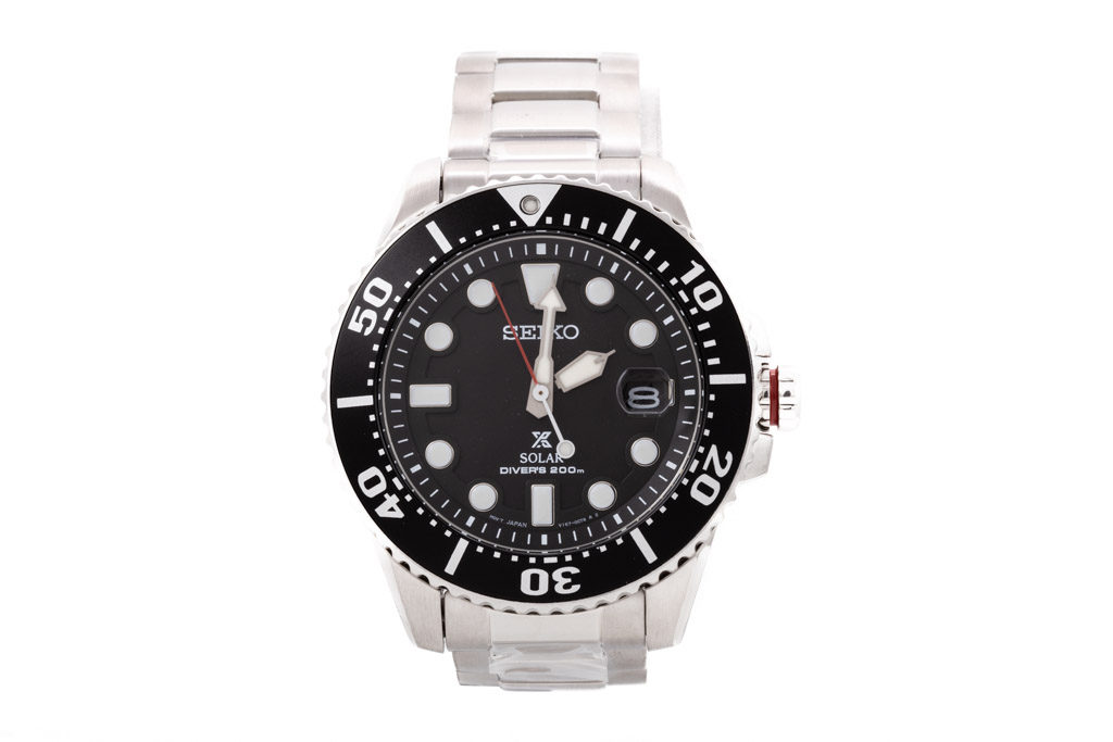 Seiko Propex Solar Divers stainless steel mens watch. Black dial, date, case diameter: 43.5mm, wrist size: 20cm, made in Japan, Ref# SNE437P. With Seiko stainless steel bracelet and clasp. With Seiko Certificate of Limited Guarantee Card and Seiko box. Seiko warranty applies. (As New, Note: minor scratches on case and bracelet due to being display stock)