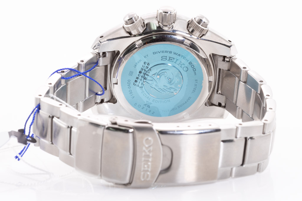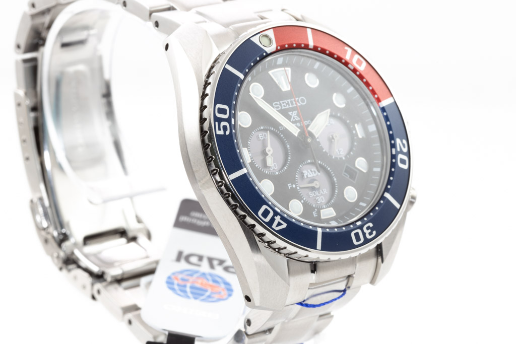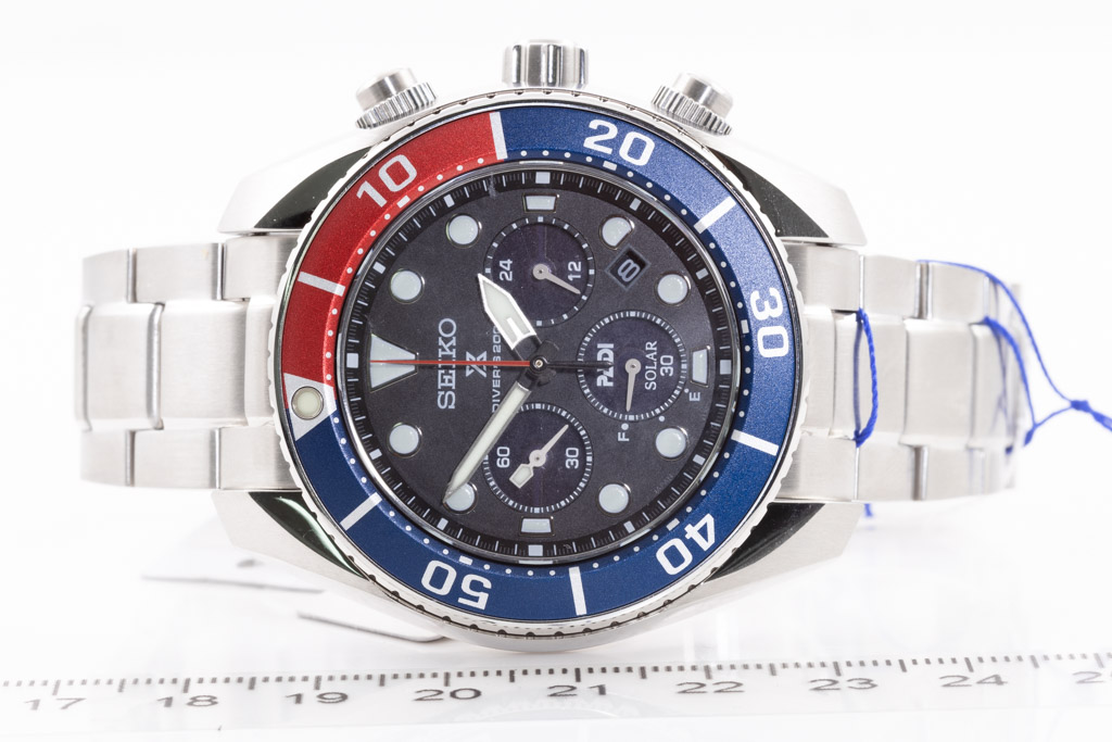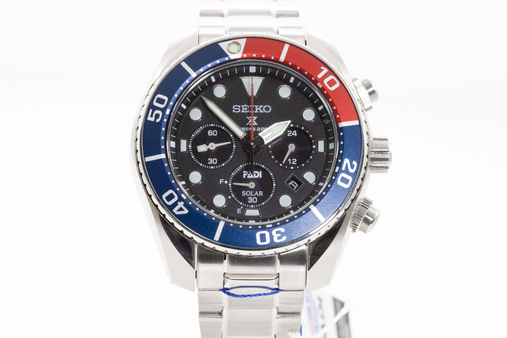 Seiko Prospex PADI Special Edition stainless steel Solar mens watch. Black chronograph dial, date, case diameter: 44.5mm, wrist size: 20cm, made in Japan. Ref# SSC795J. With Seiko stainless steel bracelet and clasp. With Seiko Certificate of Limited Guarantee Card and Seiko box. Seiko warranty applies. (As New, Note: minor scratches on case and bracelet due to being display stock)