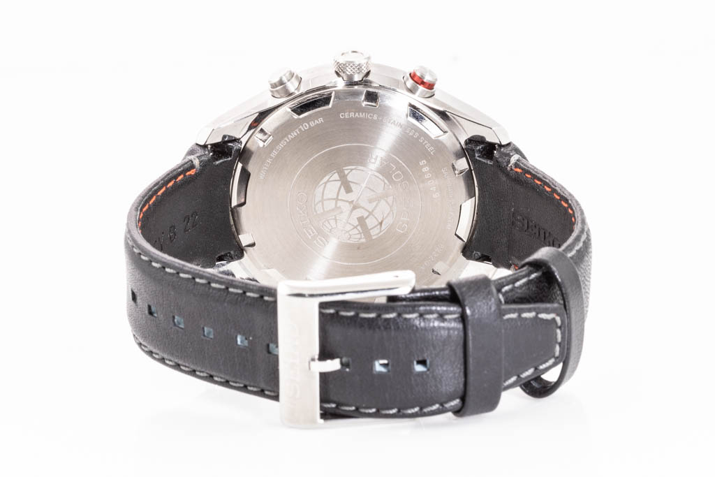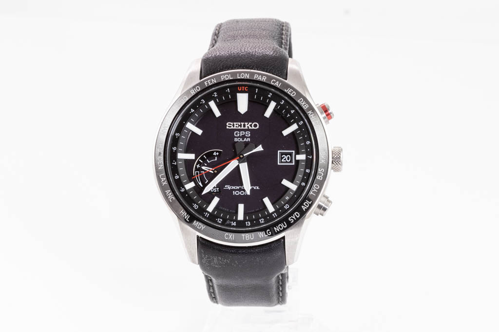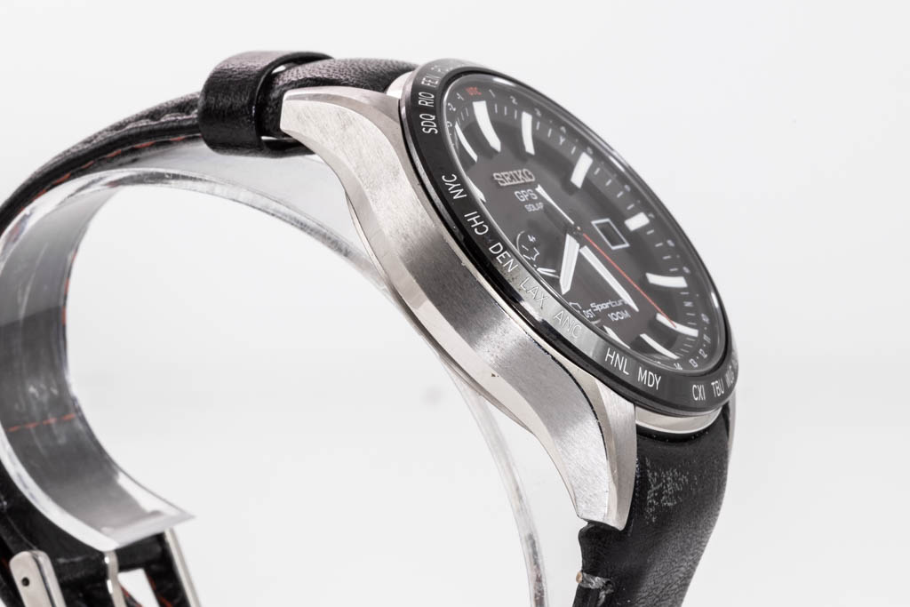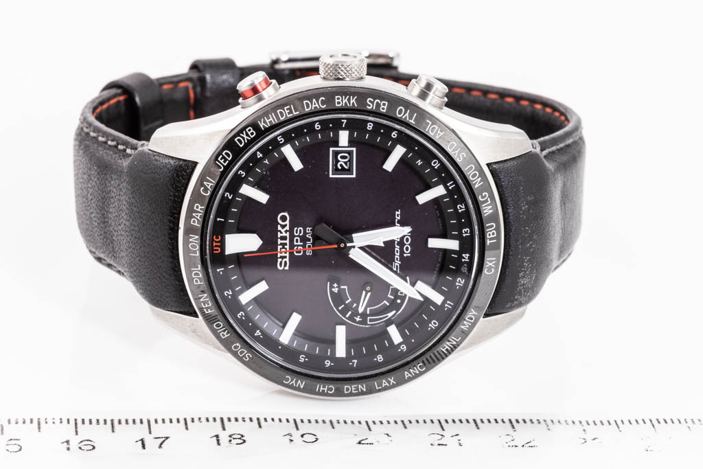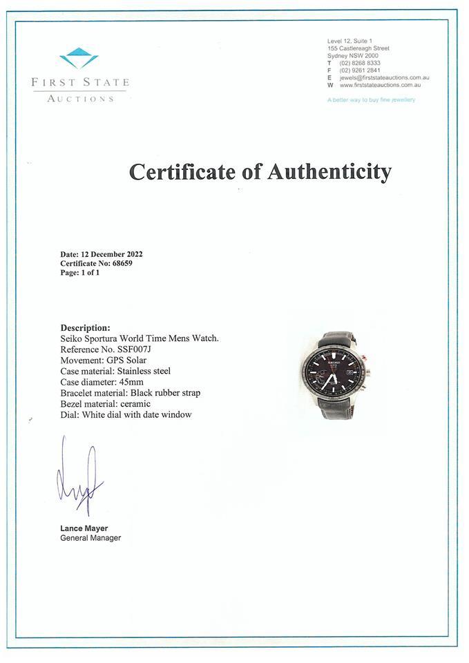 Seiko Sportura GPS Solar World Time stainless steel mens watch. Black dial, date, case diameter: 45mm, wrist size: 21cm, Swiss made. Ref# SSF007J. With Seiko black rubber strap and buckle. With FSA Certificate of Authenticity and Seiko box. 3 month FSA warranty. (As New)