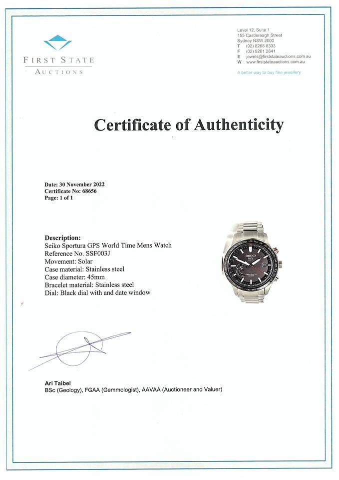 Seiko Sportura GPS World Time stainless steel solar mens watch. Black dial, date, case diameter: 45mm, wrist size: 21cm, made in Japan. Ref# SSF003J. With Seiko stainless steel bracelet and clasp. With FSA Certificate of Authenticity and Seiko box. 3 month FSA warranty. (As New, Note: minor scratches on case and bracelet due to being display stock)