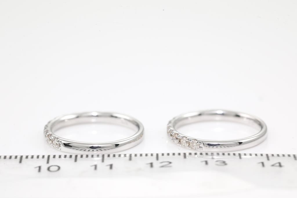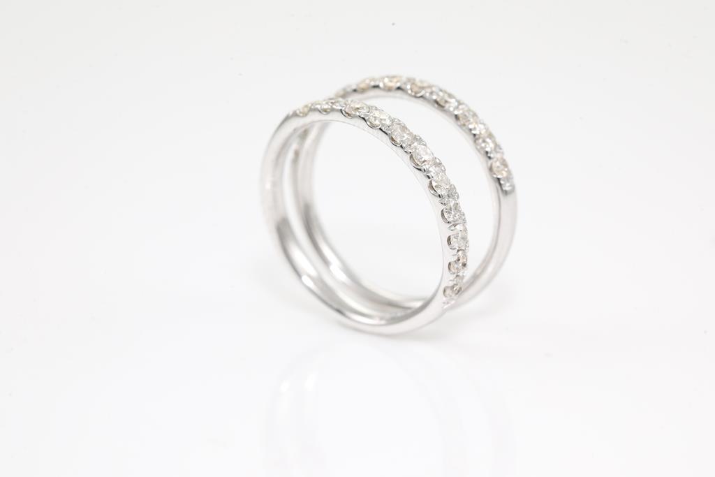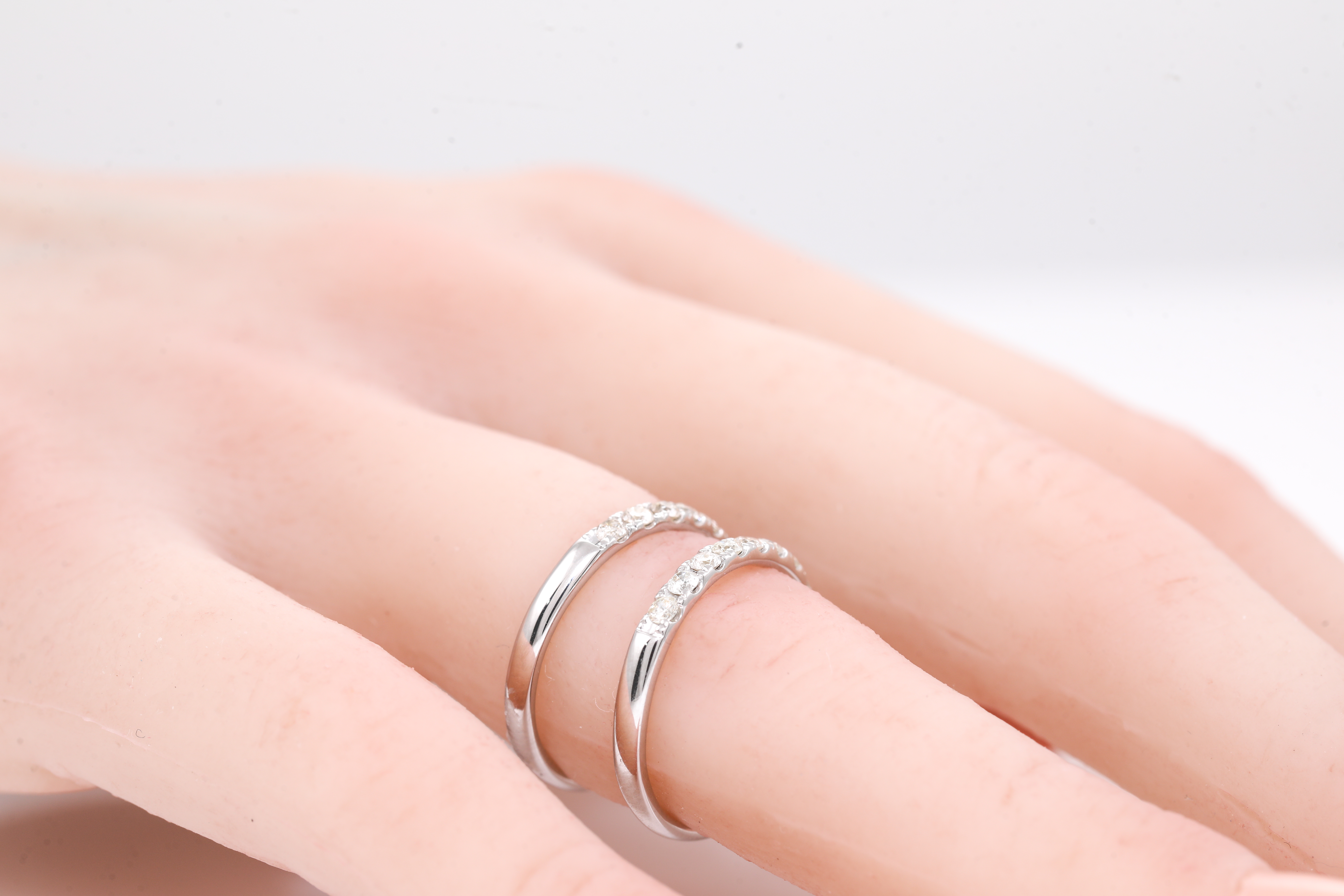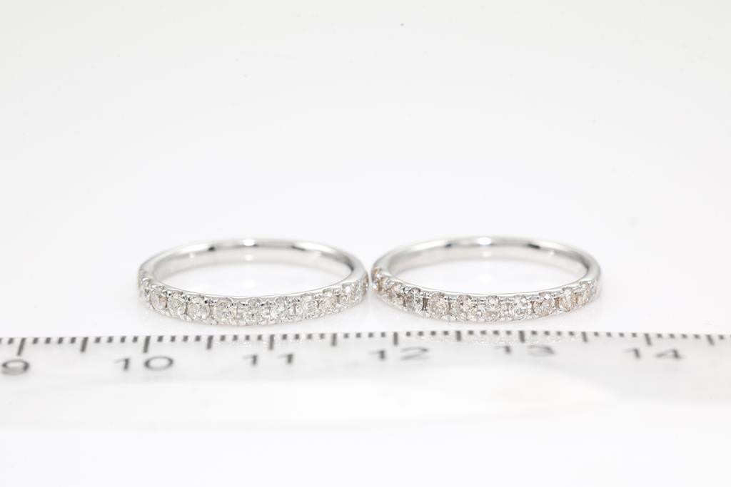 Set of two Diamond eternity rings with 22 round Diamonds (11 in each ring) totalling approximately 0.50cts (Estimated grading: J-K P1-2). 9ct white gold. Ring size K - ring resizing is not recommended. Total weight: 3.7g. (Pre-owned)