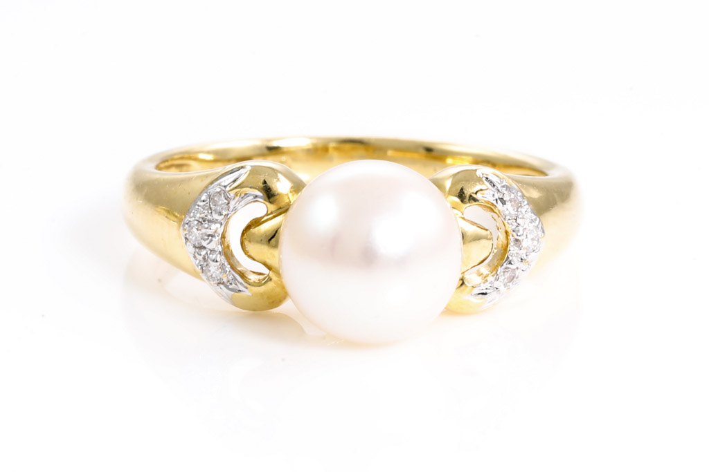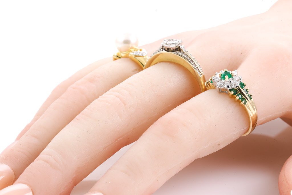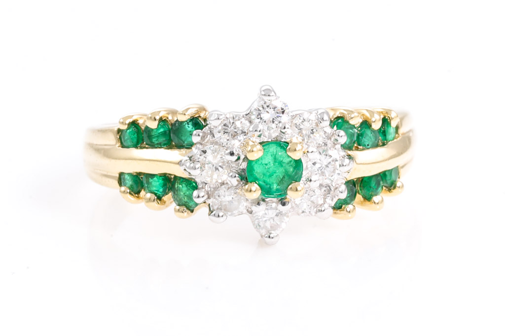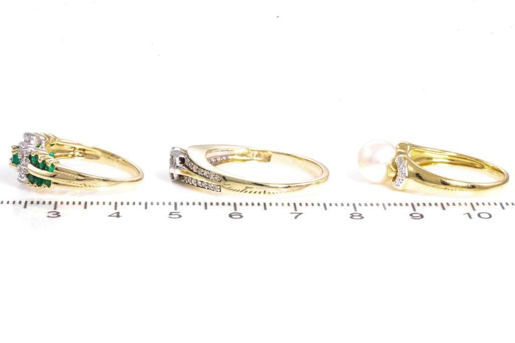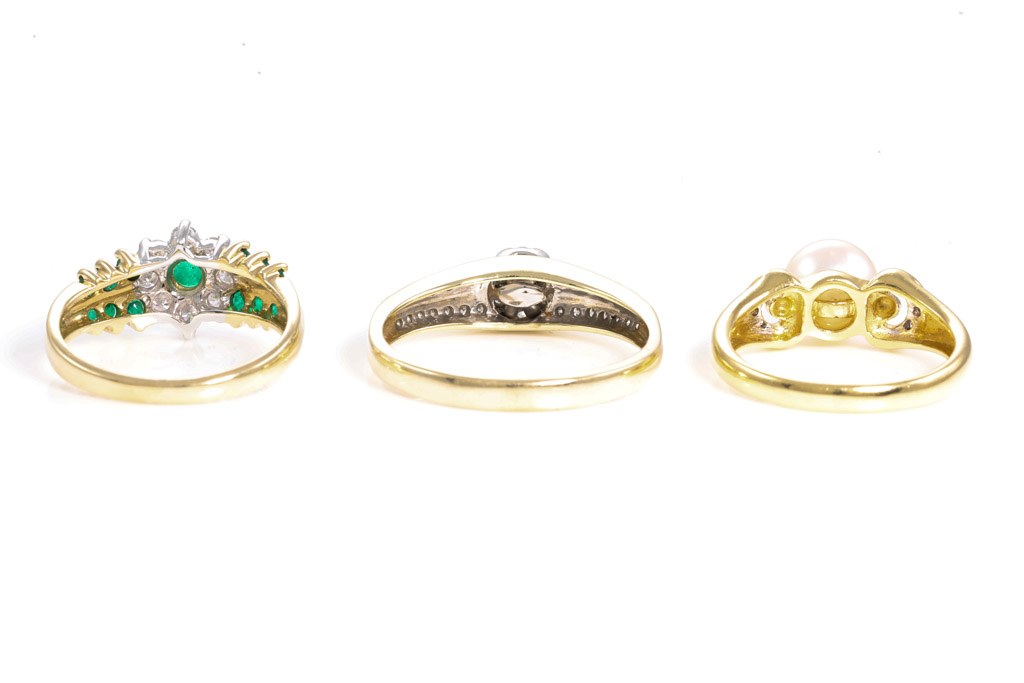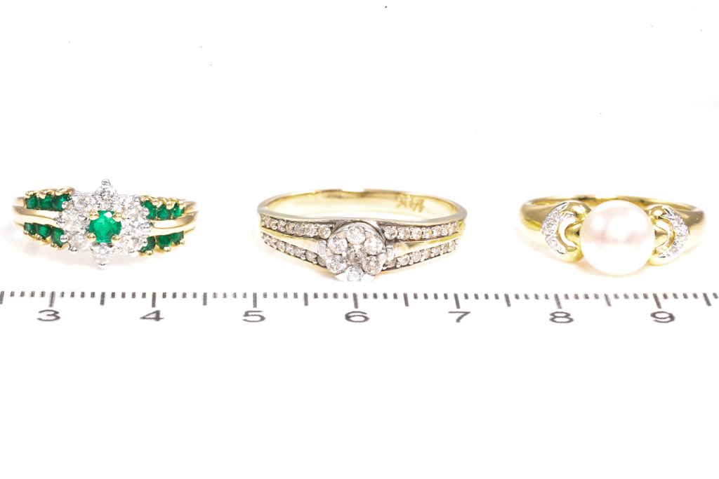 Set of three rings. An Emerald and Diamond ring with round Emeralds totalling 0.40cts & round Diamonds totalling approx. 0.32cts, 14ct yellow gold, size M, weight 3.3g. Diamond 'Daisy' ring with round Diamonds totalling approx. 0.25cts, 14ct yellow gold, size U, weight 4.1g. Pearl and Diamond ring with a cultured Pearl of 7.5mm and round Diamonds totalling approximately 0.03cts, 18ct yellow gold, size L1/2 weight 4.3g. Combined weight 11.8g.(Pre-owned)