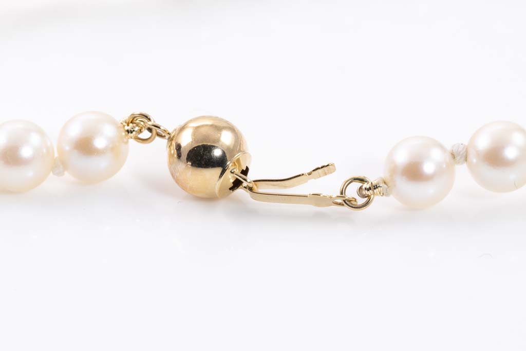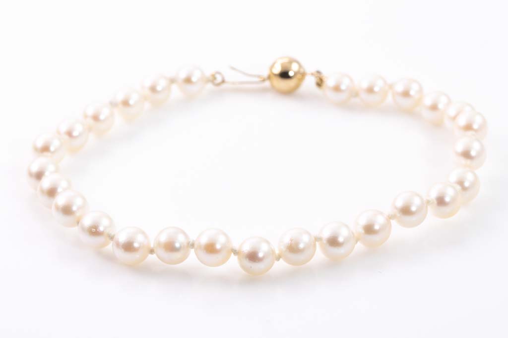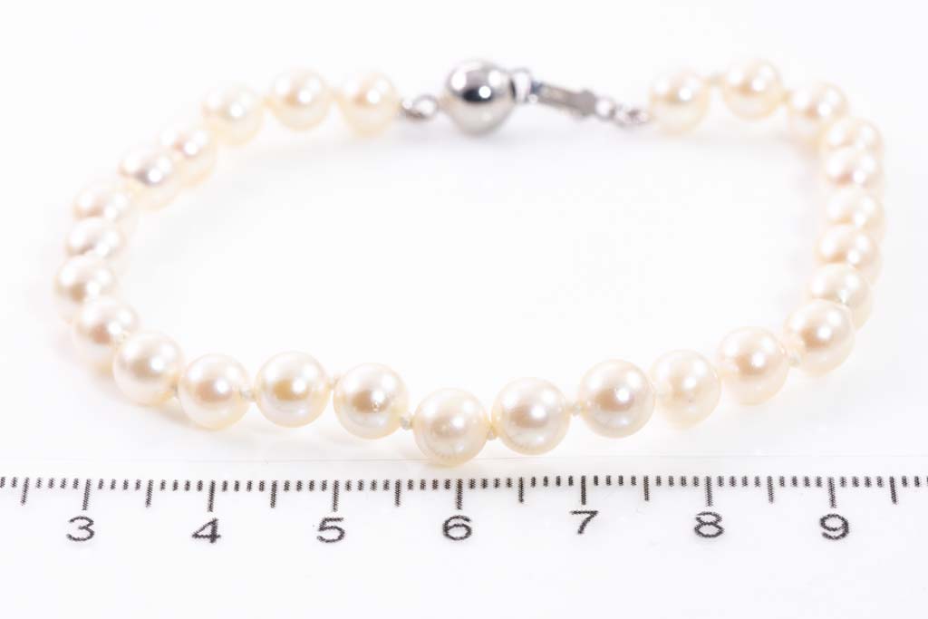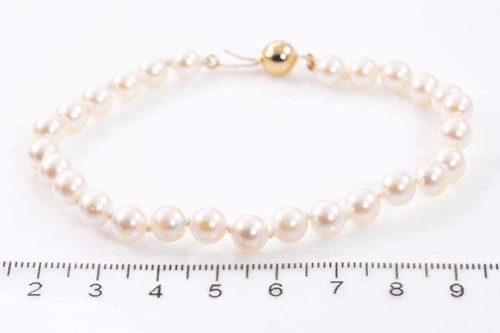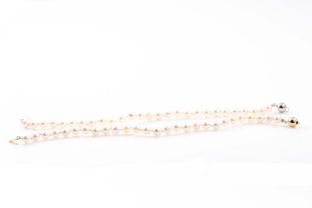 A set of 2 Akoya Pearl bracelets with Akoya of 6-6.5mm. 14ct yellow gold 7mm ball clasp and 14ct white gold 7mm ball clasp. Length: 20cm each. Weight: 9.6g and 9.9g. Total weight: 19.5 (Pre-owned)