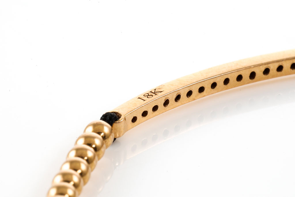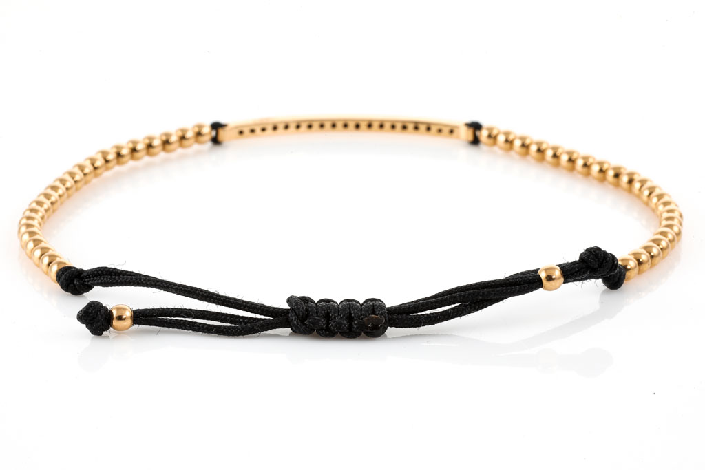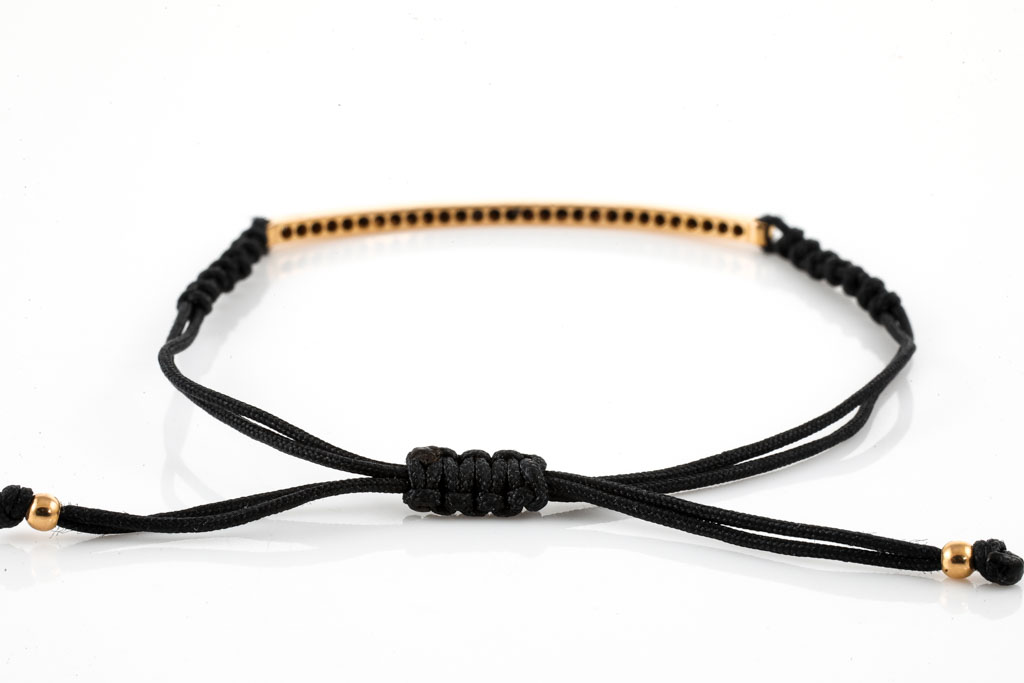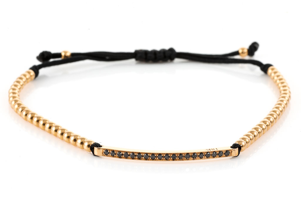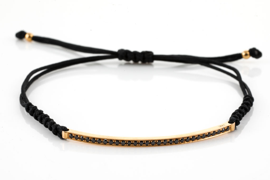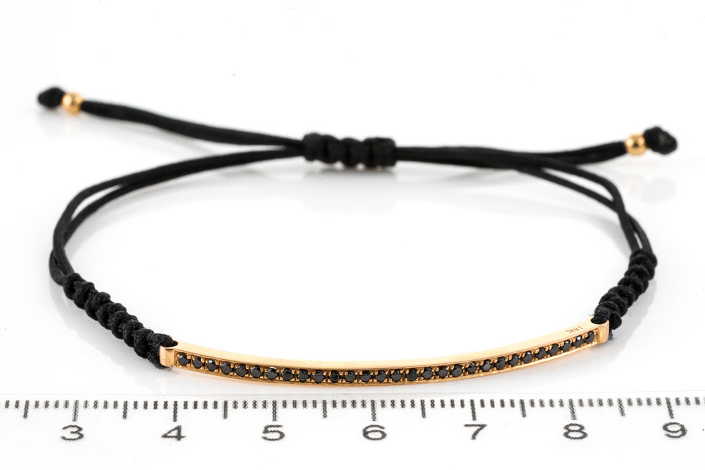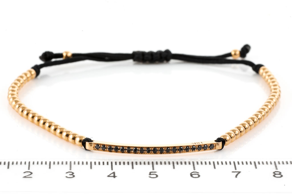 A set of 2 Diamond bracelets. A bar bracelet set with 30 round black Diamonds totalling 0.15cts. The other bar bracelet set with 19 black Diamonds totalling 0.09cts and 44 18ct rose gold beads. Both 18ct yellow gold with black cord. Adjustable max wrist size: 25cm. Total Weight: 7.1g. Note: black Diamond may be treated. (pre-owned)