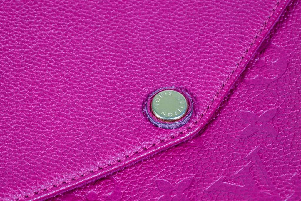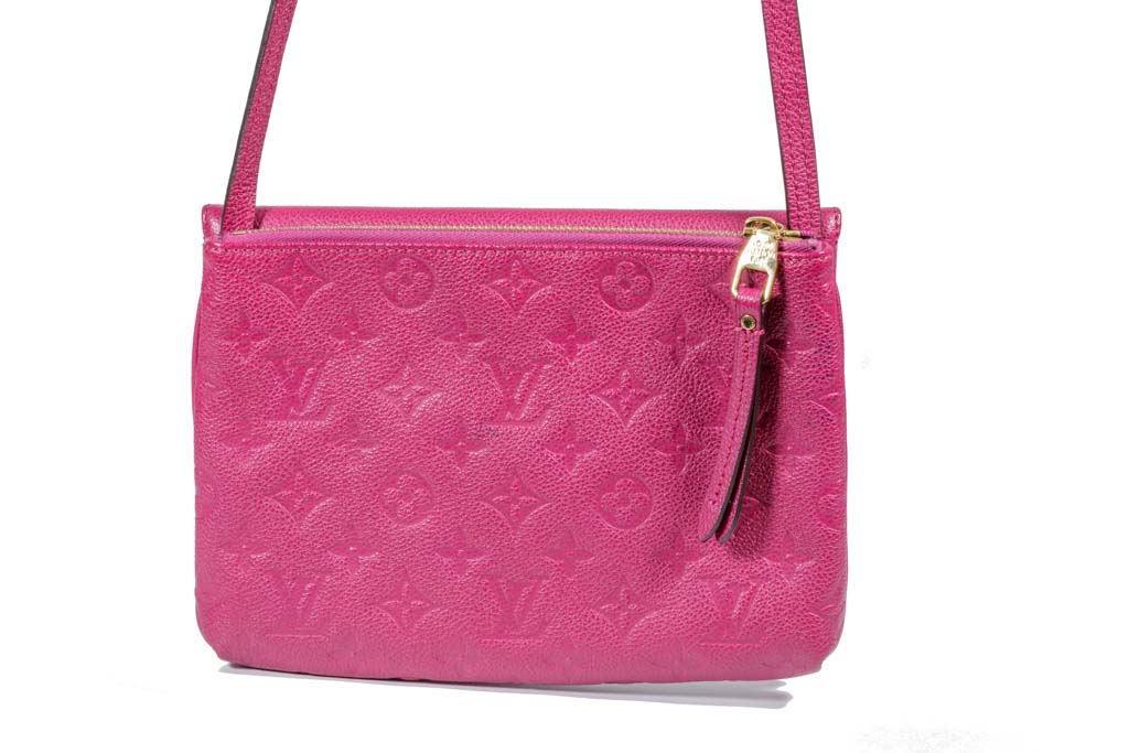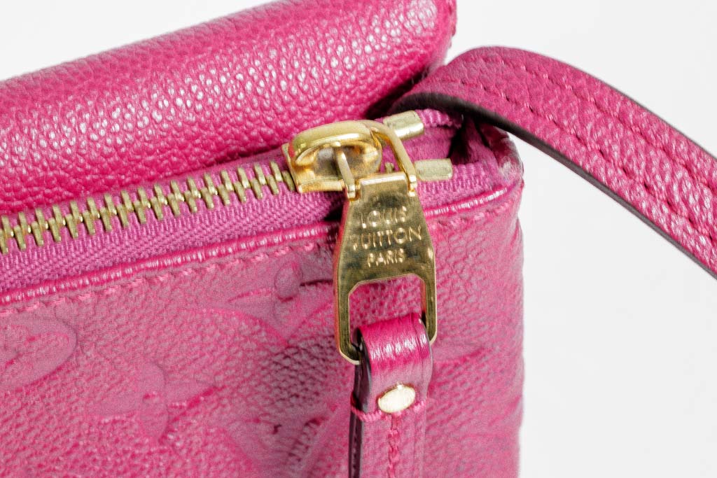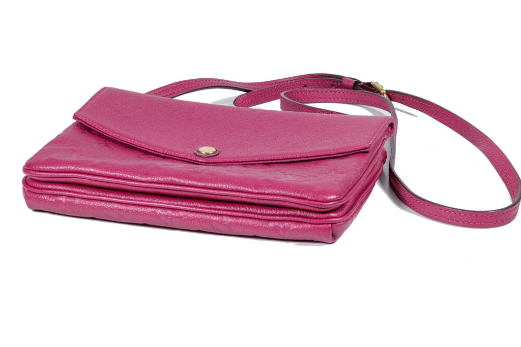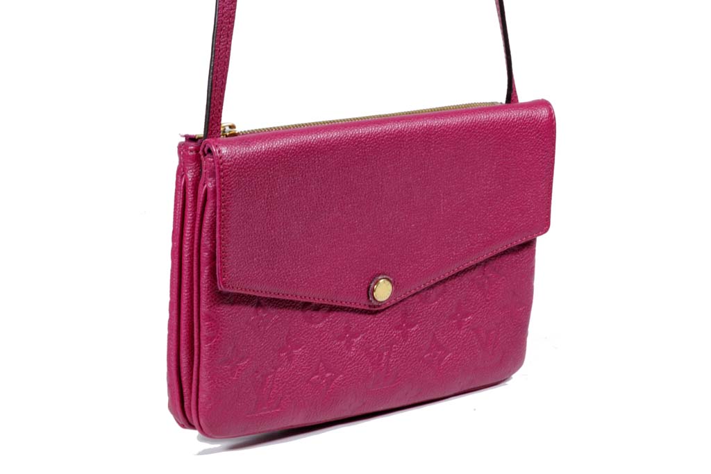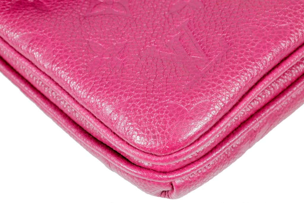 Louis Vuitton Twice Monogram Empreinte Shoulder Bag. Featuring in pink leather, gold-tone hardware, microfiber lining, flap with button closure at front, back with zipped pocket. Approximate dimensions :24cm(W) x 17cm(H) x 4cm(D), shoulder drop height: 54cm adjustable. With Entrupy certificate of authenticity. (Pre-owned)