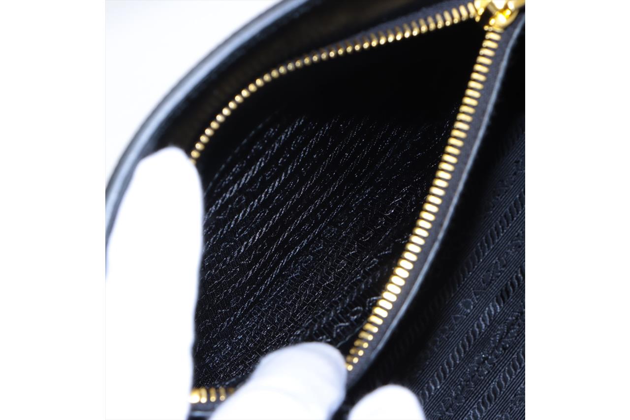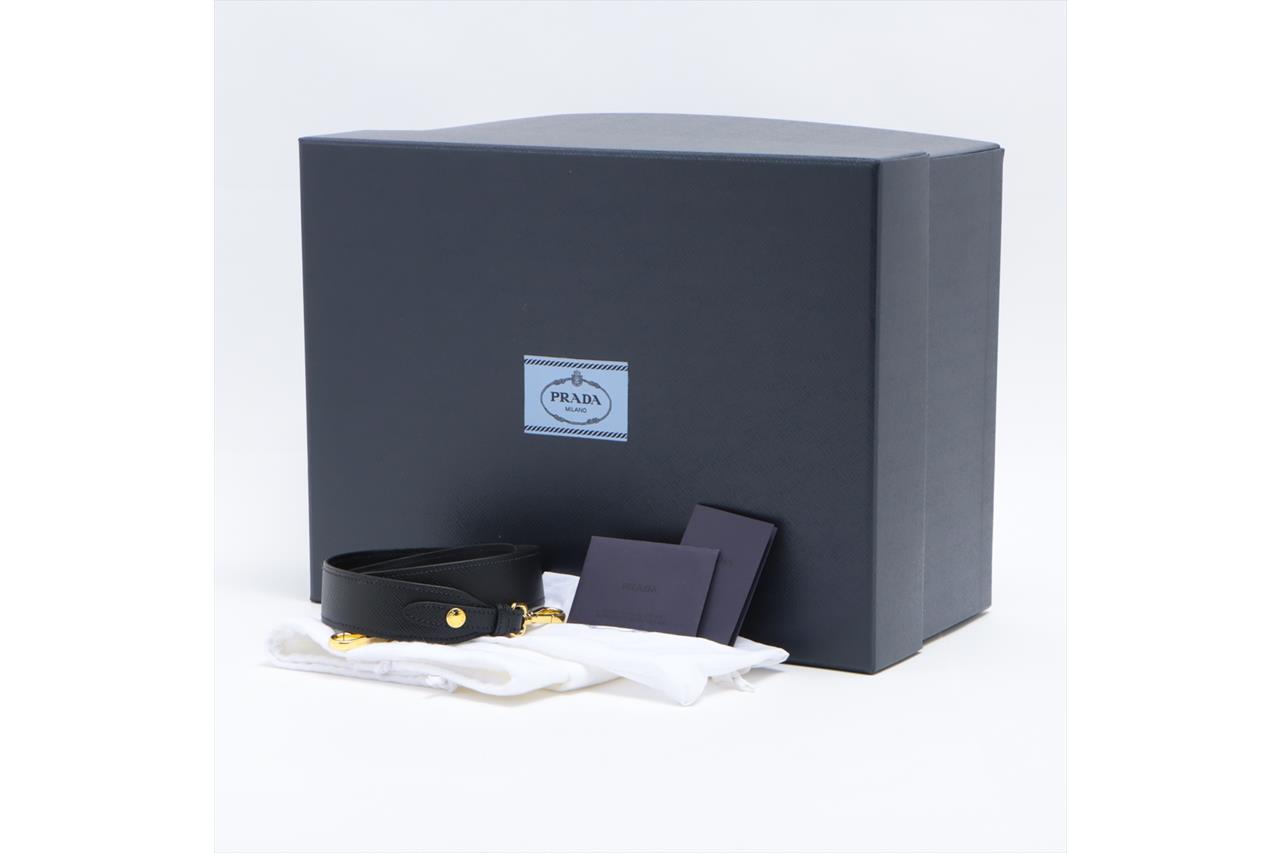 1840/ 71:Small Saffiano Leather Prada Monochrome Bag in Black Leather. Featuring gold-tone hardware, removable leather coin purse, snap closure on the sides. Approximate dimensions: 26.5cm (L) x 20.5cm (H) x 13.5cm (D), 11cm handle drop height and 42cm shoulder drop height. Accompanied by Prada certificate card, Prada box and dust bag. With Entrupy Certificate of Authenticity. (Pre-owned)