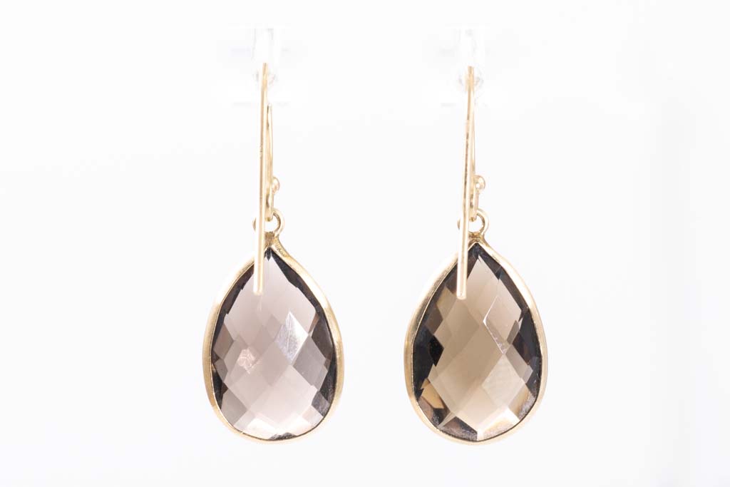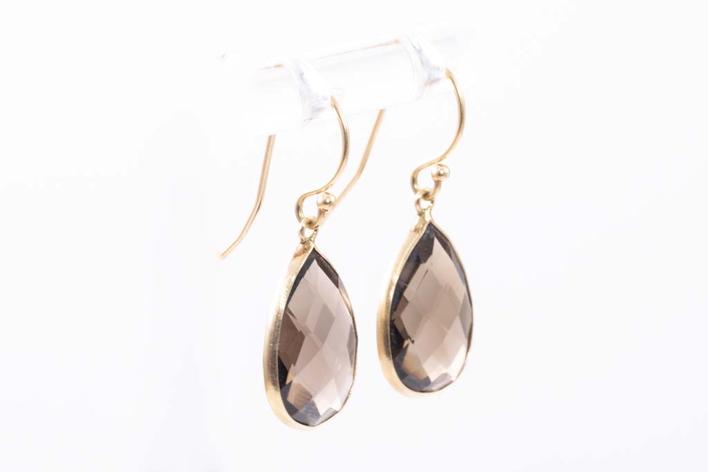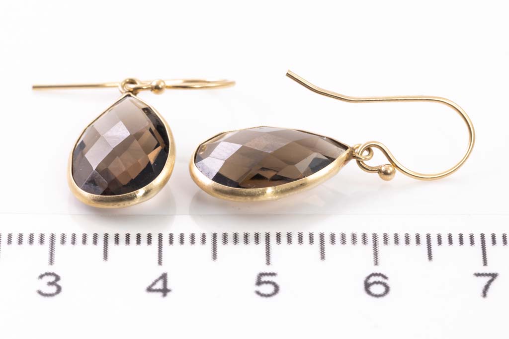 Smoky Quartz hook earrings with 2 Smoky Quartz of size approximately 13.0 x 8.8 x 5.0mm. 14ct yellow gold. Weight: 2.6g. (Pre-owned)