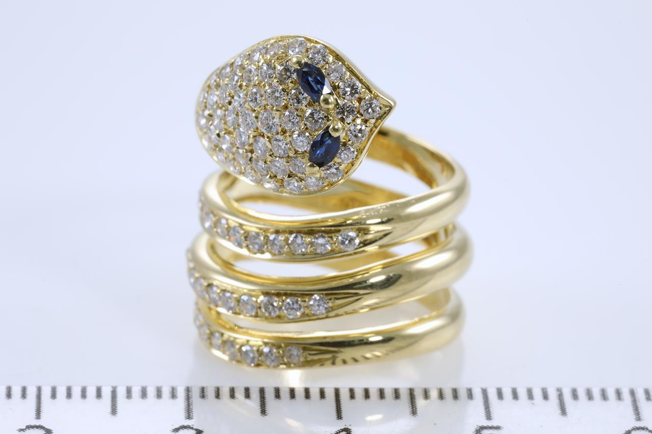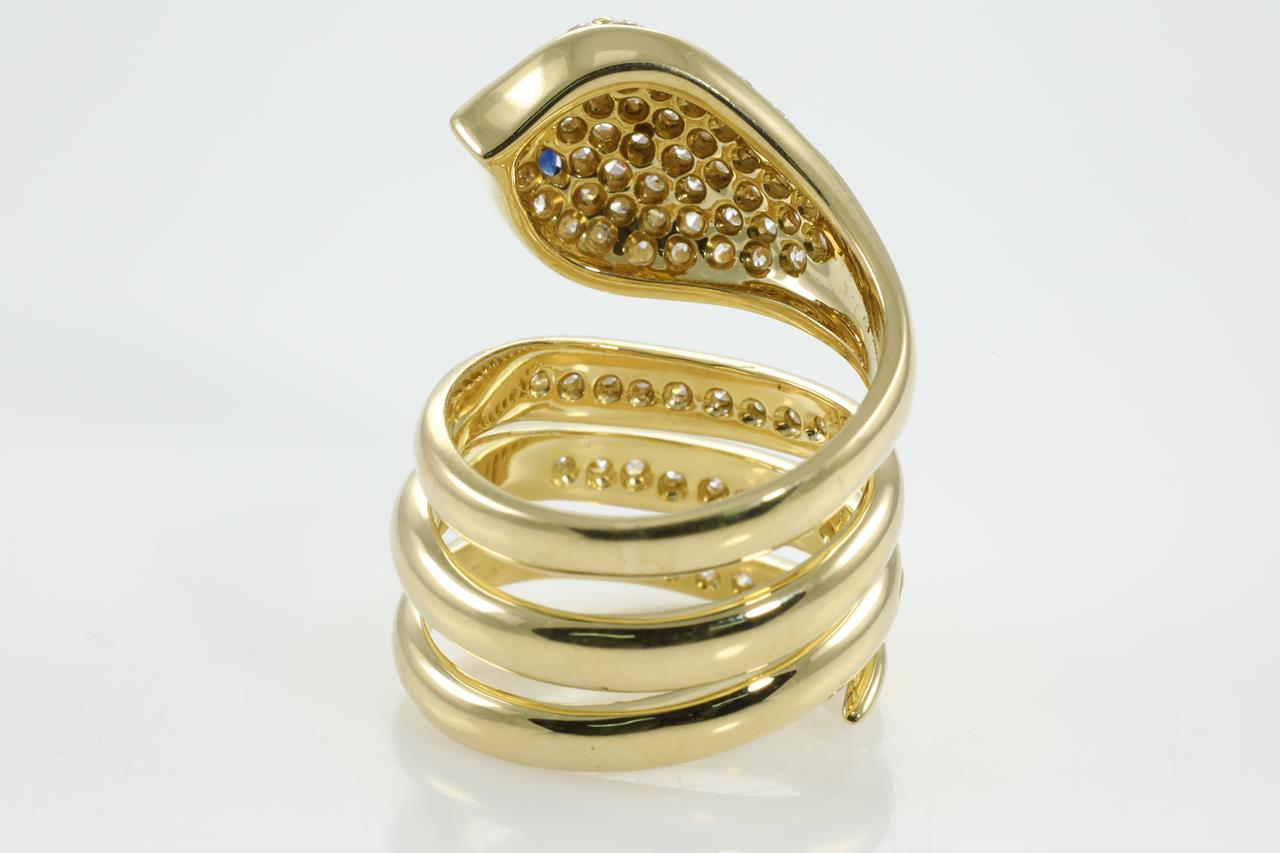 Snake design ring with Diamonds totalling 1.10cts (Estimated grading: G-H SI) and blue marquise cut Sapphires totalling 0.15cts. 18ct yellow gold. Ring size J. Weight: 12.4g (Pre-owned)
