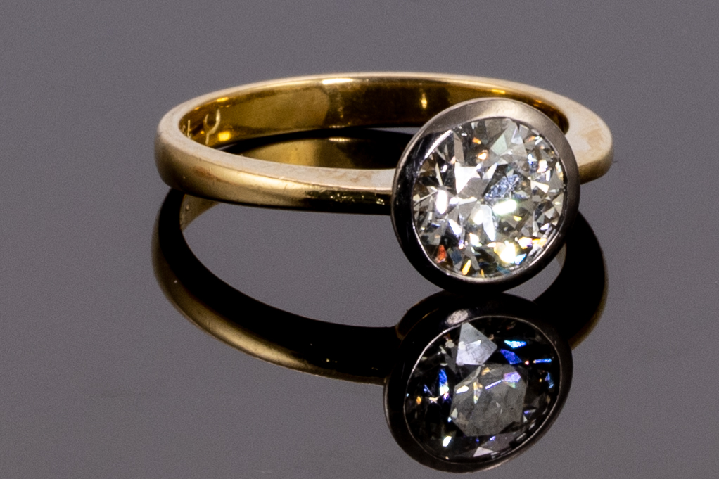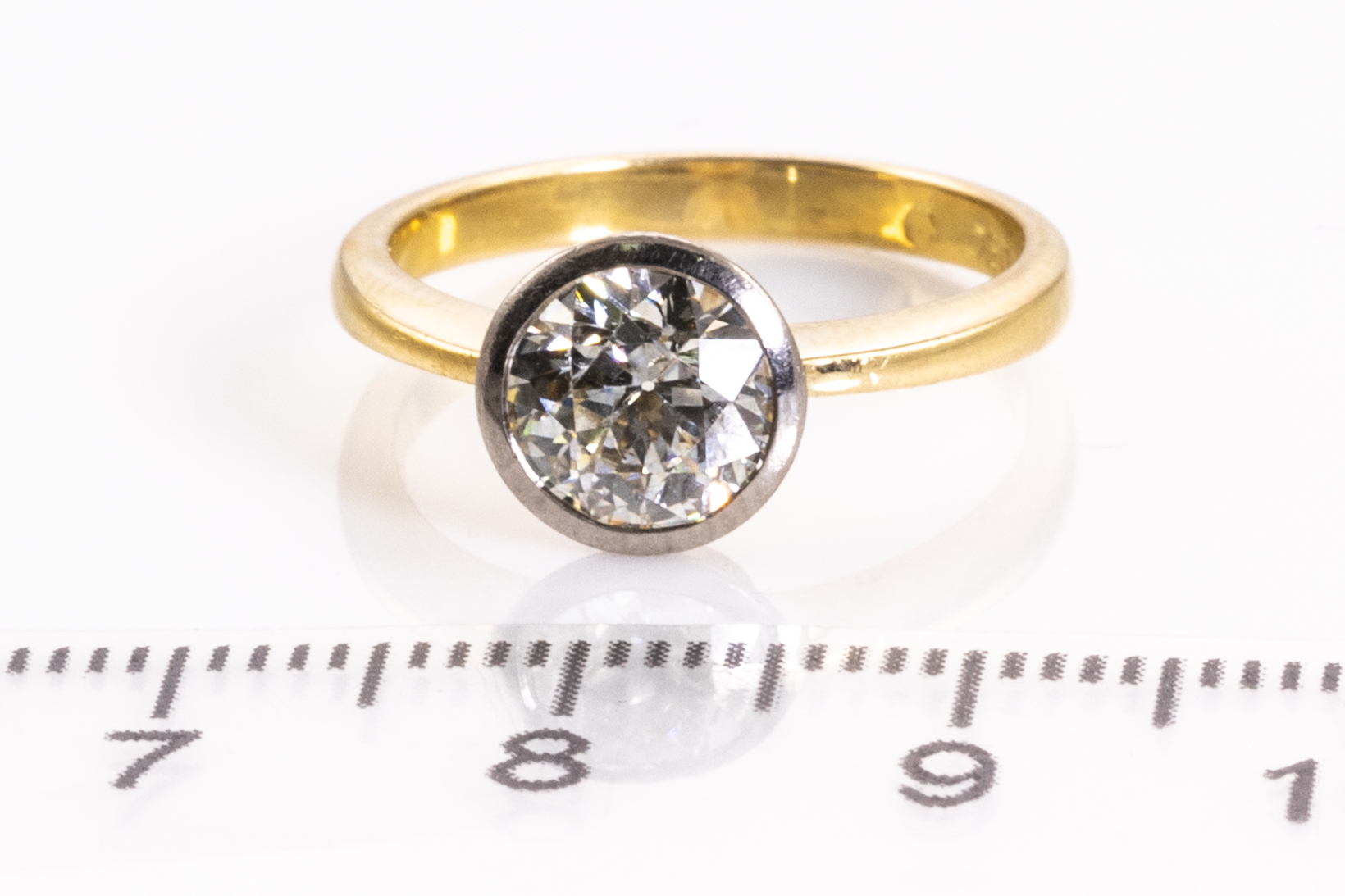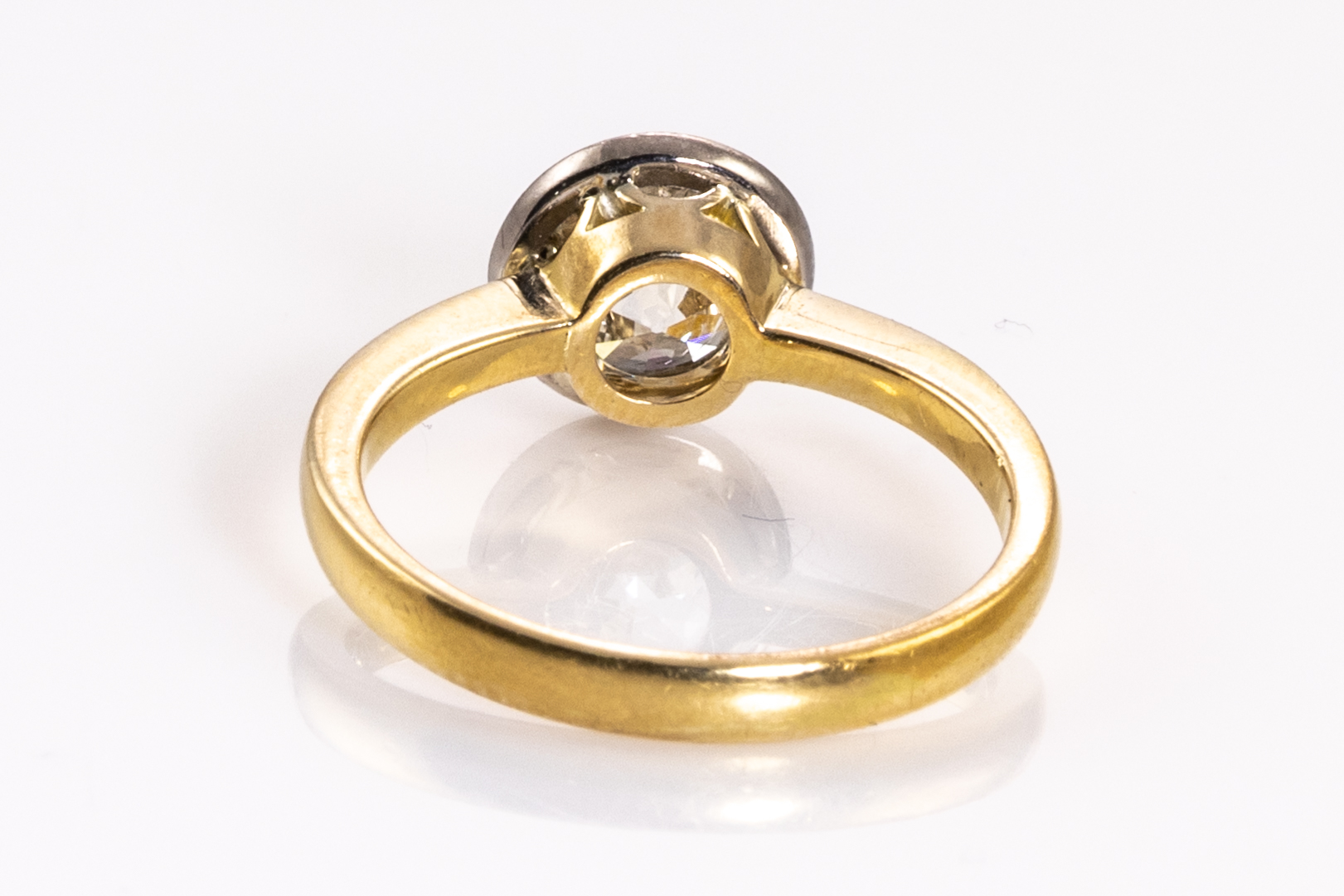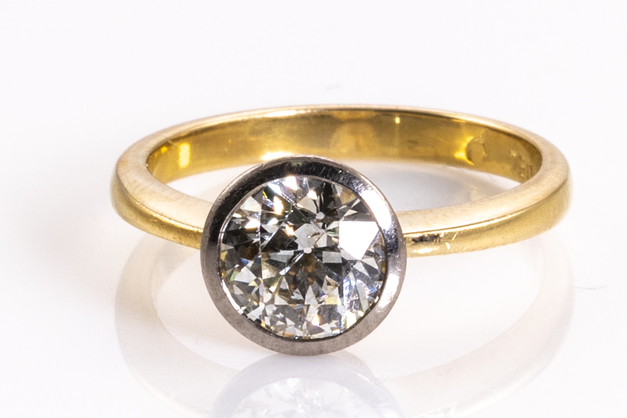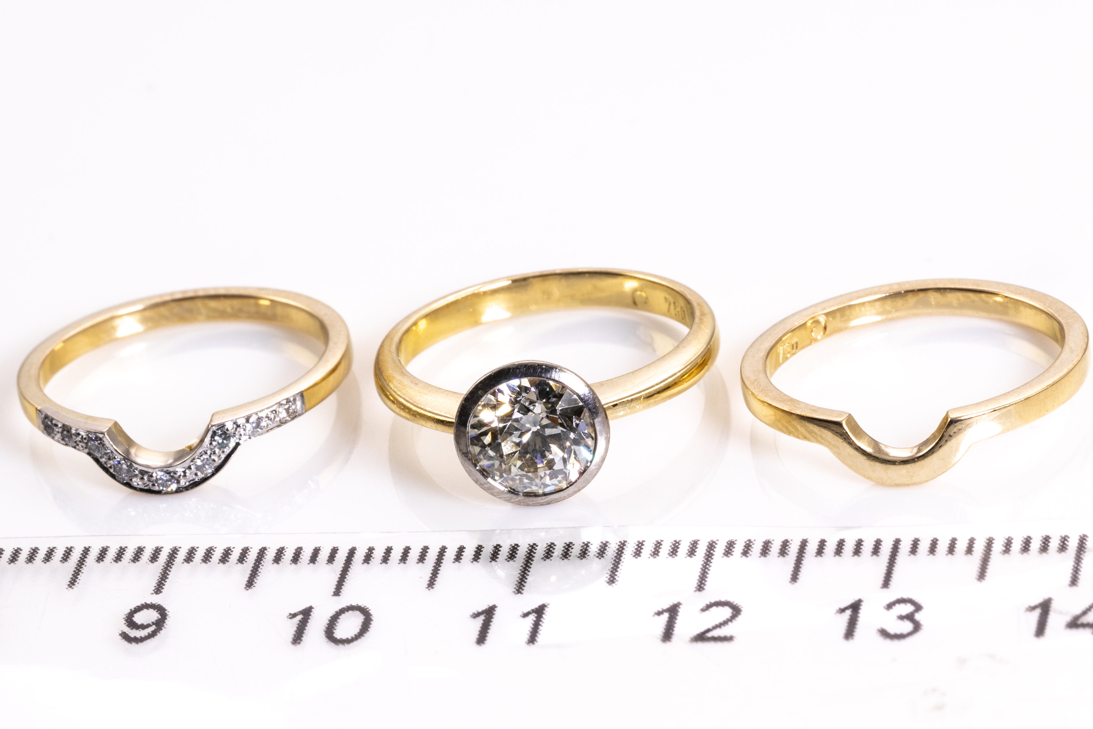 1843. PAGE 1. A Solitaire Diamond ring with round cut Diamond of approximately 1.25ct (Estimated grading: K SI2) with two fitted wedding rings one with Diamonds totalling approximately 0.09cts. 18ct yellow gold. Ring size K 1/2. Weight 7.6g. (Pre-owned)