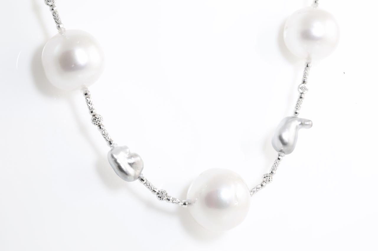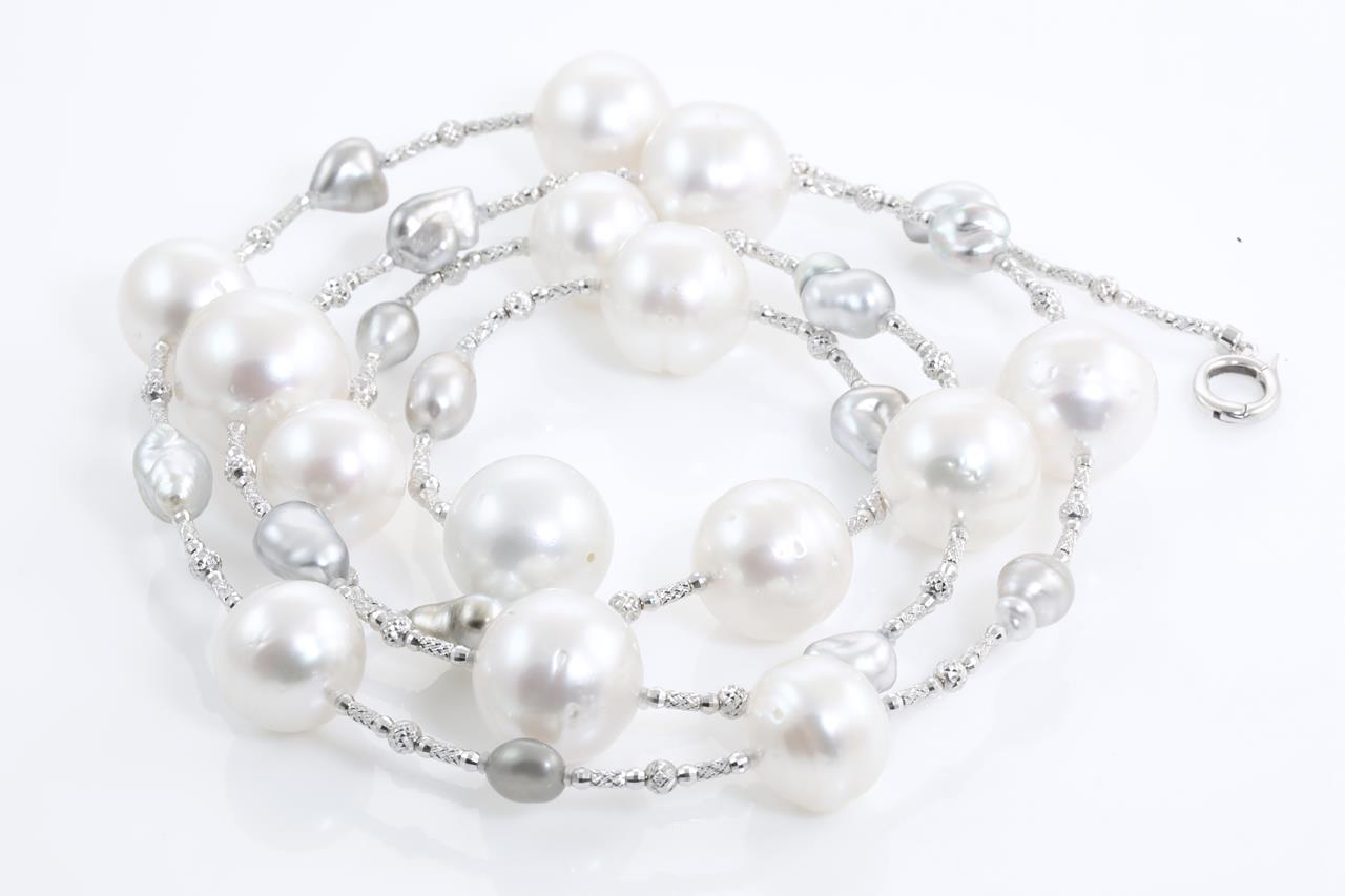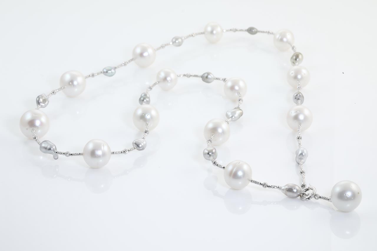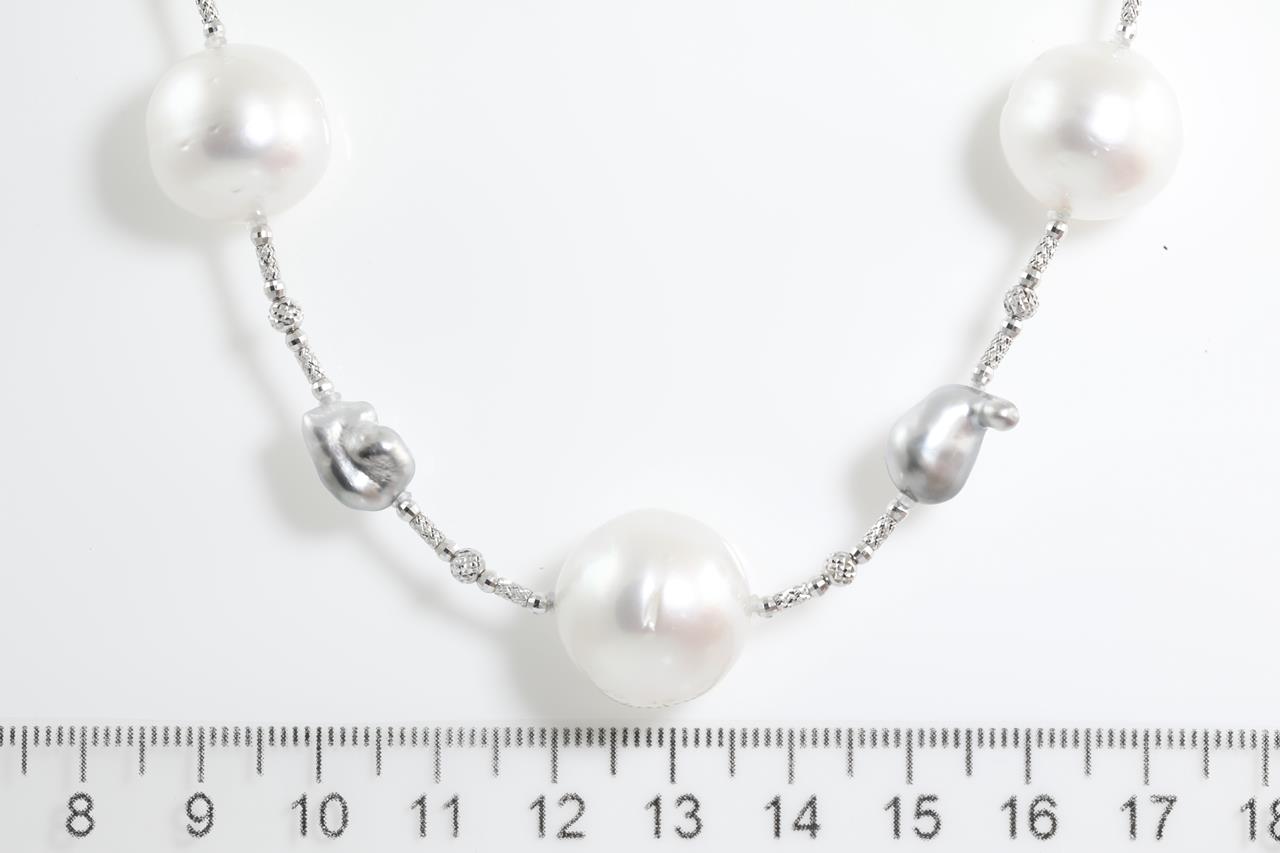 Pearl Lariat with 13 graduated South Sea Pearls of 16.5mm-12.8mm and 14 Baroque Tahitian pearls separated by beads. 18ct white gold with beads. Length: 81cm. Weight: 74.7g (Pre-owned)