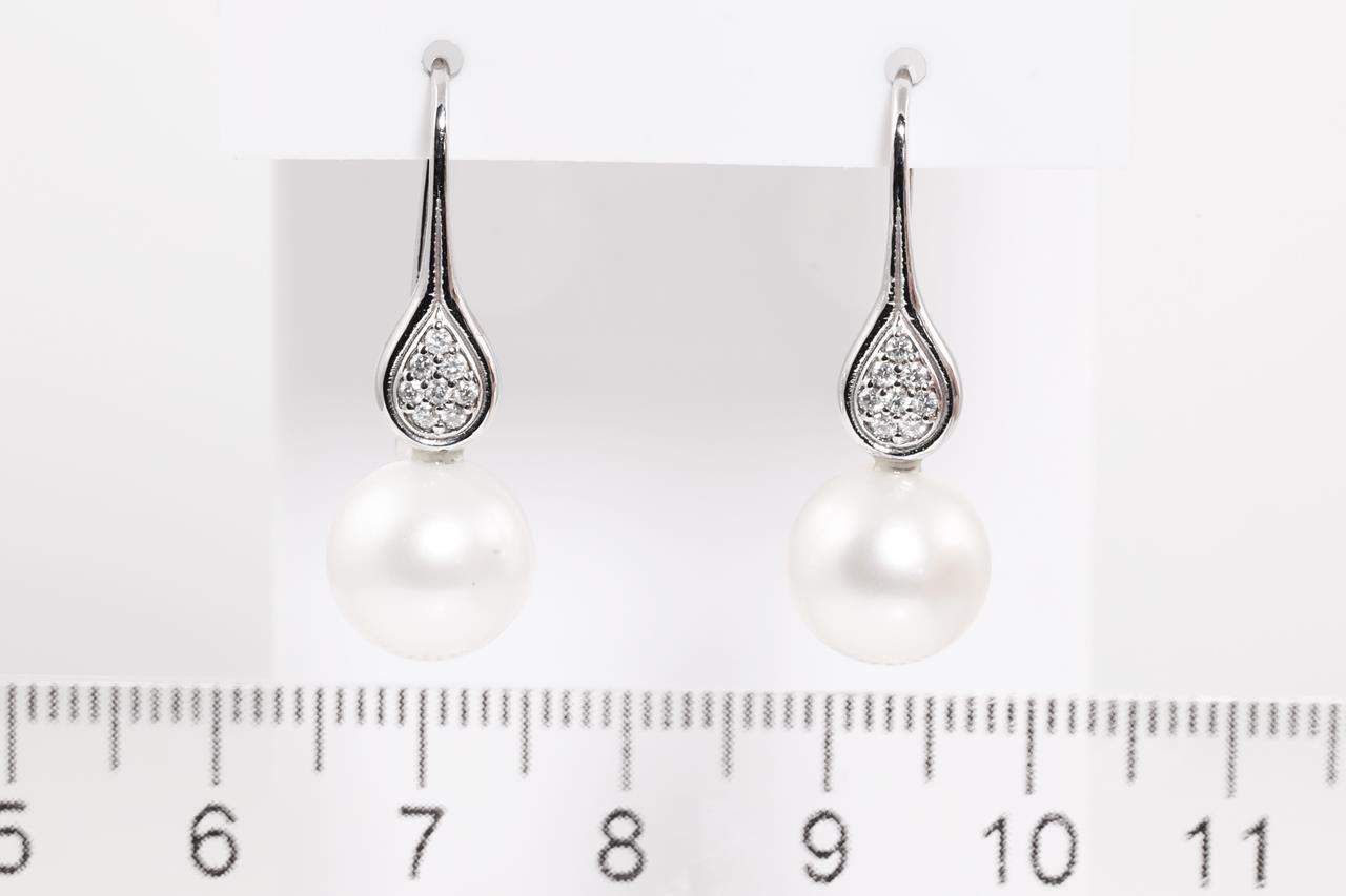 Pearl and Diamond earrings with South Sea Pearls of 10.0mm and round Diamonds totalling 0.18cts. 18ct white gold. Weight 5.1g. (As New)