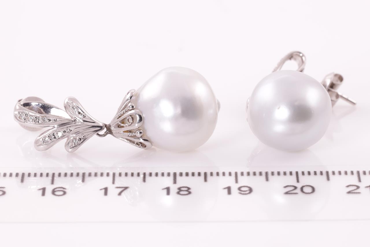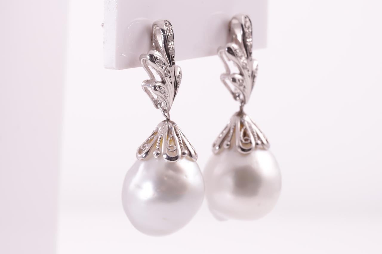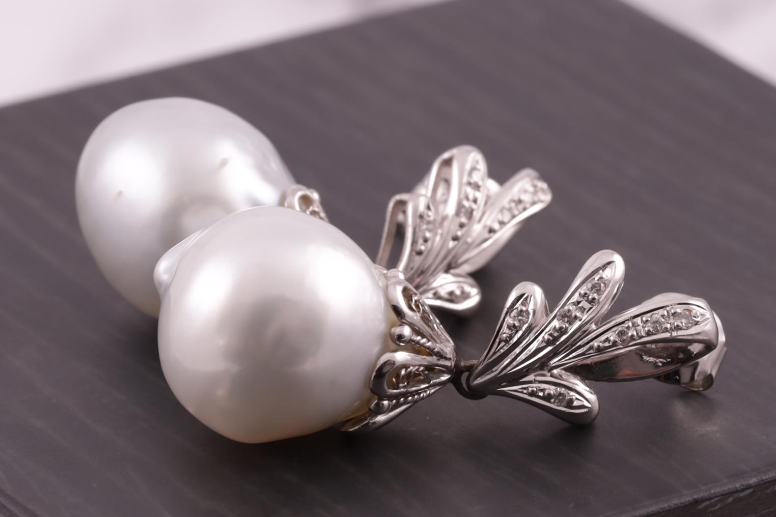 South Sea Pearl and Diamond Earrings with drop shape silver colour South Sea Pearls of 13.7mm (note pearls are of different shape) and Diamonds totalling 0.10cts. Platinum. Weight: 13.6g (Pre-owned)