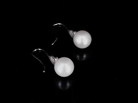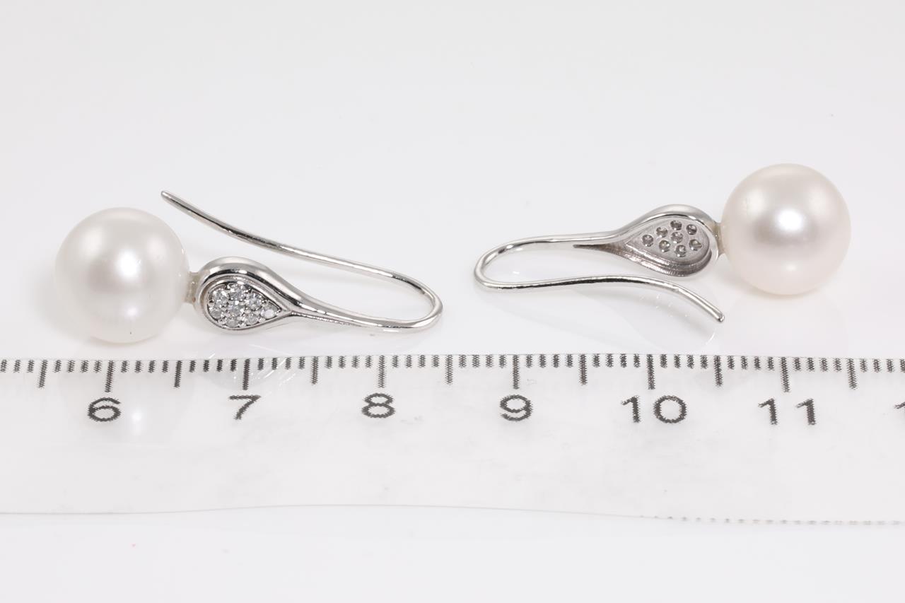 Pearl and Diamond shepherd hook earrings with South Sea Pearls of 10.0mm and round Diamonds totalling 0.18cts. 18ct white gold. Weight 5.1g. (As New)