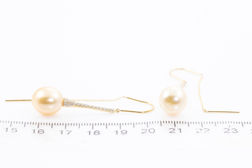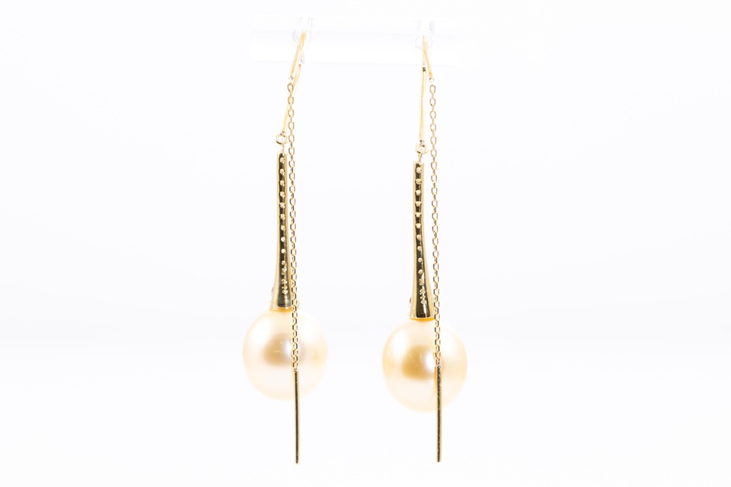 Pearl and Diamond shepherd hook earrings with Golden South Sea Pearls of 10.7mm and round Diamonds totalling 0.30cts (Estimated grading: I-J SI-P1). 18ct yellow gold. Weight: 6.4g. (Pre-owned)