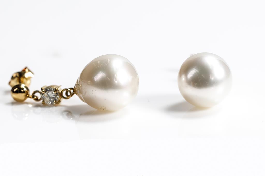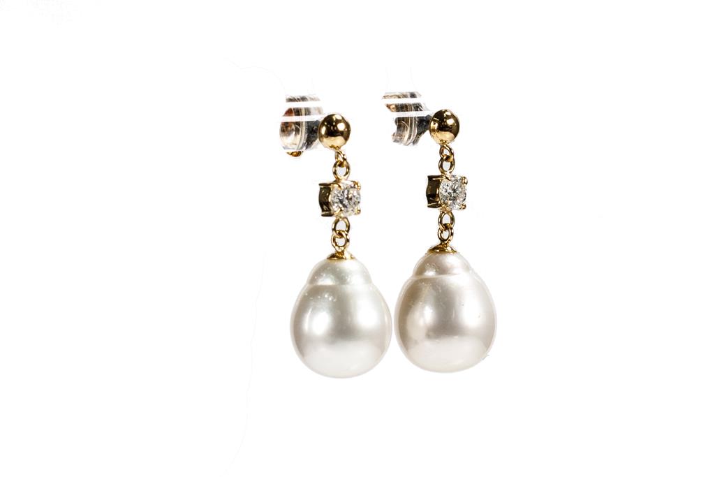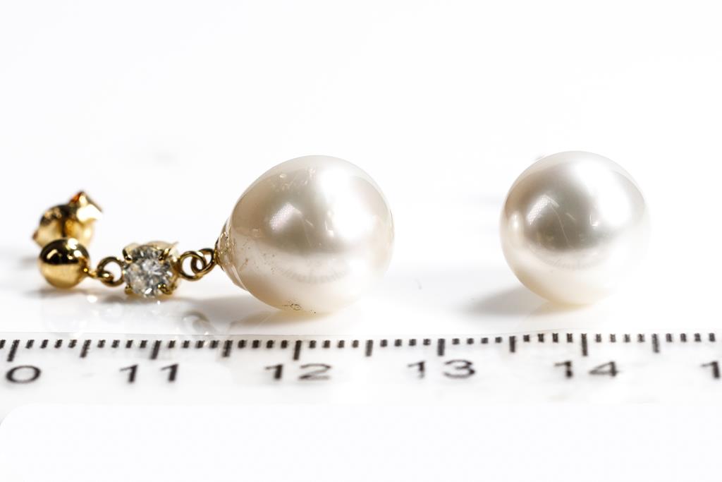 Pearl and Diamond earrings with drop shape South Sea Pearls of 11mm and 2 round Diamonds totalling 0.43cts (Estimated grading: G-H P1). 18ct yellow gold with 18ct yellow gold backs. Weight: 5.9g. (Pre-owned)