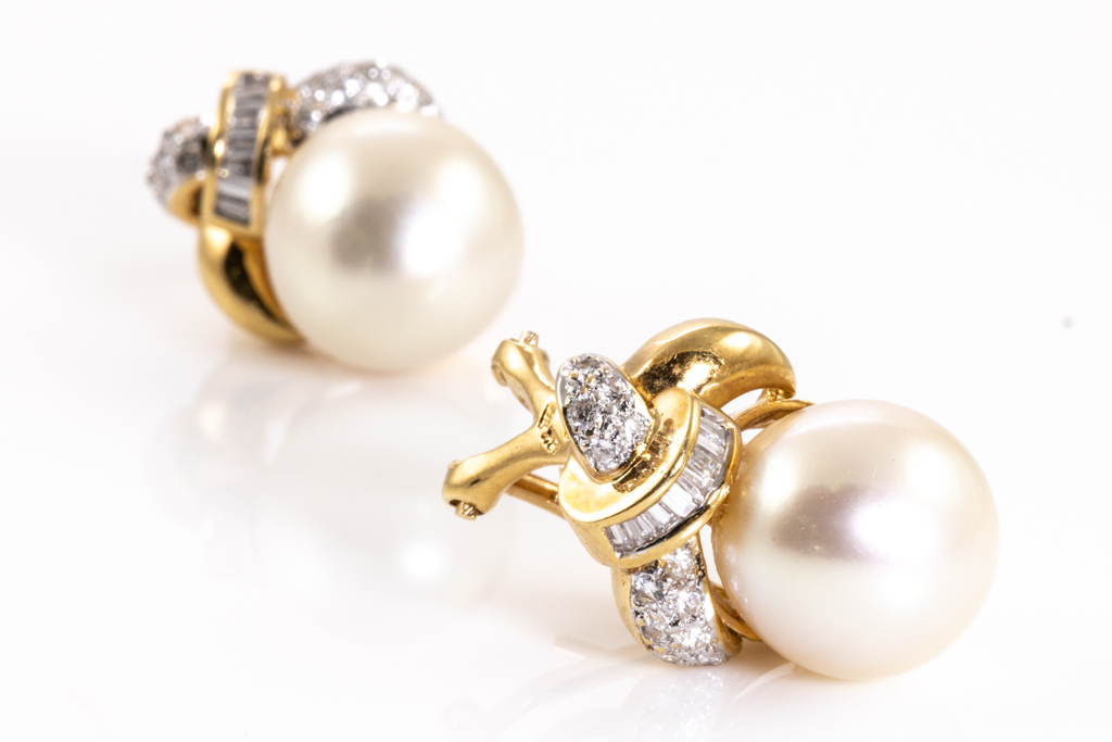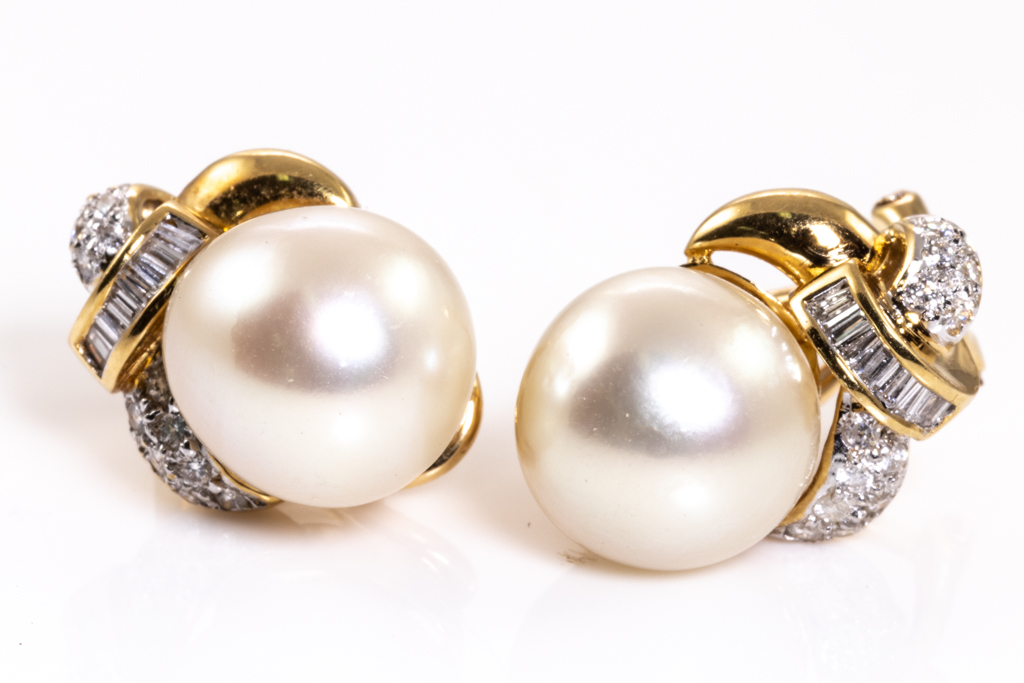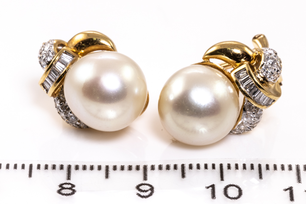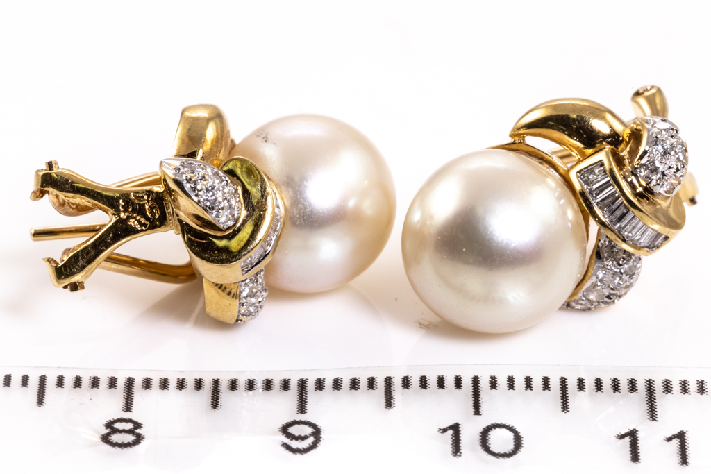 Pearl and Diamond Clip-on earrings (for pierced ears) with round South Sea pearls of 10.6mm - 11.2mm and round and baguette cut Diamonds totalling 0.42cts (Estimated grading: H SI-P1). 18ct yellow gold. Weight: 10.2g. (Pre-owned)