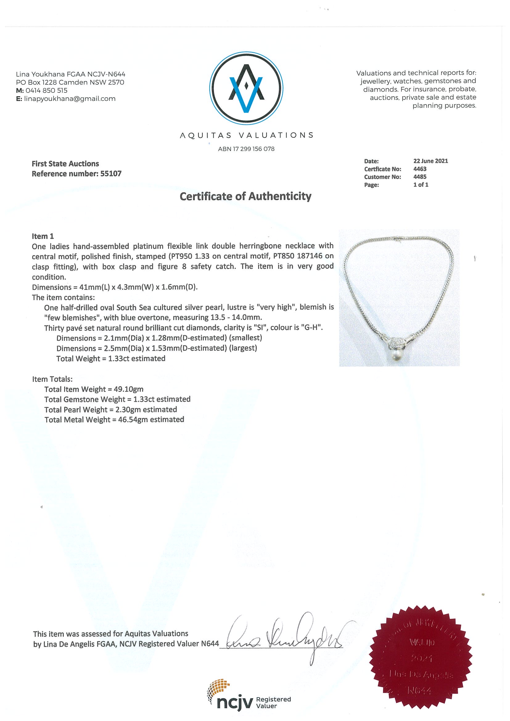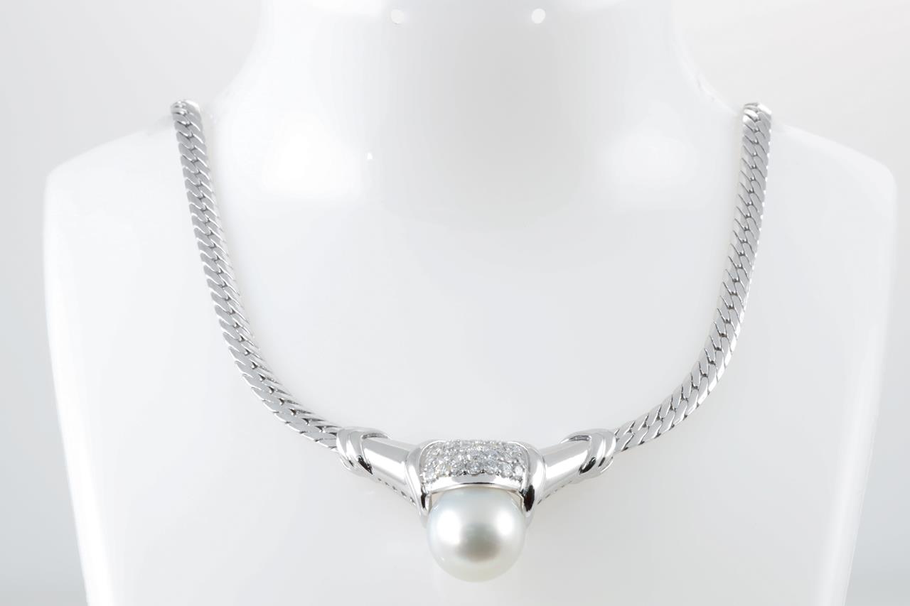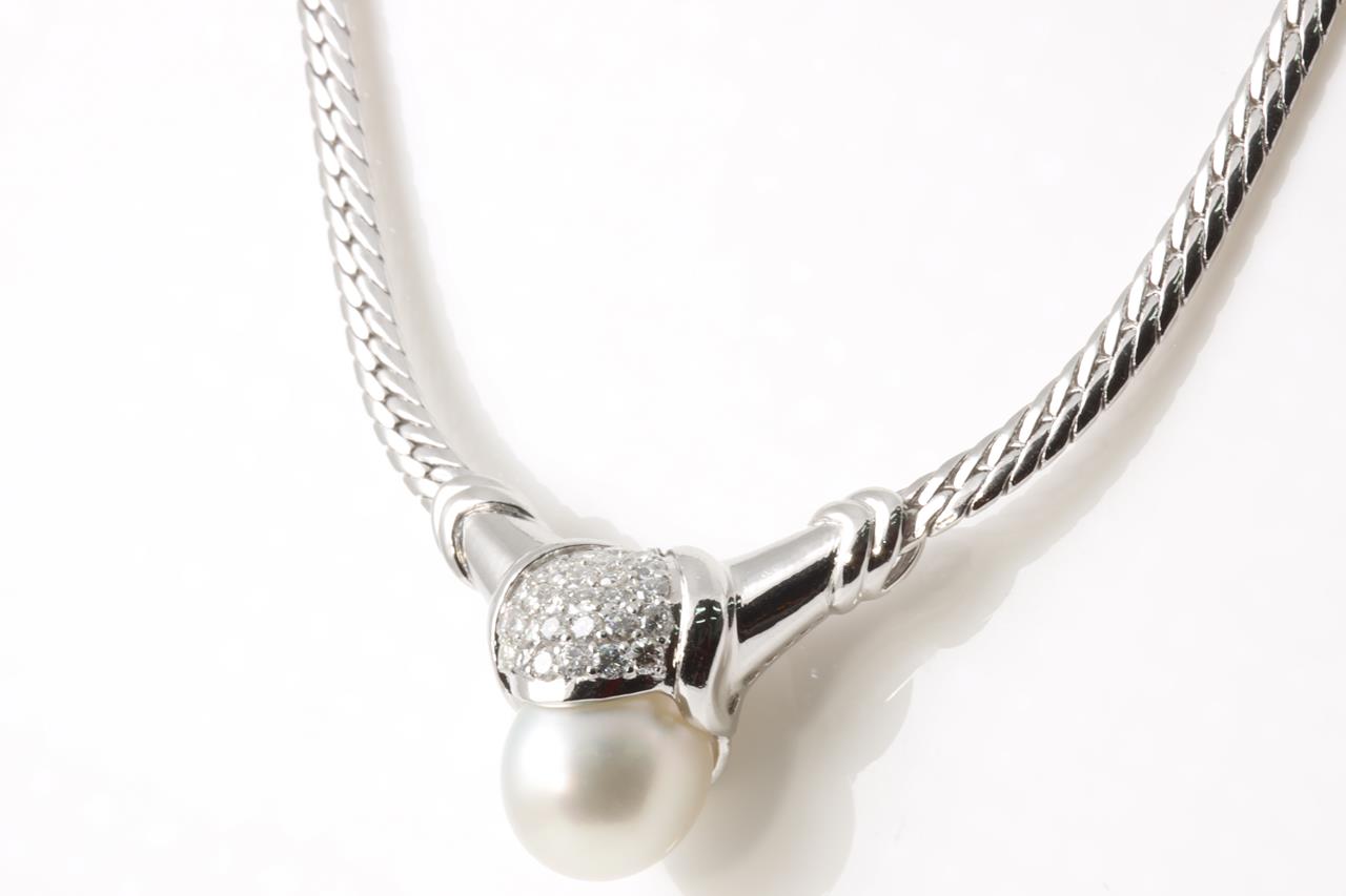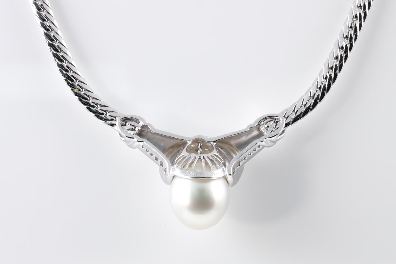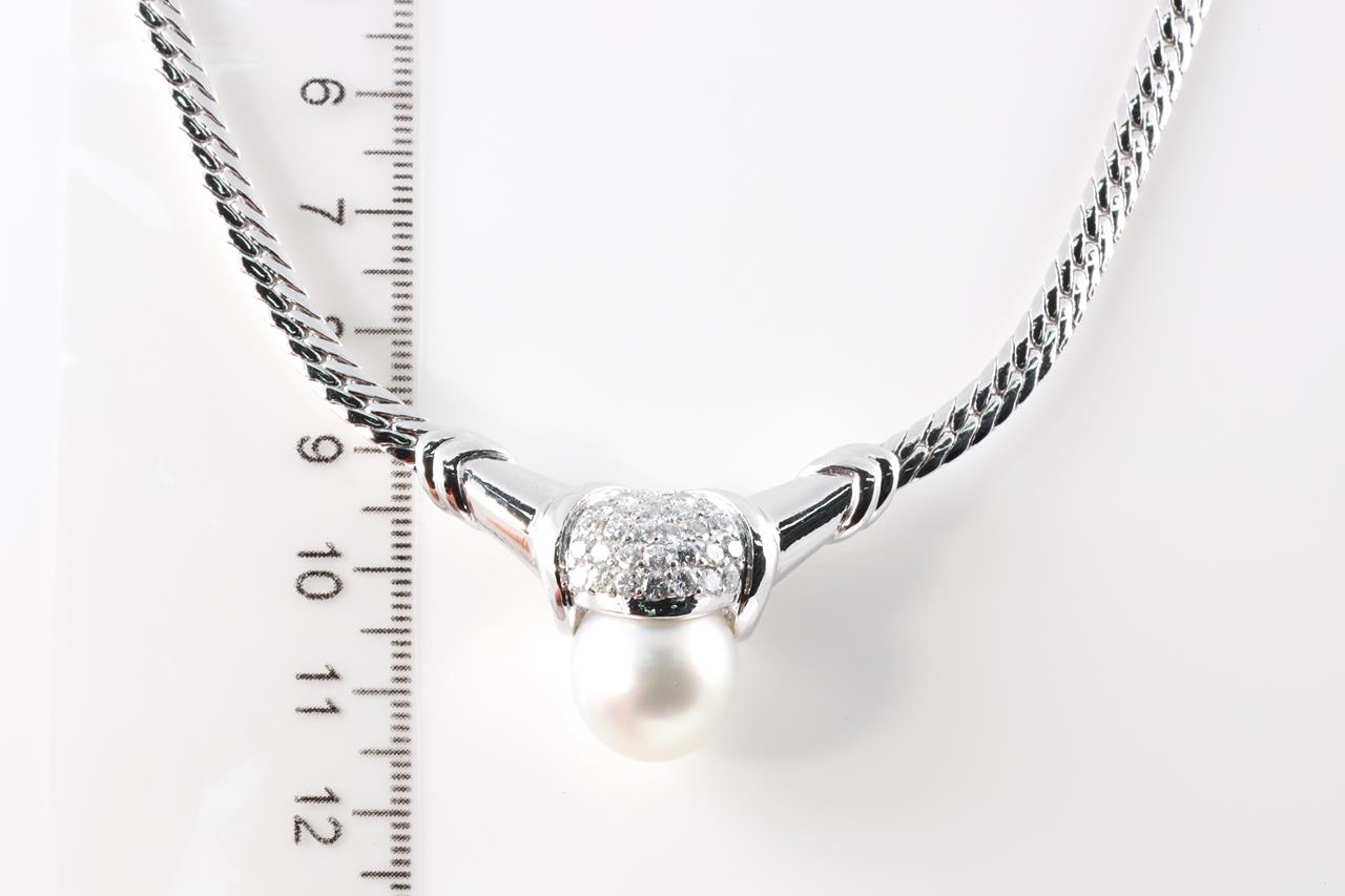Pearl and Diamond necklace with a South Sea Pearl of 13.5mm-14mm and Diamonds totalling 1.33cts (Estimated grading: G-H SI). Platinum with attached chain. Length: 41cm. Weight: 49.1g. With certificate #4463. (Pre-owned)