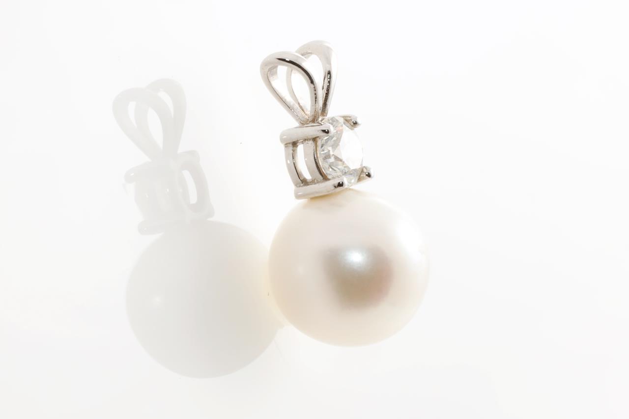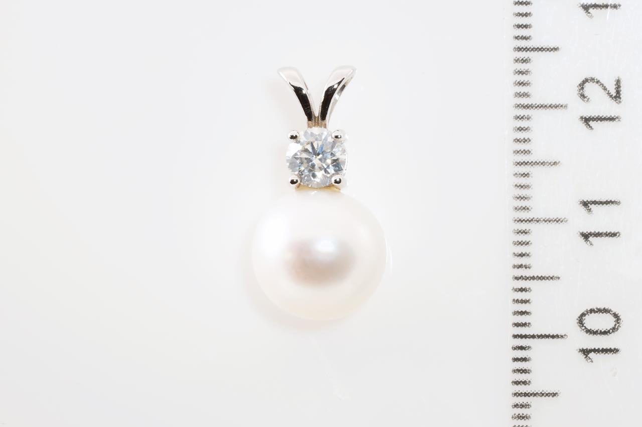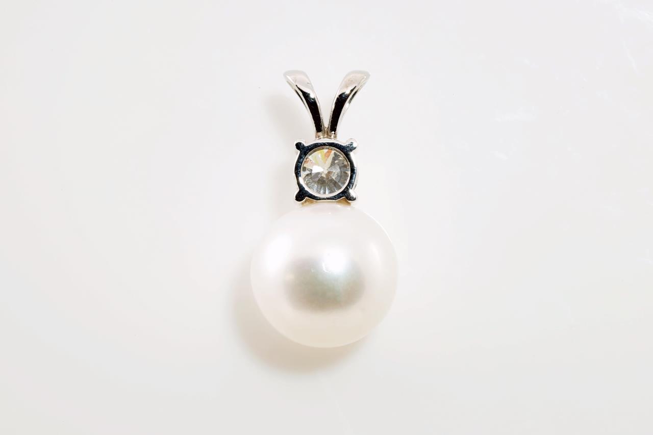 Pearl and Diamond pendant with a South Sea Pearl of 11.4mm and a round Diamond of 0.58ct (Estimated grading: I P1). 18ct white gold. No chain provided. Weight: 3.1g. (As new)