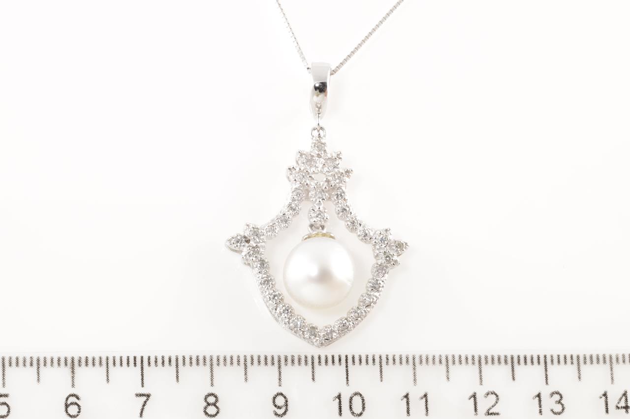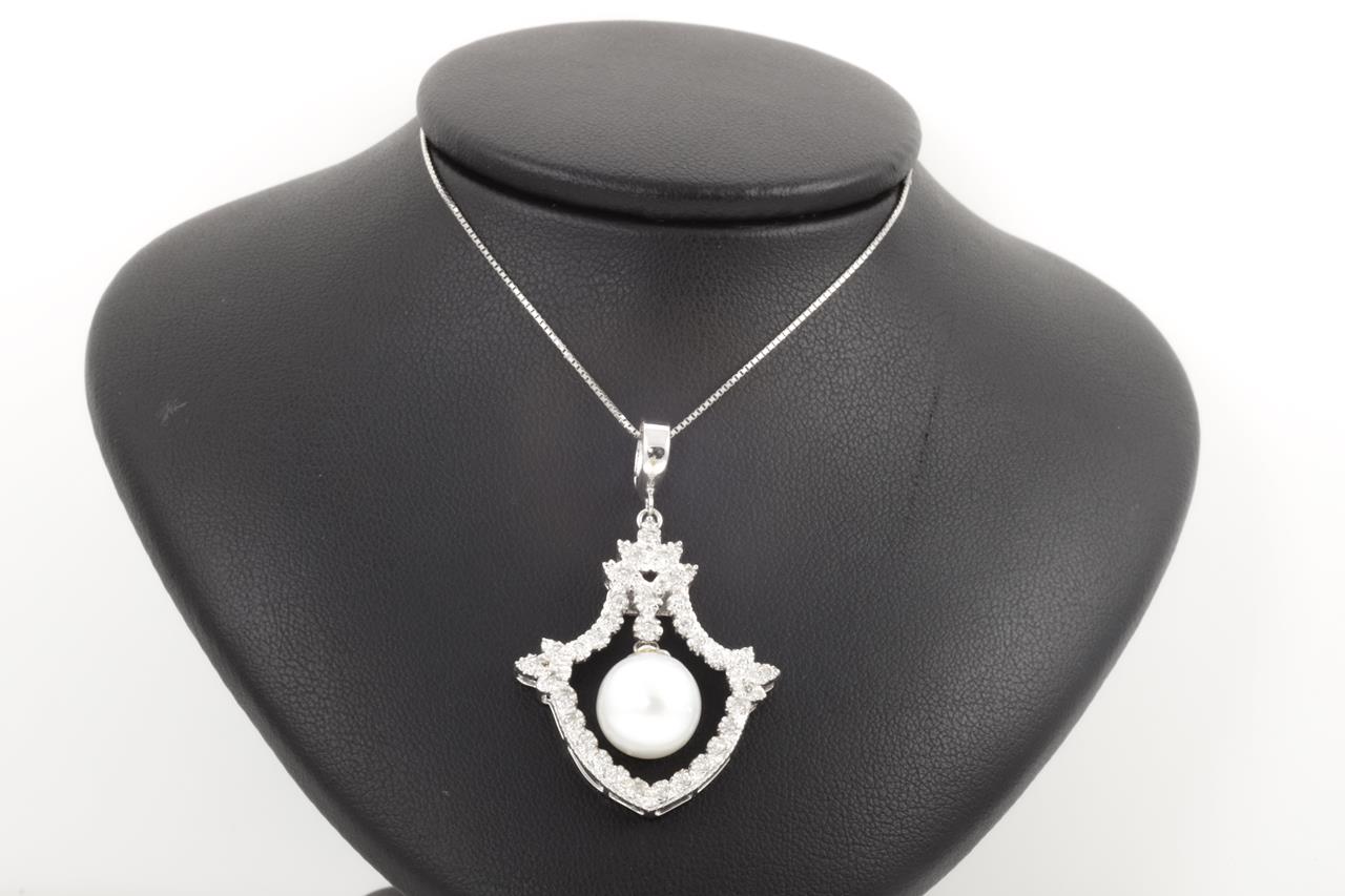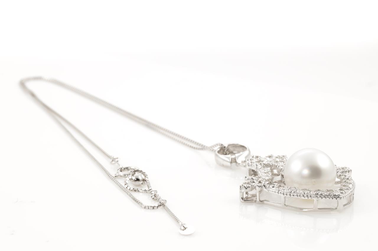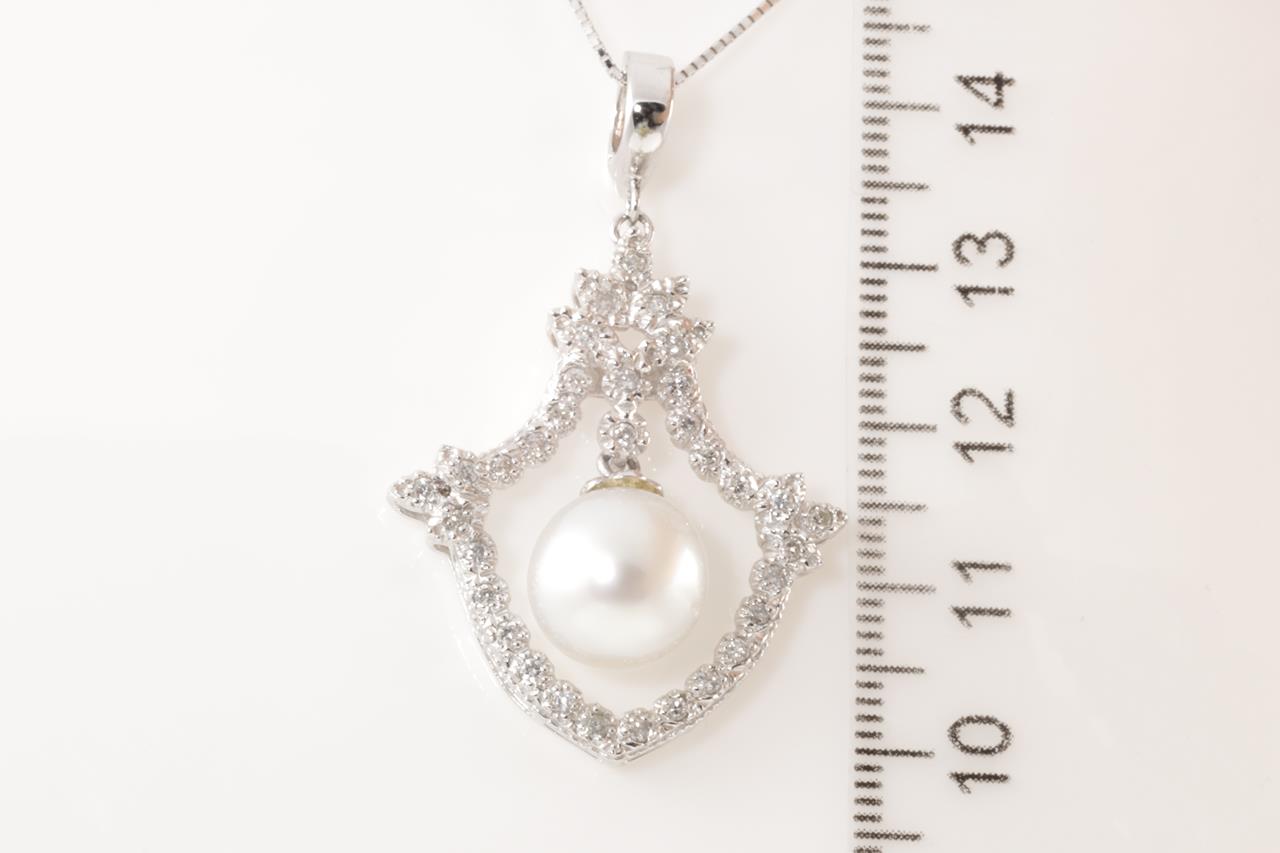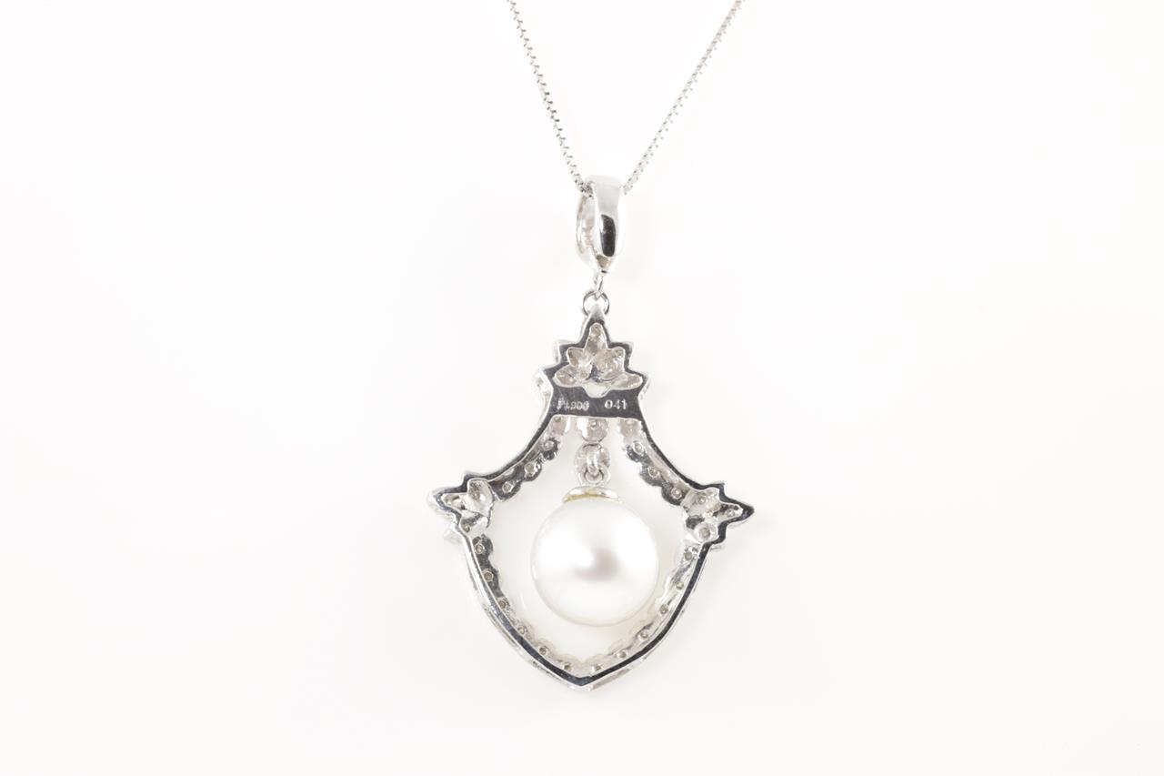 Pearl and Diamond pendant with a South Sea Pearl of 10.5mm and Diamonds totalling 0.41cts (Estimated grading: H SI-P1). Platinum with 18ct white gold 44cm adjustable. Weight: 10g (Pre-owned)
