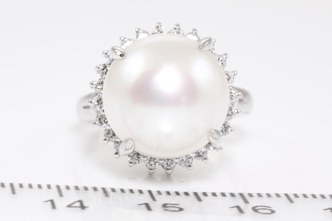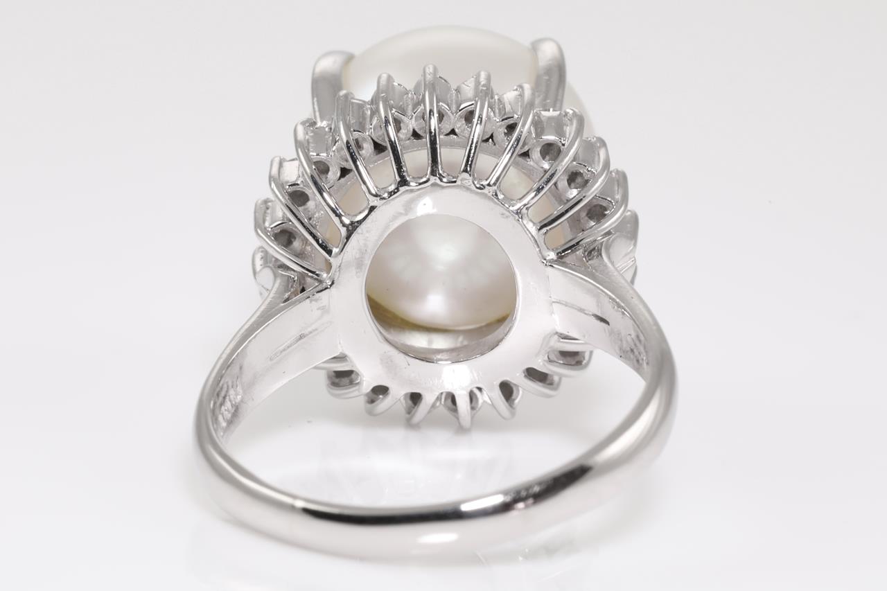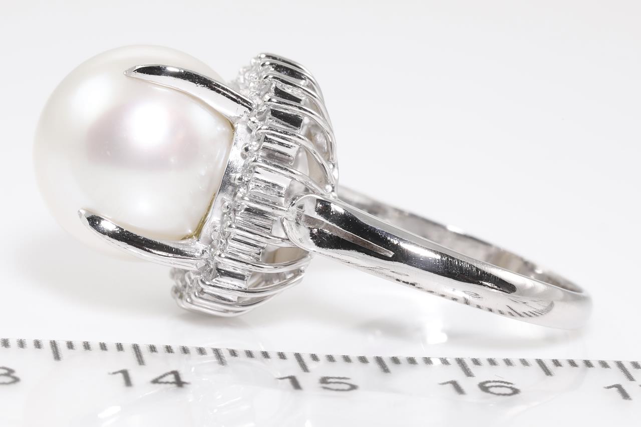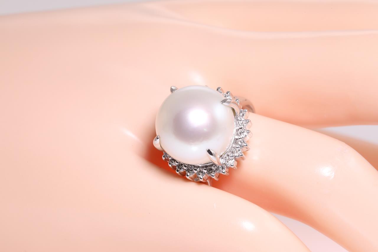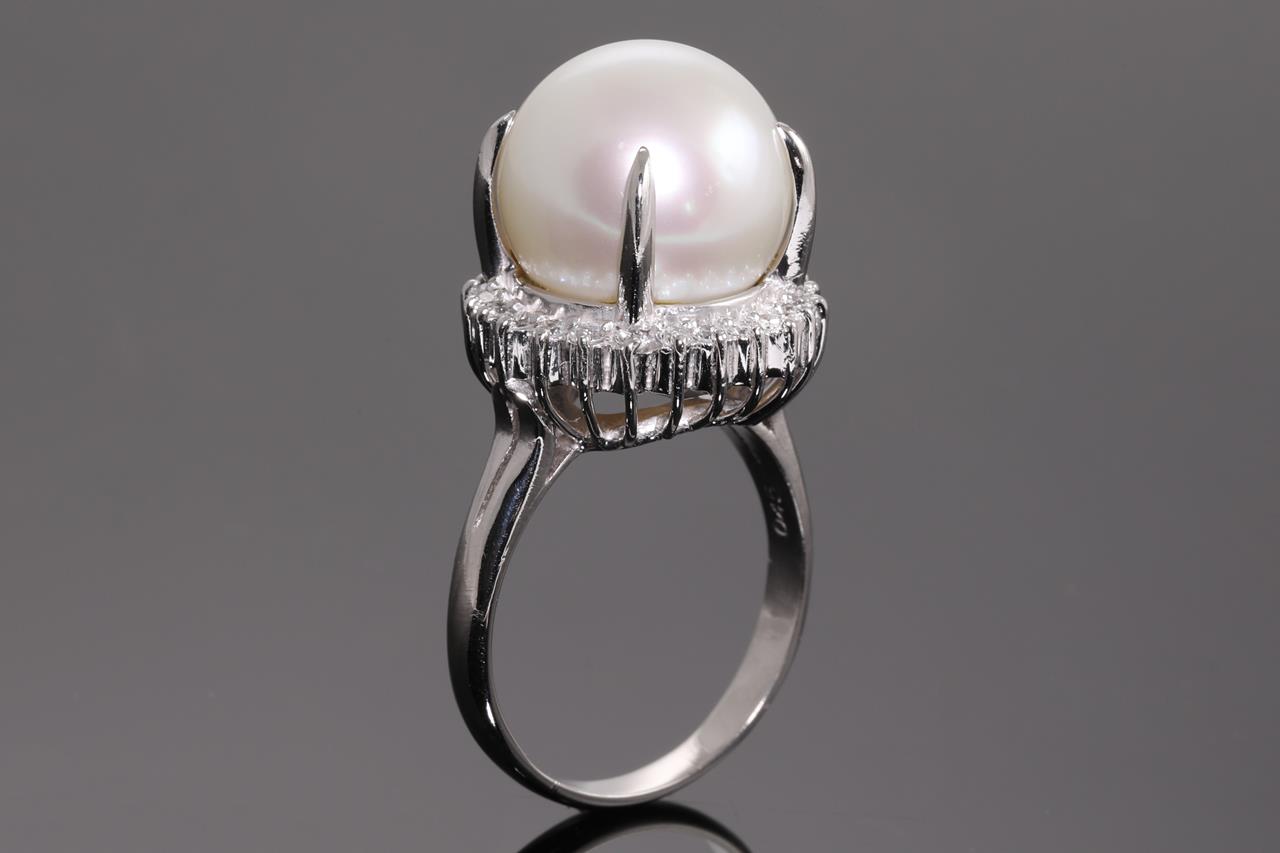 Pearl and Diamond ring with a South Sea Pearl of 13.5mm and round Diamonds totalling 0.45cts (Estimated grading: H SI). Platinum. Ring size Q. Weight: 14.3g. (Pre-owned)