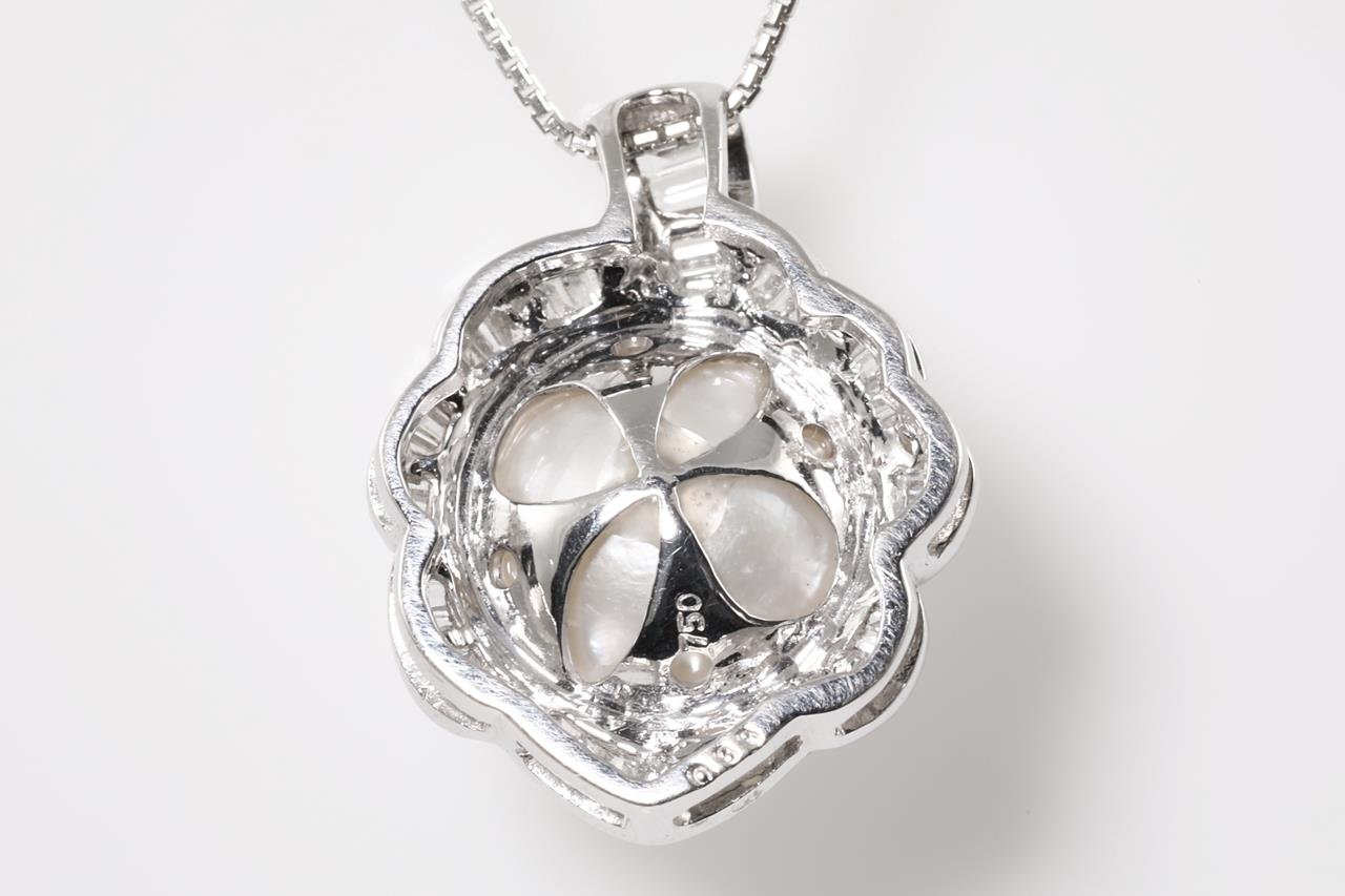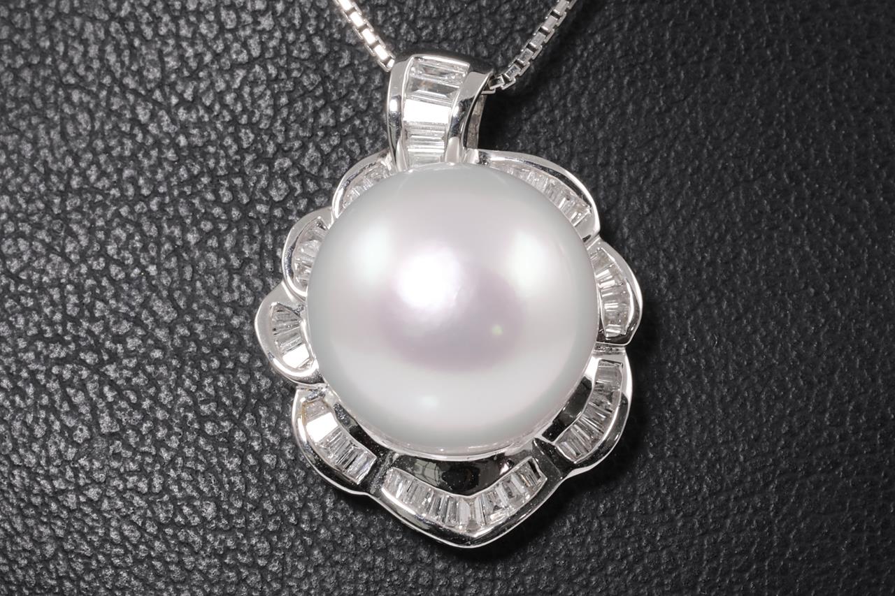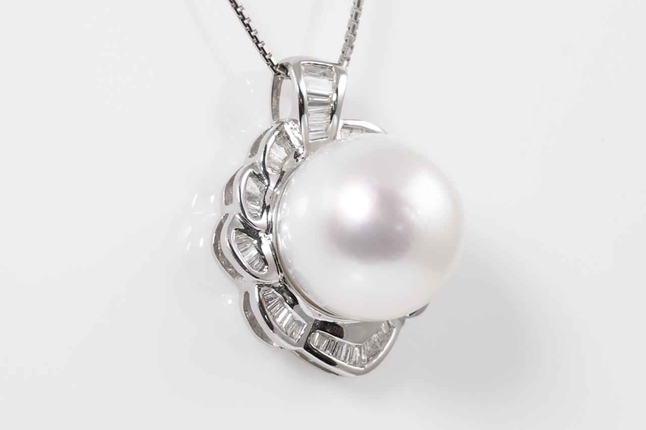 Pearl and Diamond Pendant with round white South Sea Pearl of 13.2mm and round Diamonds totalling approximately 1.20cts. 18ct white gold. Pendant weight 6.7g. With display chain (base metal). (As New)