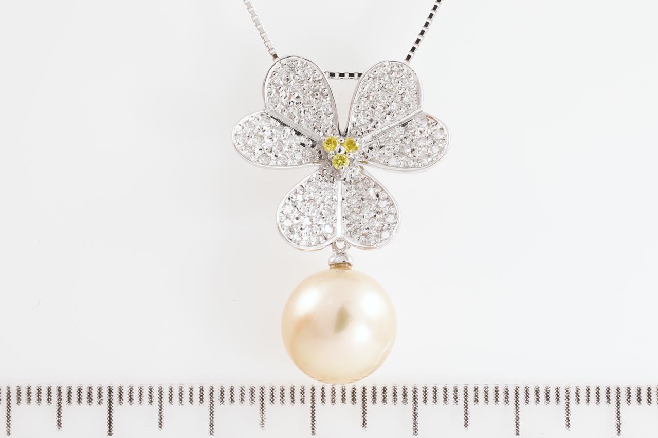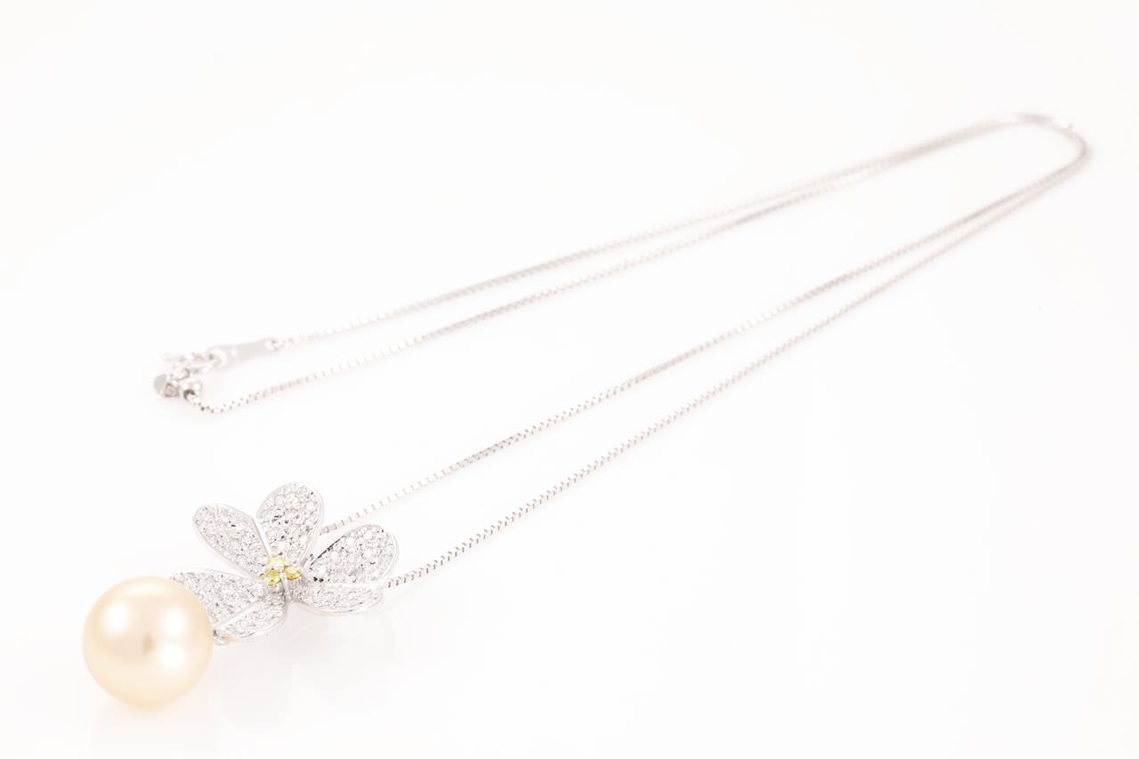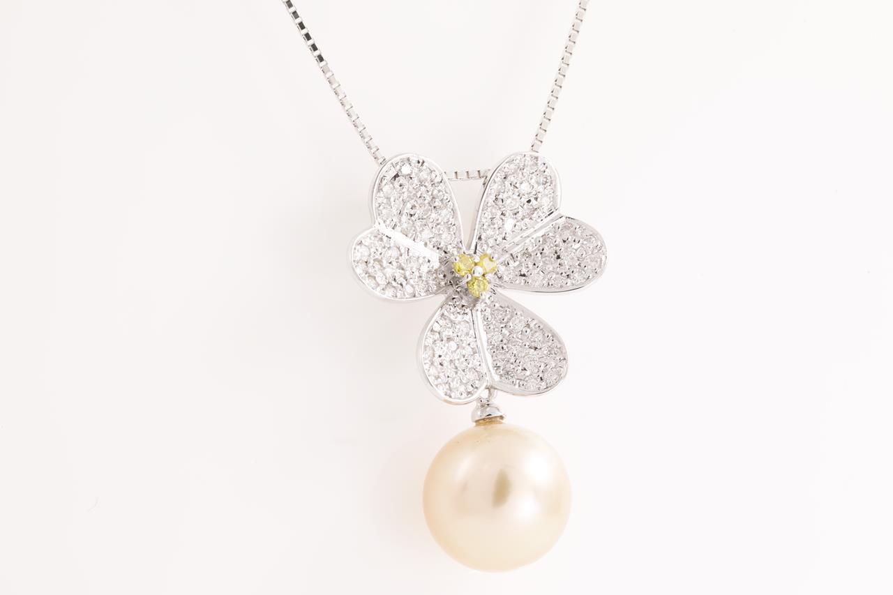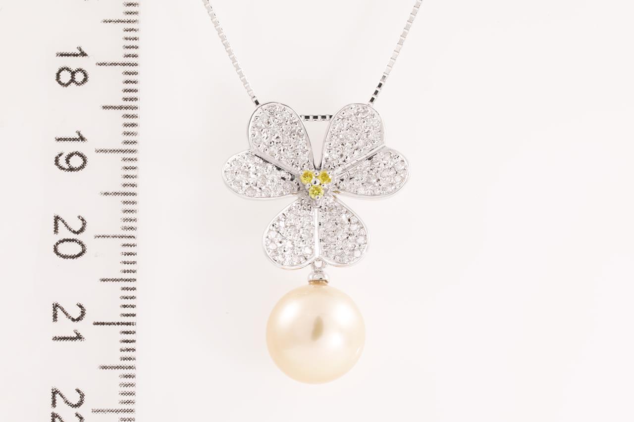 Pearl and Diamond flower design pendant with a light golden South Sea pearl of 11.3mm and white & yellow Diamonds totalling 0.66cts (Estimated grading: FY SI & G-H SI). 18ct white gold with 44cm adjustable chain. Weight: 7.1g (Pre-owned)