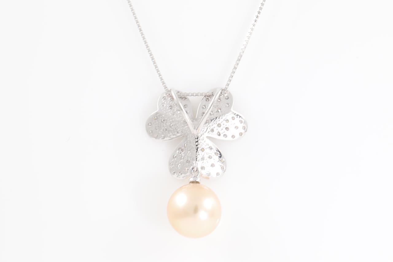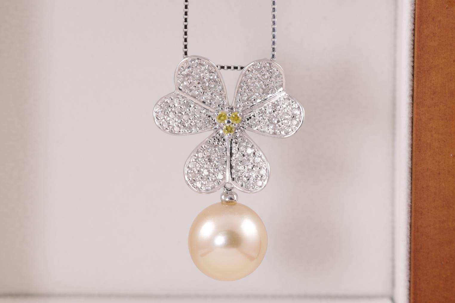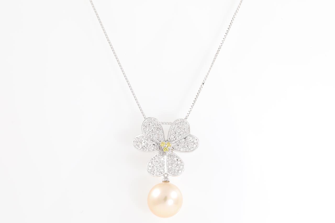 Pearl and Diamond flower design pendant with a light golden South Sea pearl of 11.3mm and white & yellow Diamonds totalling 0.66cts (Estimated grading: FY SI & G-H SI). 18ct white gold with 44cm adjustable chain. Weight: 7.1g (Pre-owned)