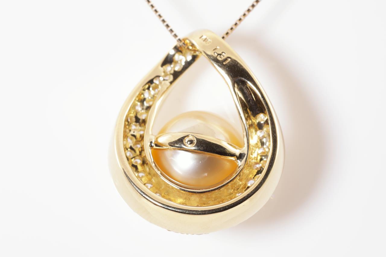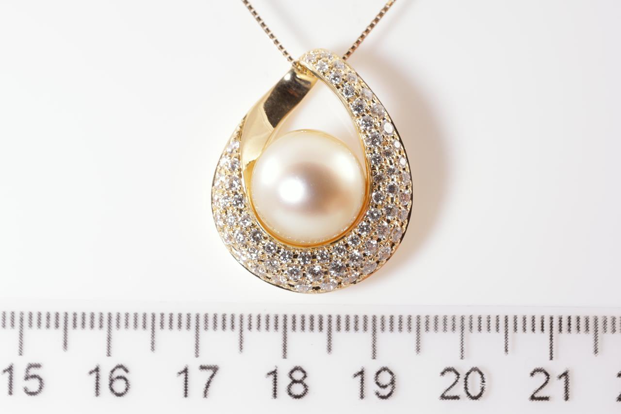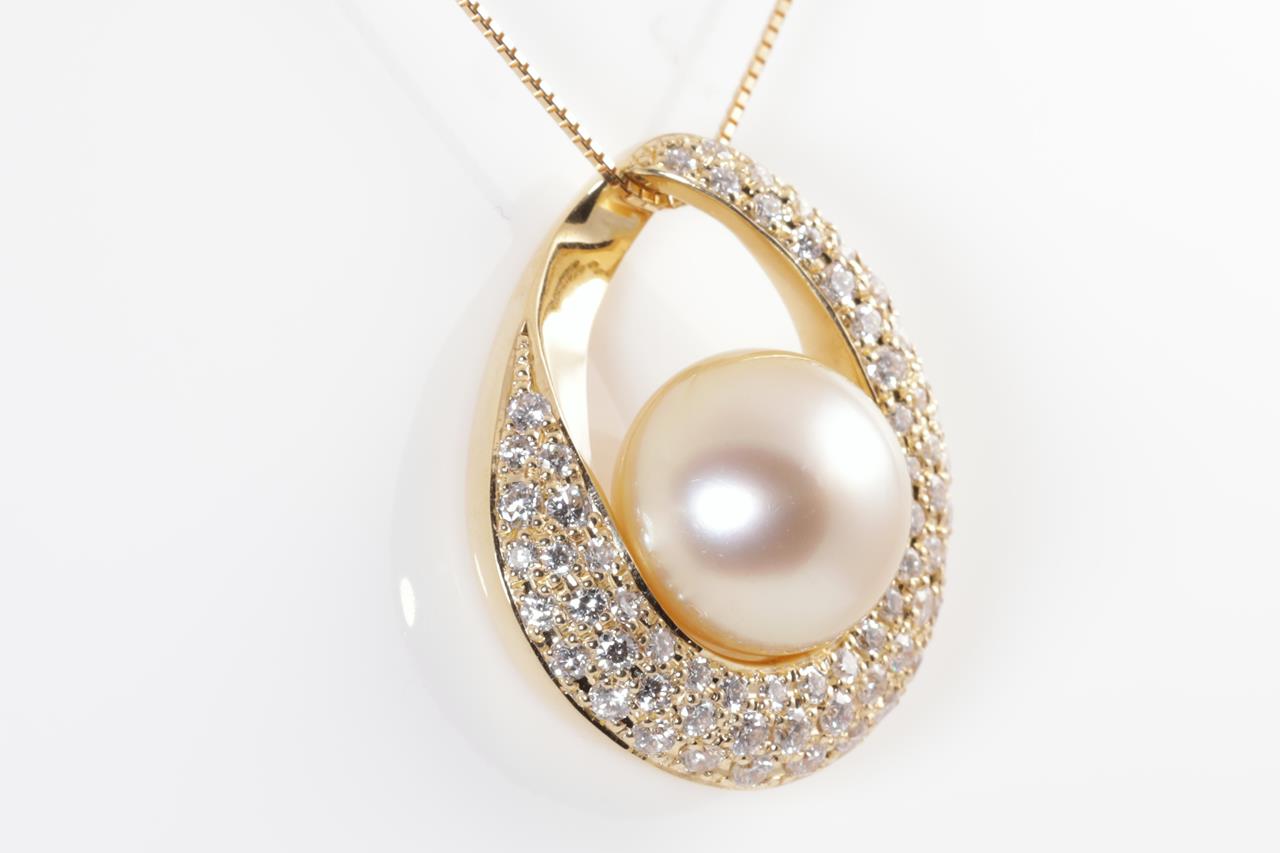 Pearl and Diamond Pendant with a button shape golden South Sea Pearl of 12.9mm and Diamonds totalling 1.31cts (Estimated grading: H SI). 18ct yellow gold with 44cm adjustable chain. Weight: 15.1g (Pre-owned)