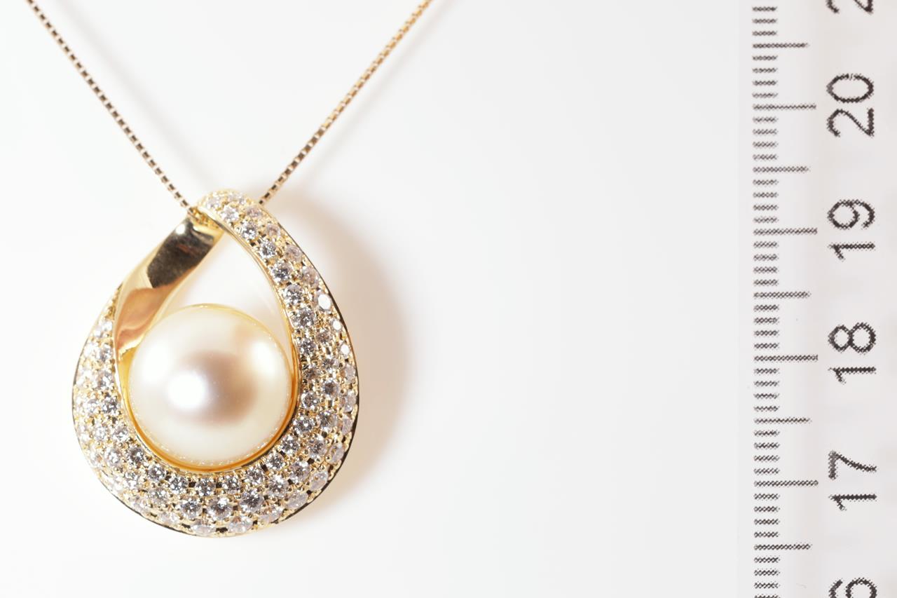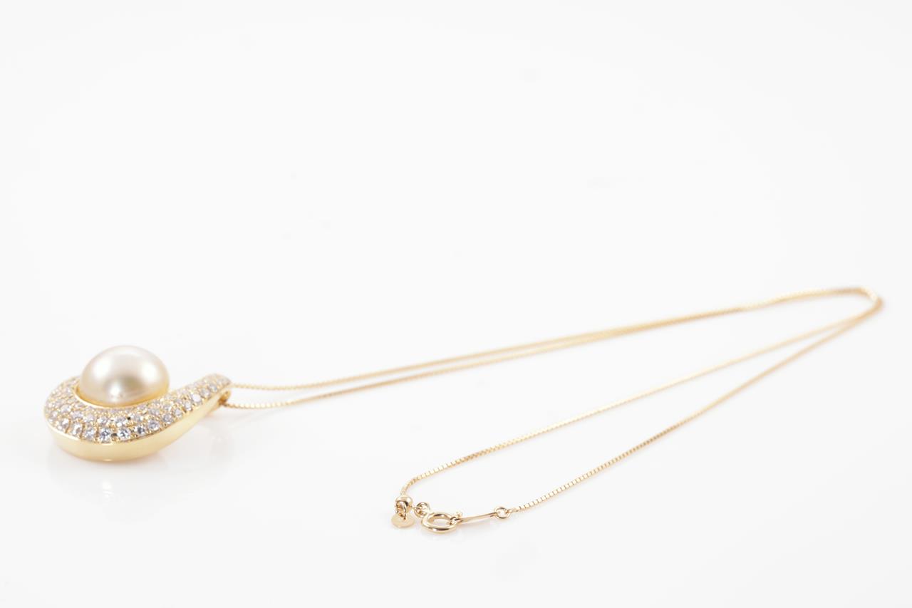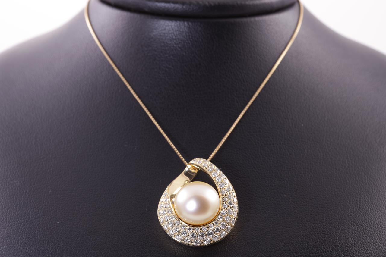Pearl and Diamond Pendant with a button shape golden South Sea Pearl of 12.9mm and Diamonds totalling 1.31cts (Estimated grading: H SI). 18ct yellow gold with 44cm adjustable chain. Weight: 15.1g (Pre-owned)