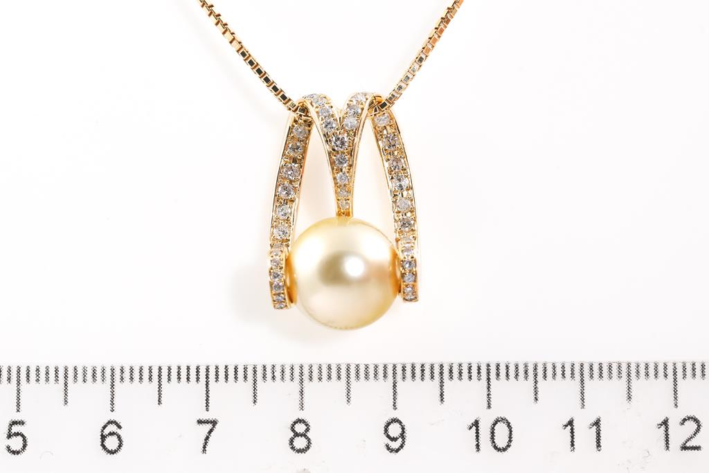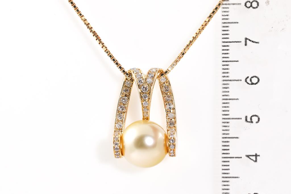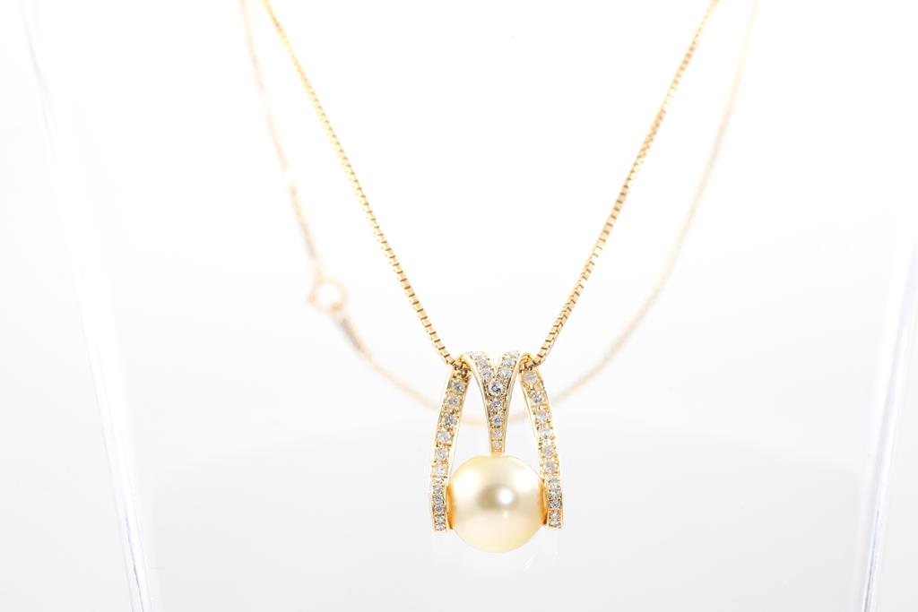 Pearl and Diamond pendant with Golden South Sea Pearl of 11.7mm and Diamonds totalling 0.71cts (Estimated grading: G-H P1-2). 18ct yellow gold with adjustable 45cm chain. Weight: 13.4g. (Pre-owned)