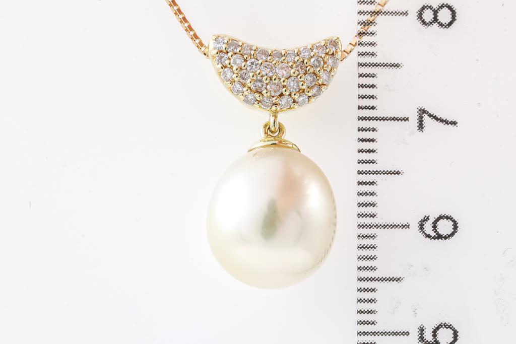 Pearl and Diamond pendant with a drop shape South Sea Pearl of 10mm and round Diamonds totalling 0.30cts (Estimated grading: H SI). 18ct yellow gold with 18ct yellow gold 44cm adjustable chain. Weight: 7.2g. (Pre-owned)