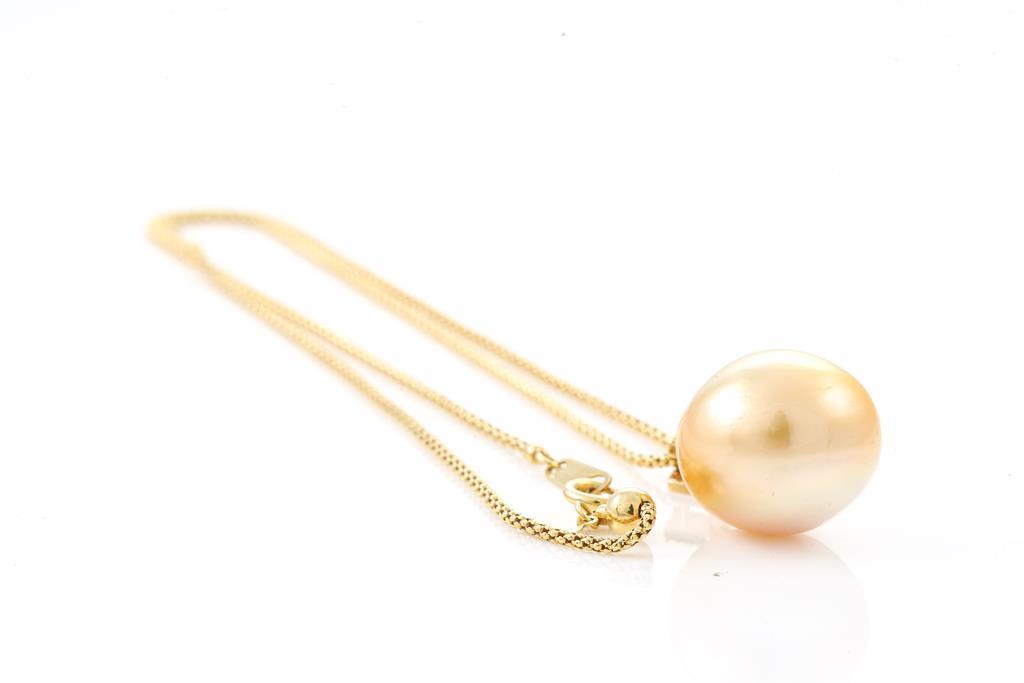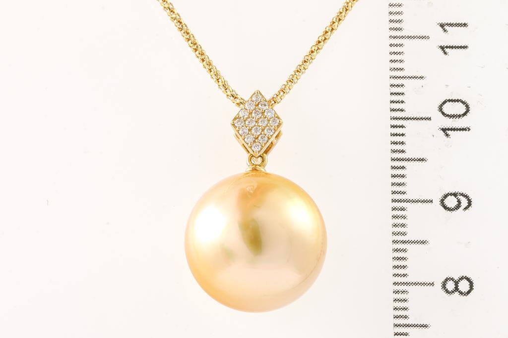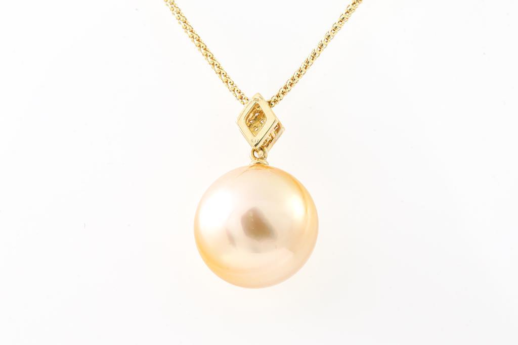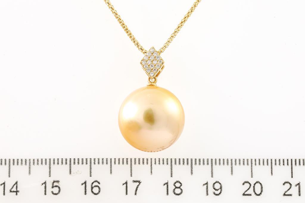 Pearl and Diamond pendant with a button shape Golden South Sea Pearl of 16.3mm and round Diamonds totalling 0.11cts. 18ct yellow gold with 18ct yellow gold adjustable 45cm chain. Weight: 9.3g. (Pre-owned)