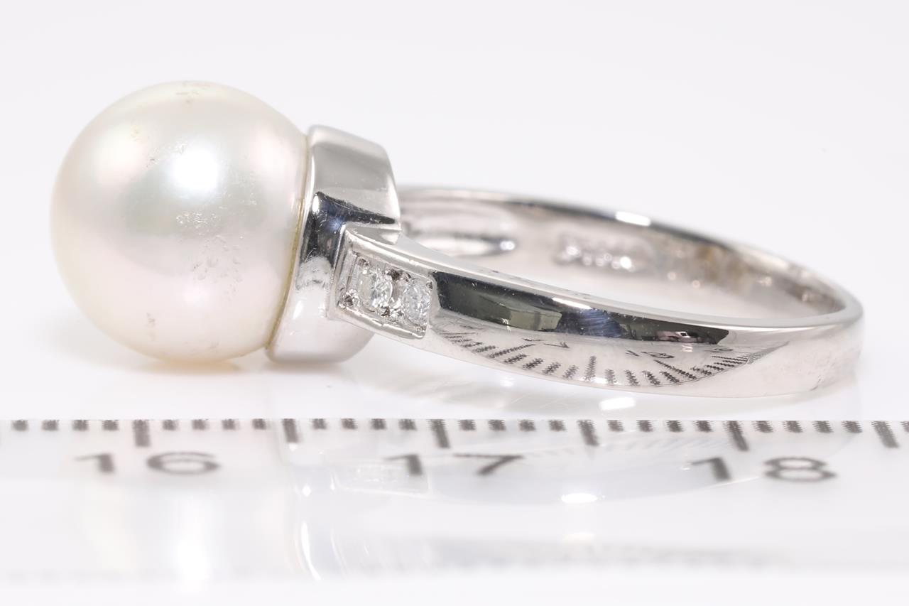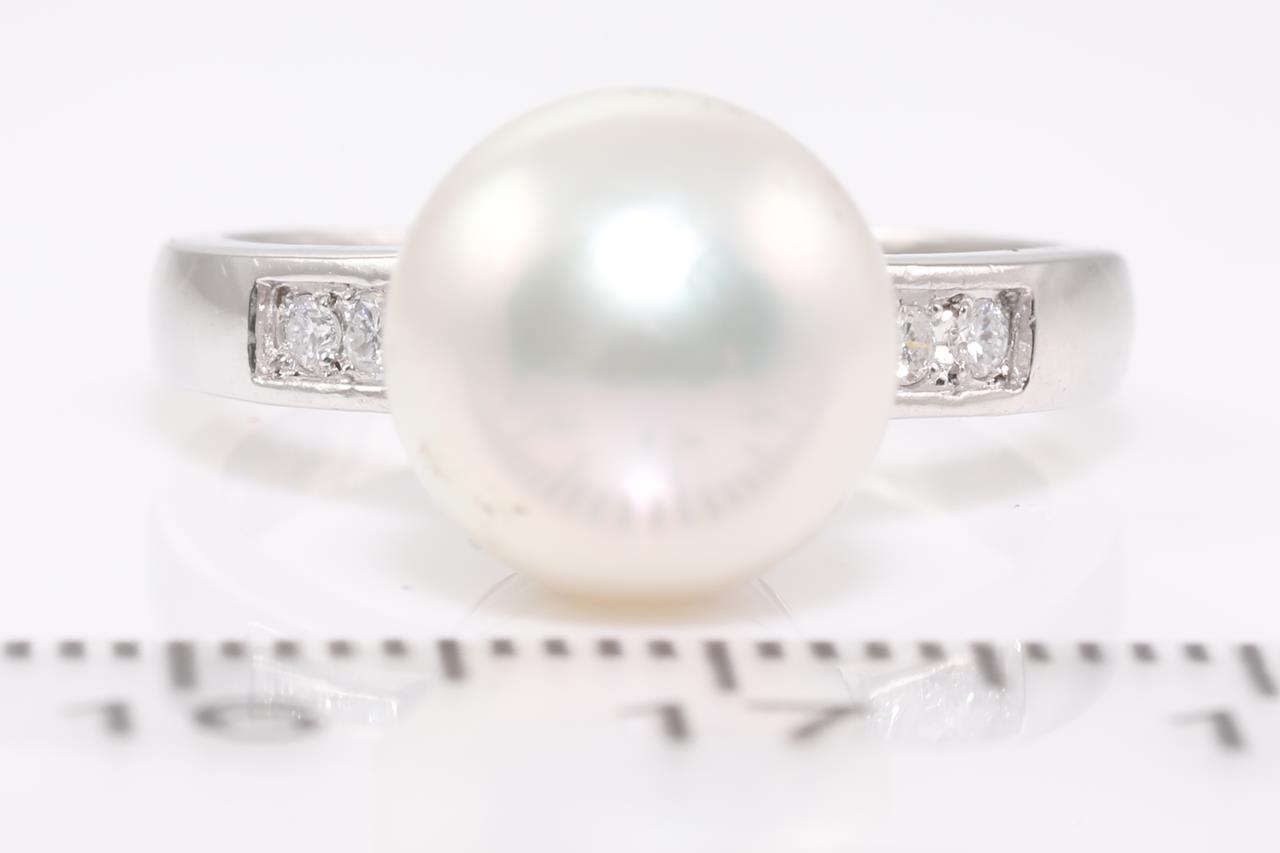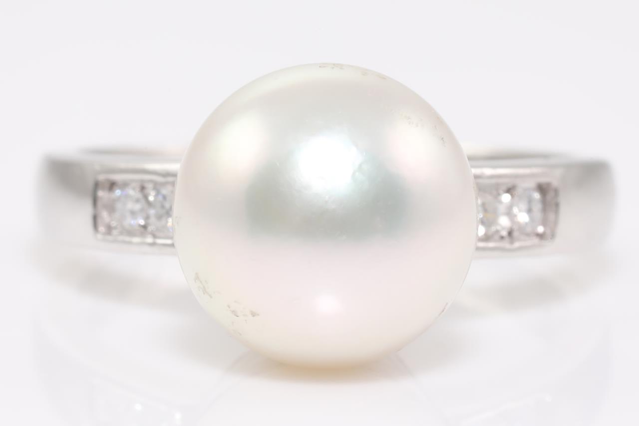 Pearl ring set with a South Sea Pearl of 10mm and Diamonds totalling 0.44cts (Estimated grading: G SI-P1). Platinum. Ring size L - ring resizing is not recommended. Total weight: 12.2g. (Pre-owned)