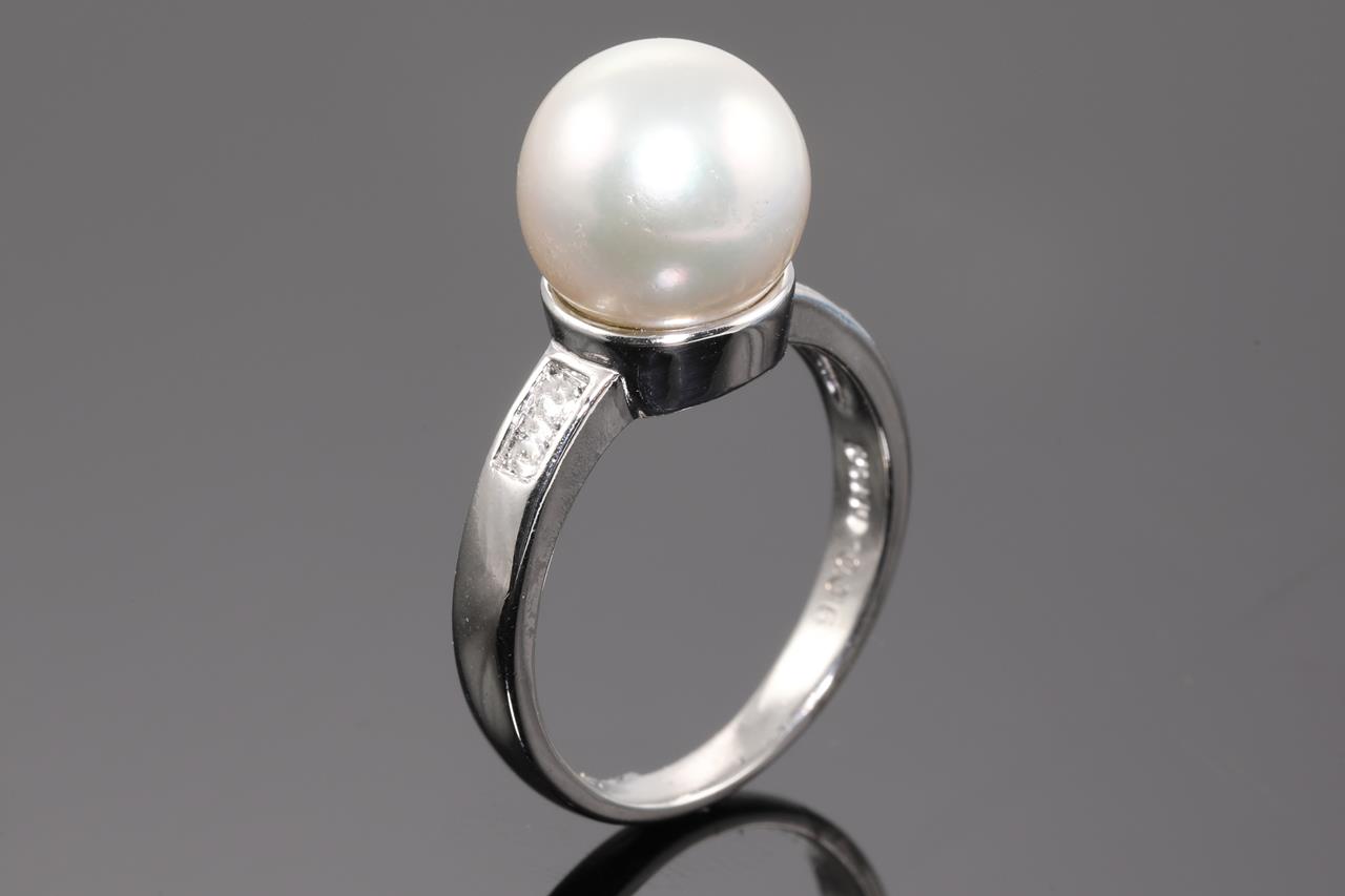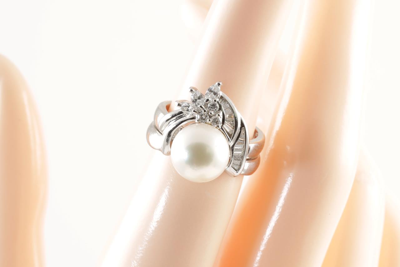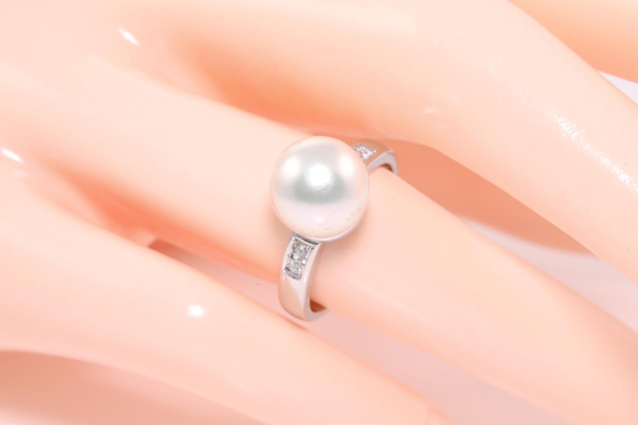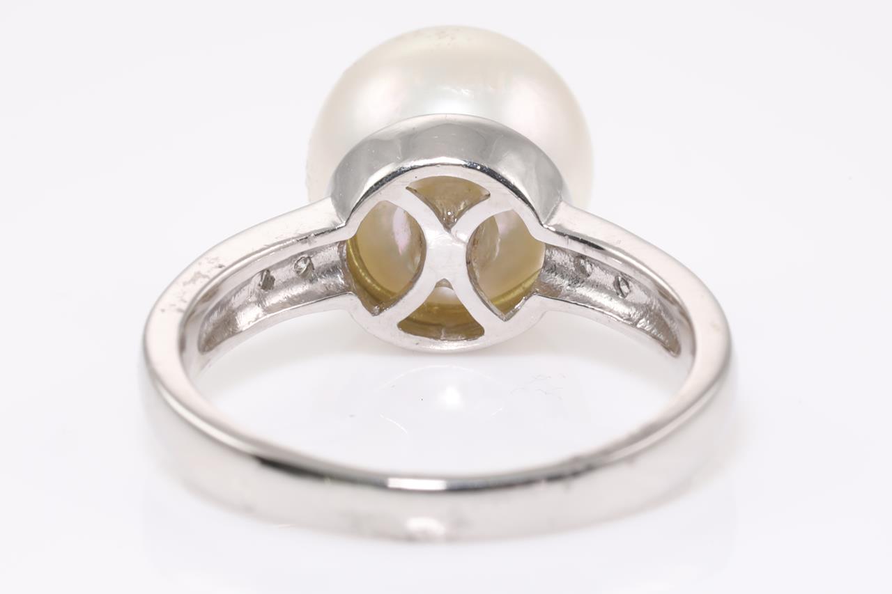 Pearl ring set with a South Sea Pearl of 10mm and Diamonds totalling 0.44cts (Estimated grading: G SI-P1). Platinum. Ring size L - ring resizing is not recommended. Total weight: 12.2g. (Pre-owned)