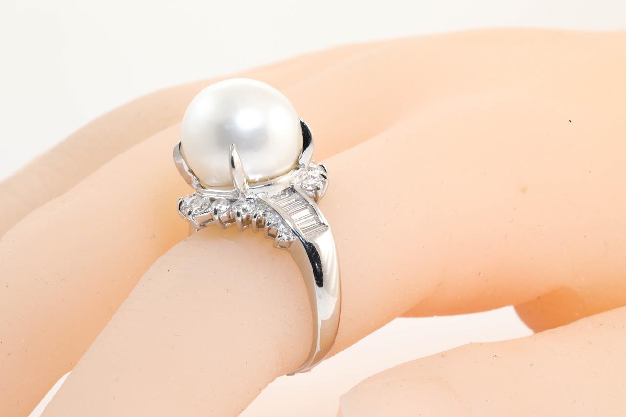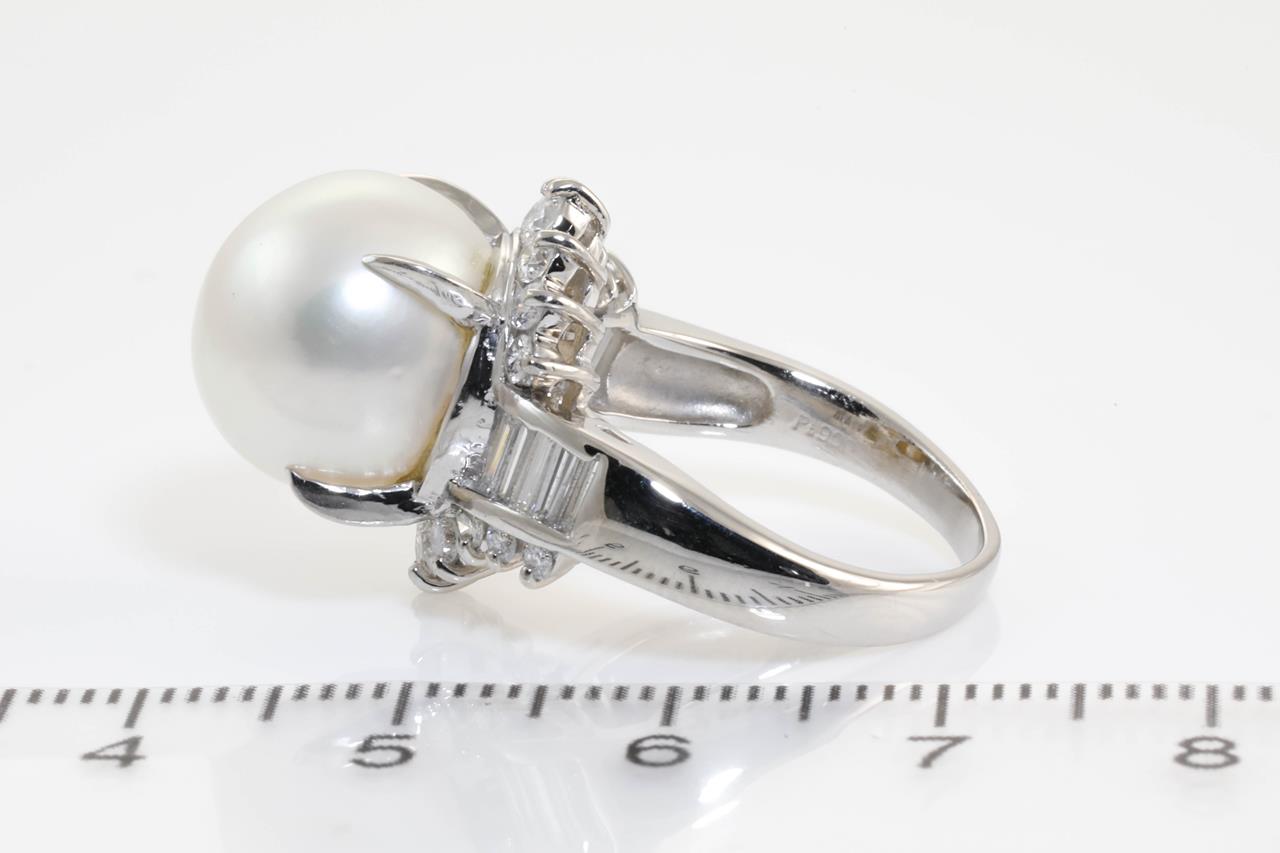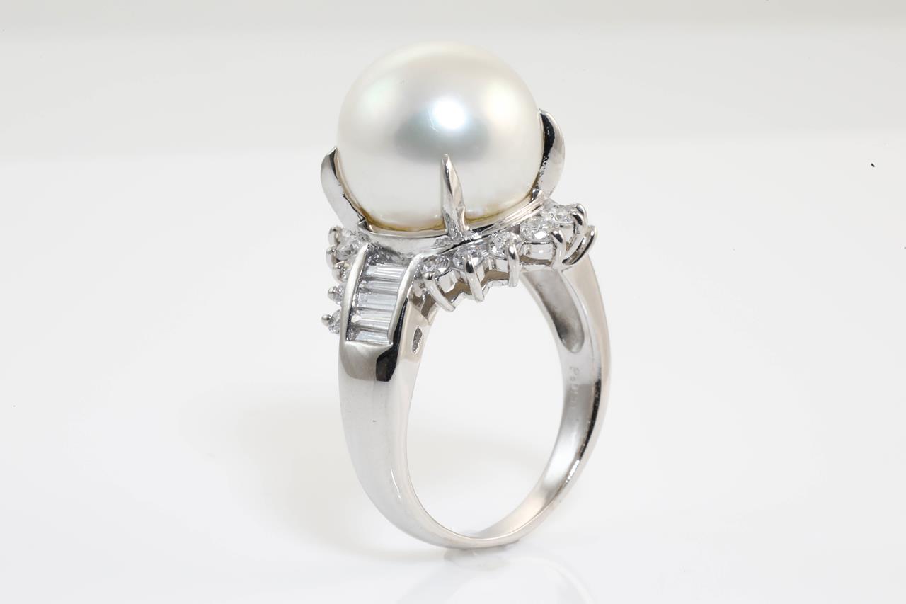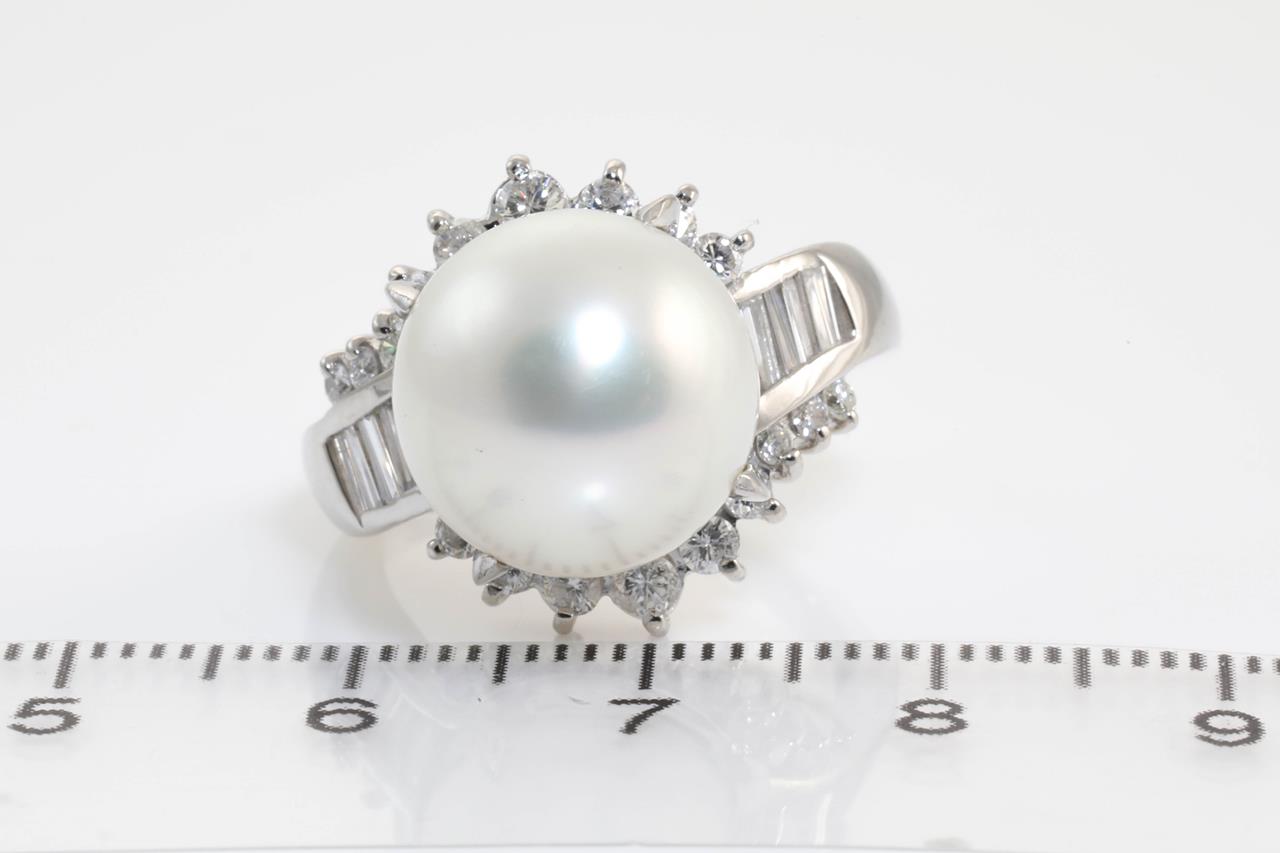 Pearl and Diamond ring with a South Sea Pearl of 12.7mm with round and baguette cut Diamonds totalling 0.90cts (Estimated grading: G-H SI-P1). Platinum. Ring size N1/2 Weight: 12.4g (Pre-owned)