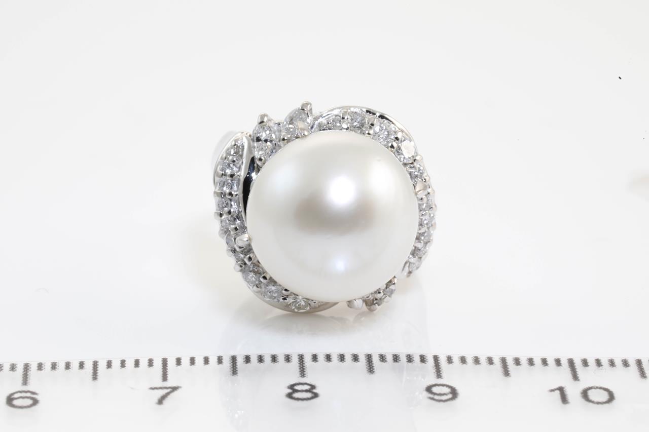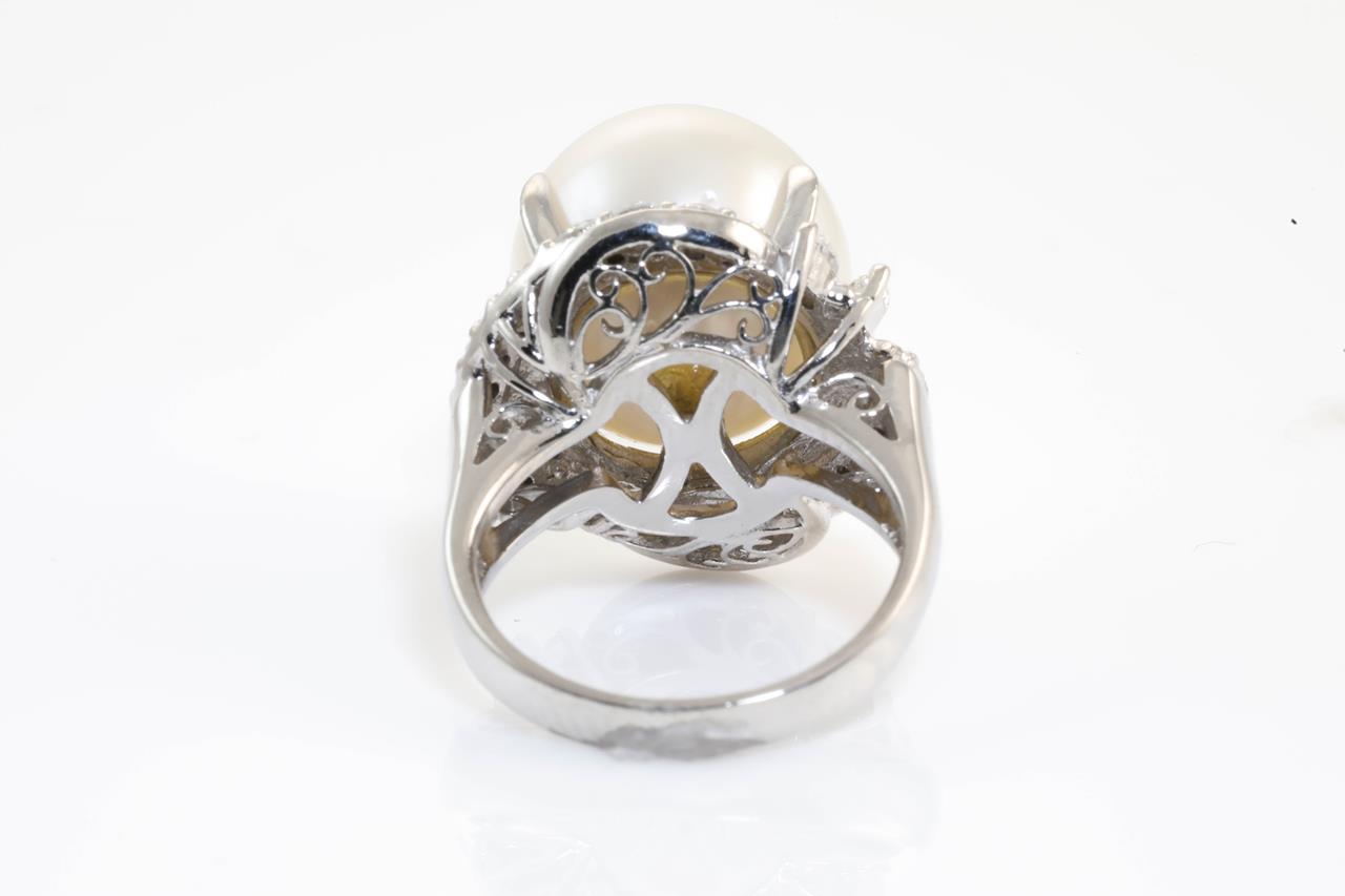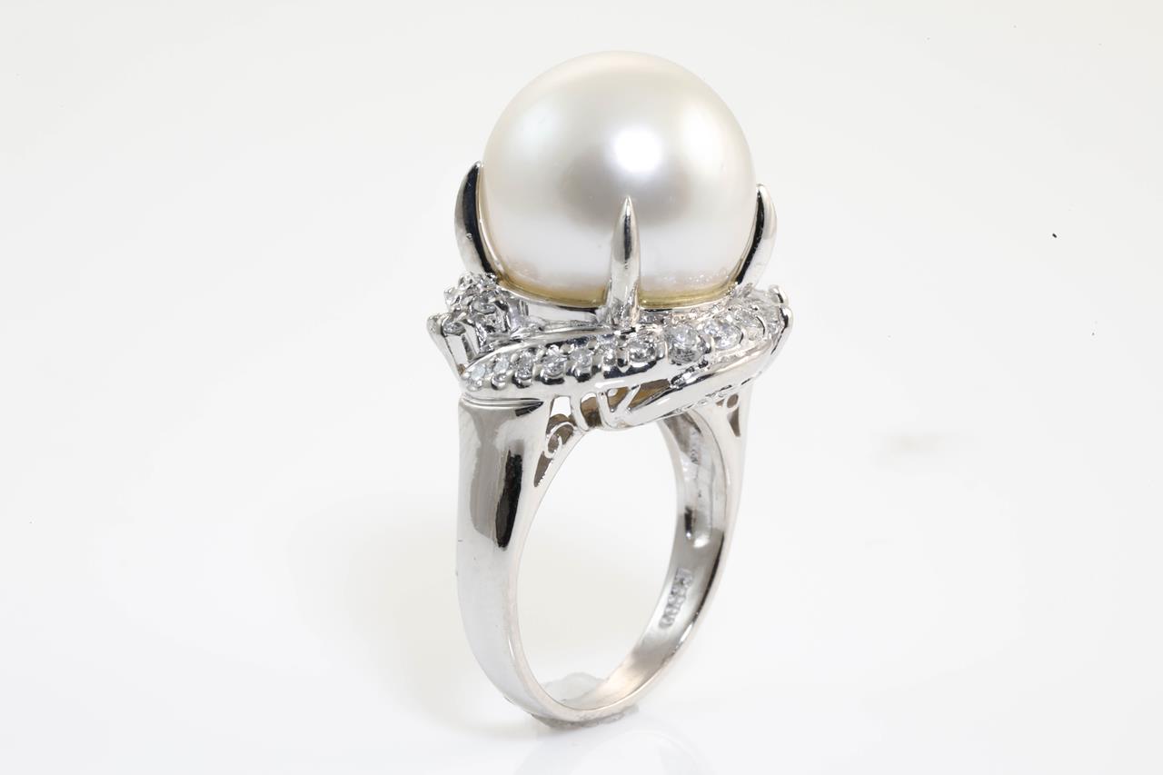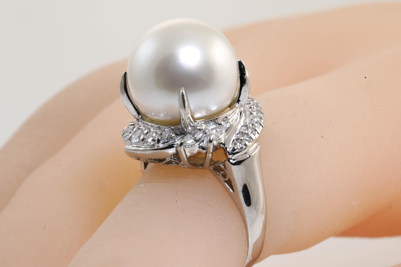 Pearl and Diamond ring with South Sea Pearl of 12.8mm with round and marquise cut Diamonds totalling 0.43cts (Estimated grading: H SI-P1). Platinum. Ring size G. Weight: 12.5g (Pre-owned)