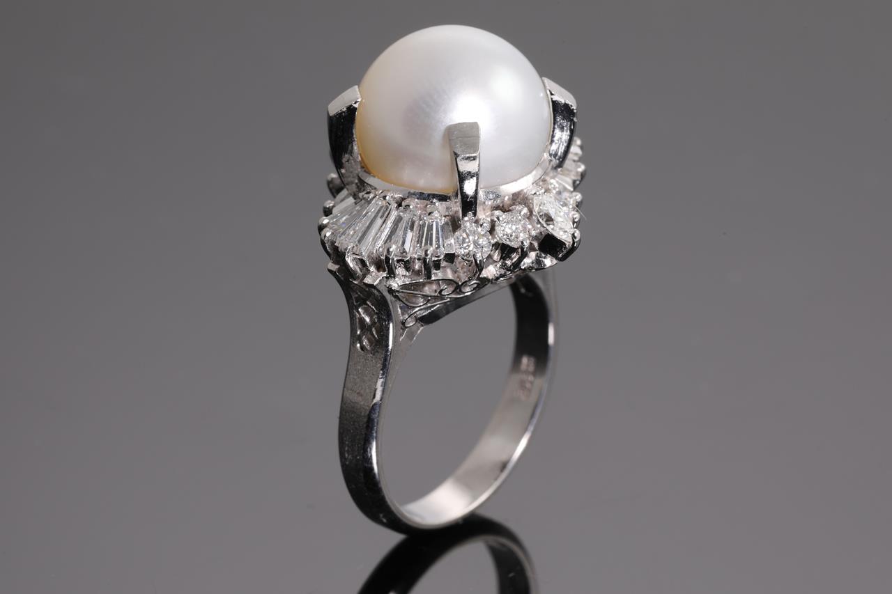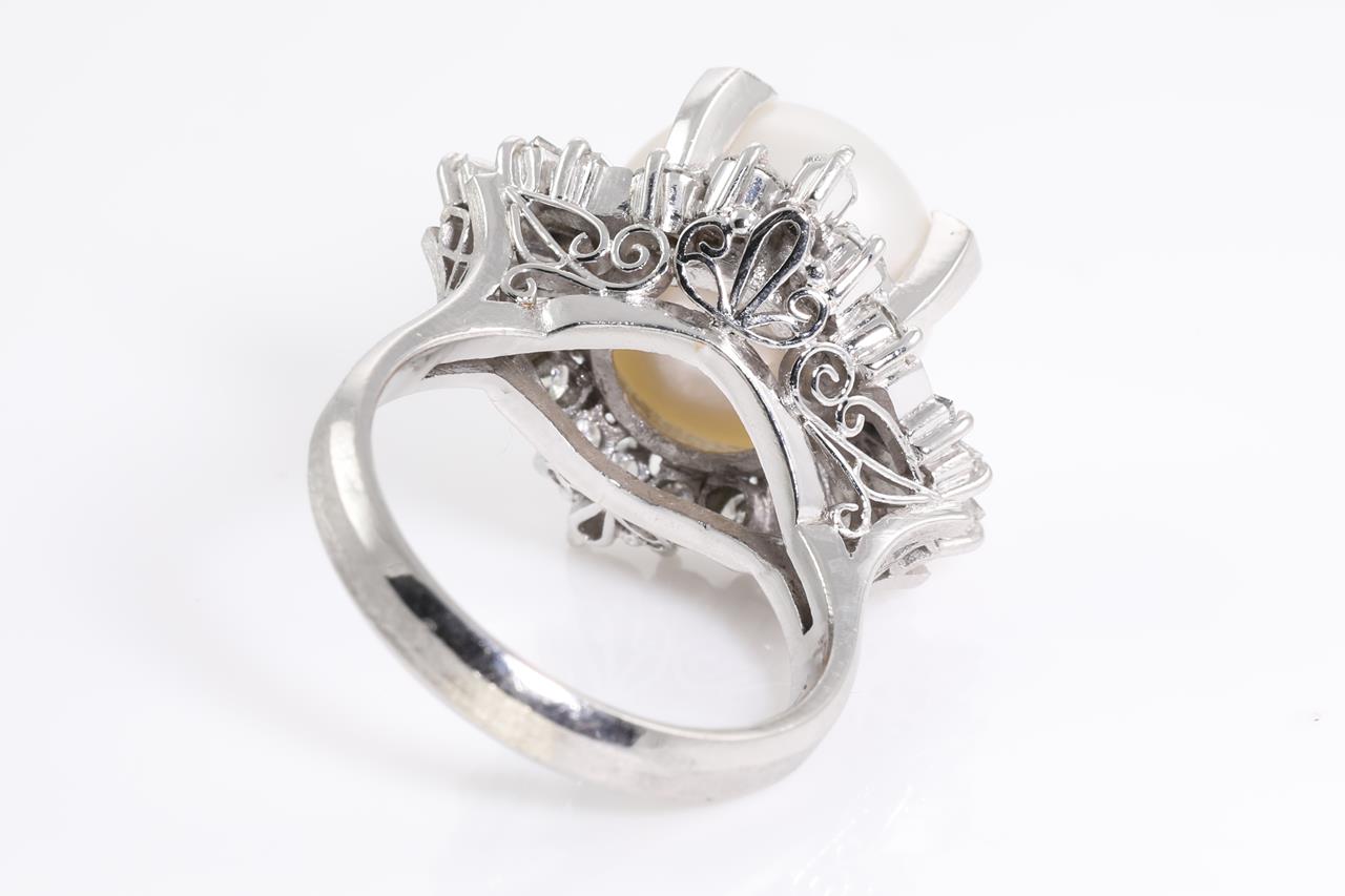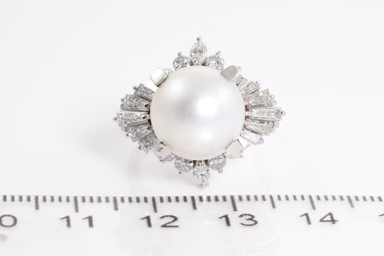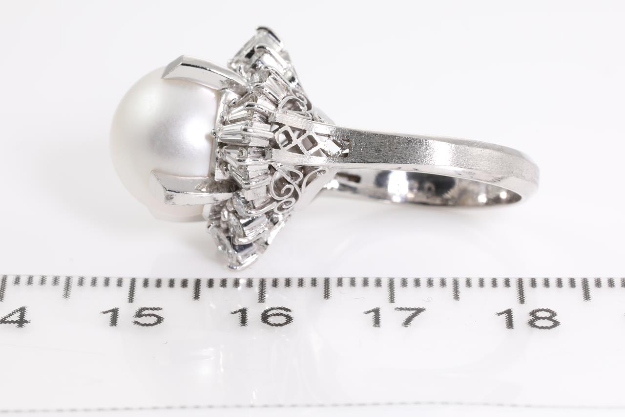 Pearl and Diamond ring with South sea Pearl of 12.0mm with marquise, round and baguette cut Diamonds totalling 1.30cts (Estimated grading: H VS-SI). Platinum. Ring size L. Weight: 13.5g (Pre-owned)