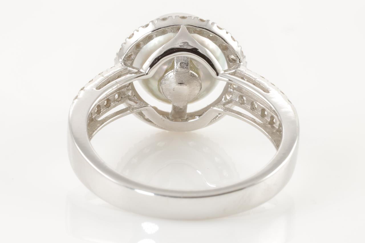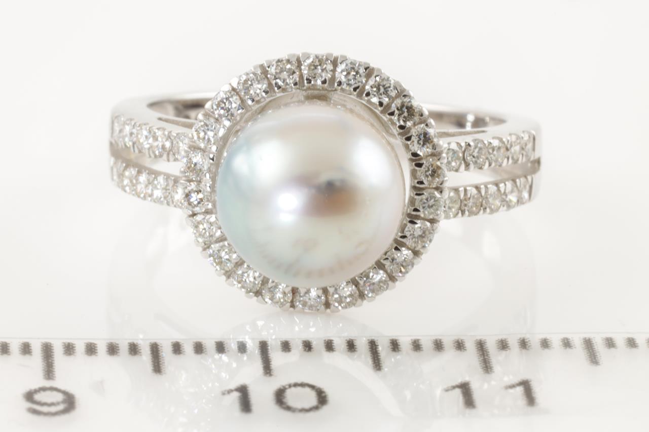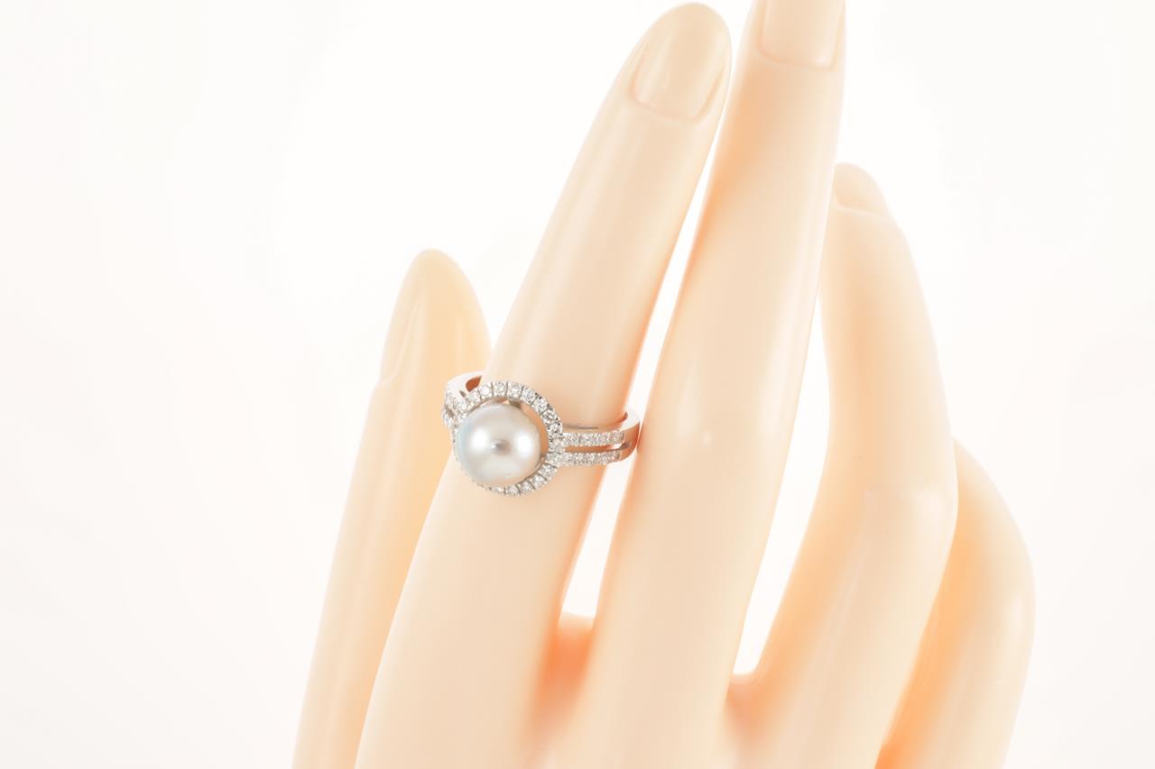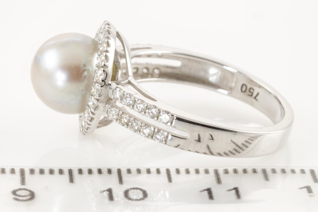 Pearl and Diamond ring with South Sea Pearl of 8.9mm and round Diamonds totalling 0.58cts (Estimated grading H SI). 18ct white gold. Ring size N. Weight 4.5g. (Pre-owned)