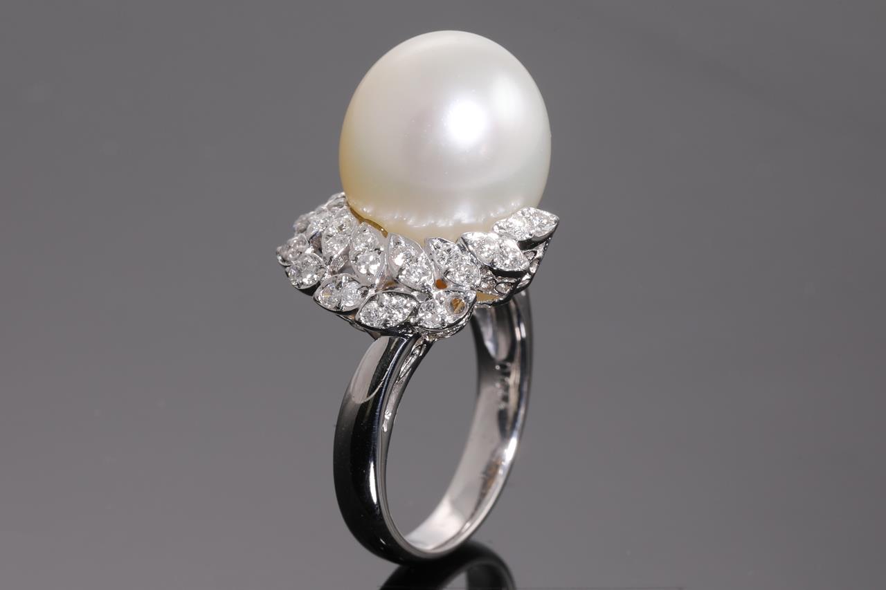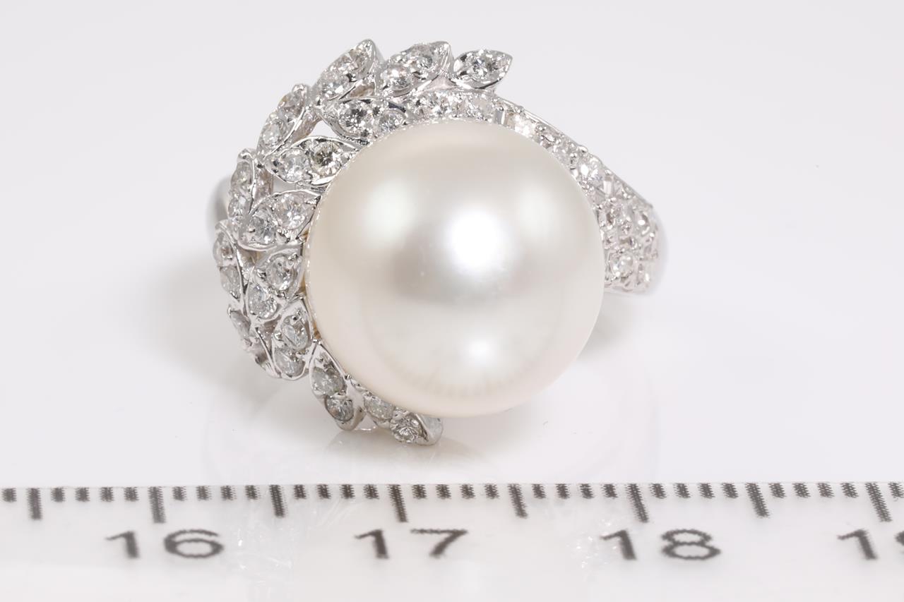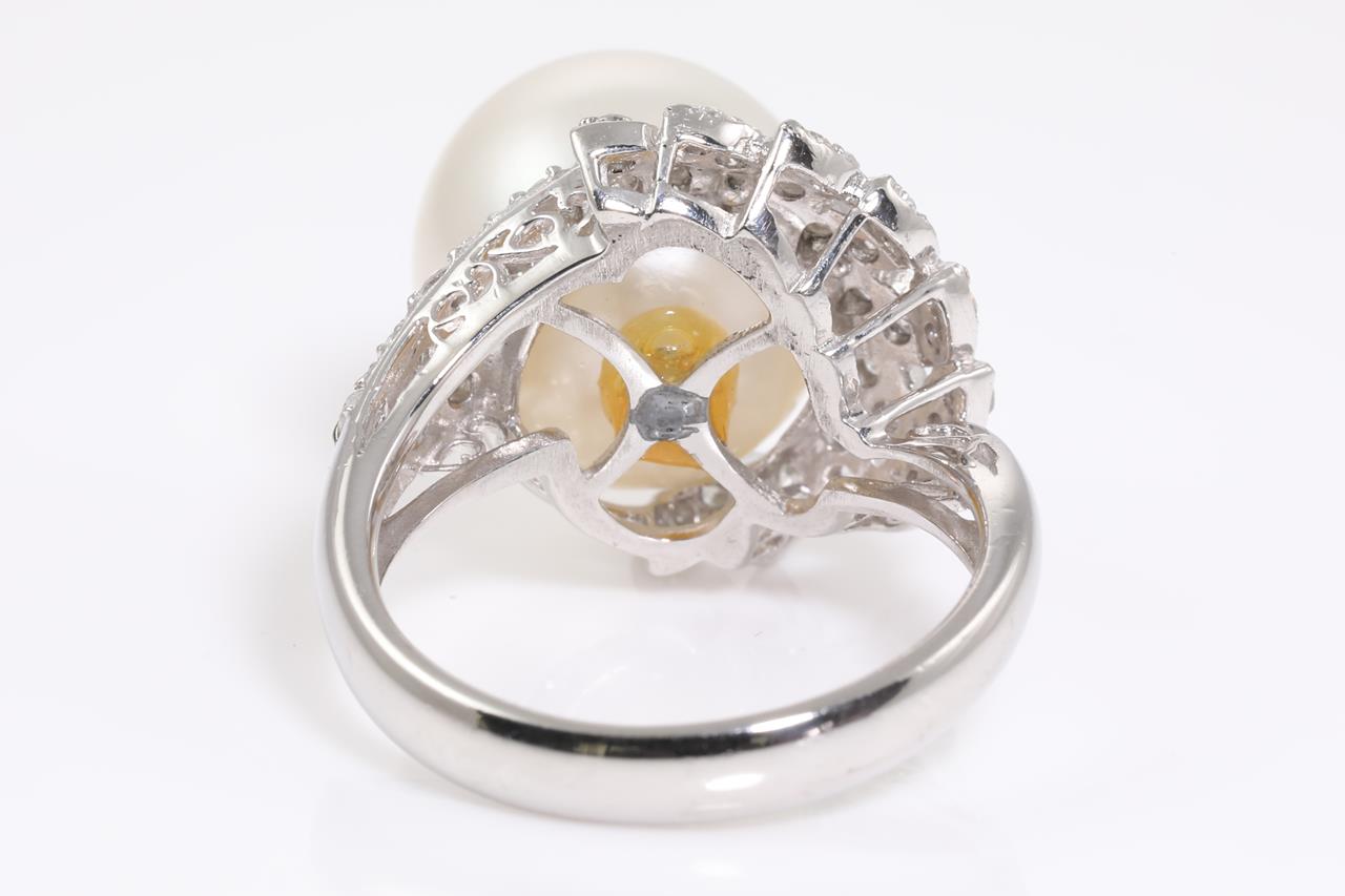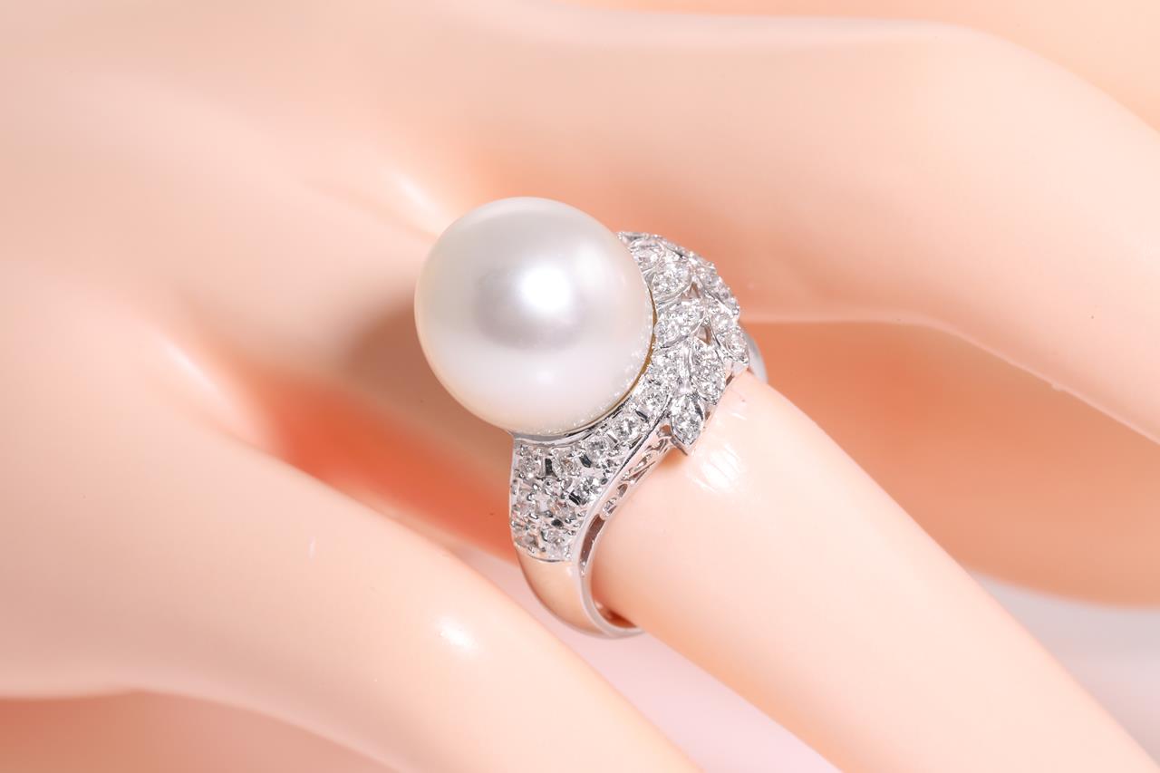 Pearl and Diamond ring with a South Sea Pearl of 12.5mm and round Diamonds totalling 0.47cts (Estimated grading: H P1). Platinum. Ring size L1/2 - cannot be resized up, down by a ring clip only. Weight: 11g. (Pre-owned)