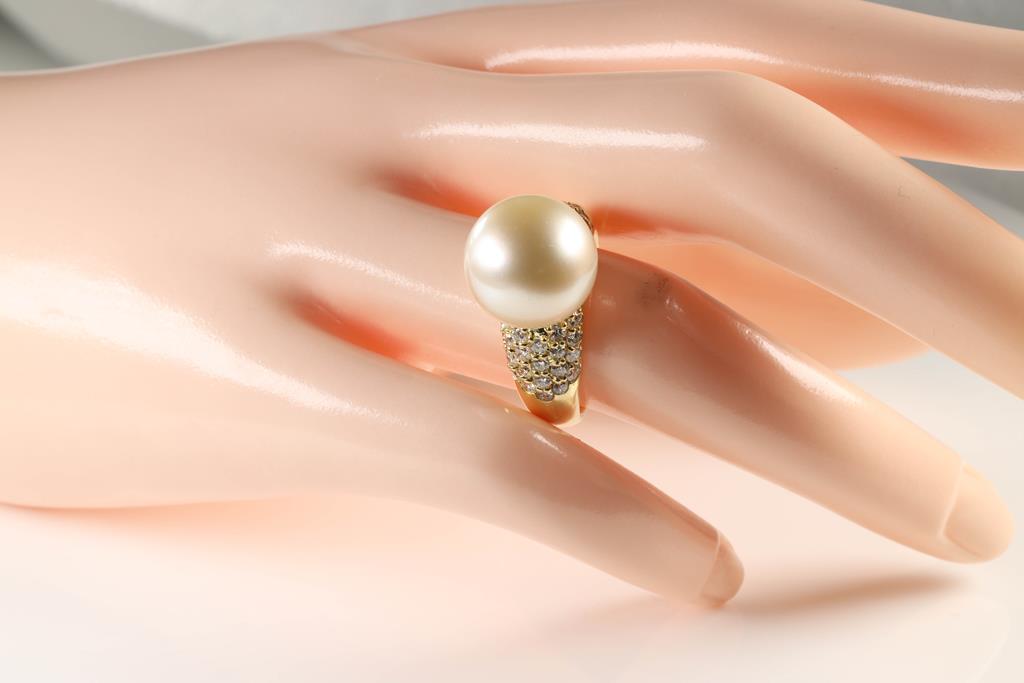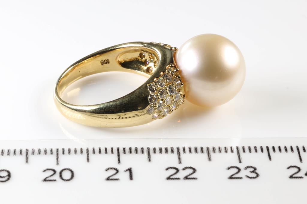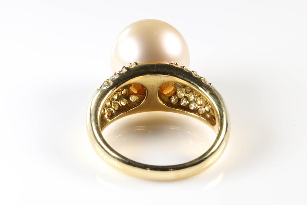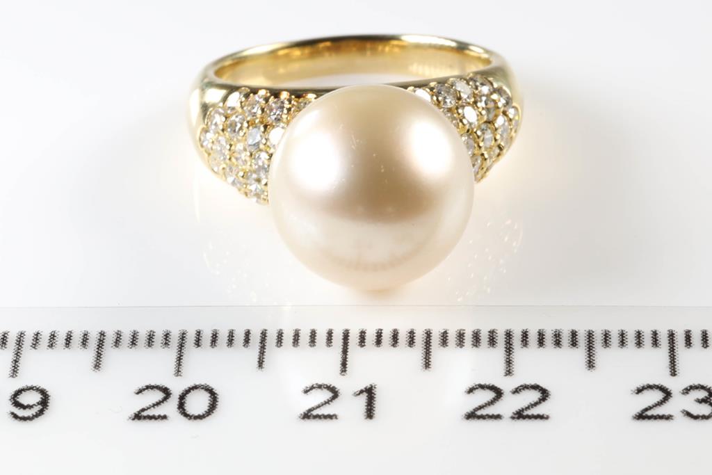 Pearl and Diamond ring with a golden South Sea Pearl of 12.8m and round Diamonds totalling 0.94cts (Estimated grading: G-H SI). 18ct yellow gold. Ring size O - ring resizing is not recommended. Weight: 11.1g. (Pre-owned)