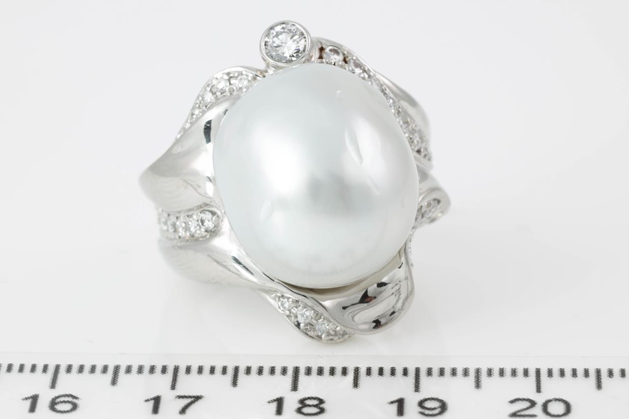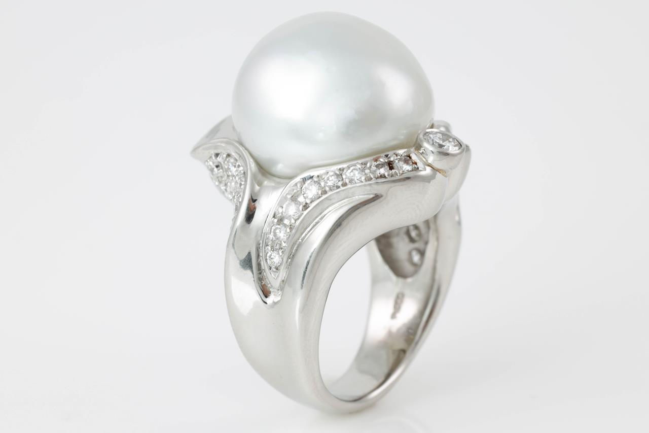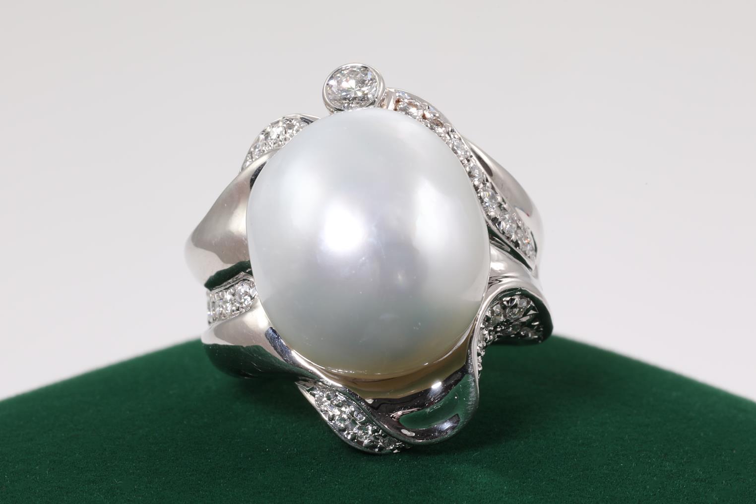 Pearl and Diamond ring with a semi-baroque South Sea Pearl of 16.2mm and Diamonds totalling 1.01cts (Estimated grading: G VS). Platinum. Ring size Q - ring resizing is not recommended. Weight: 33.1g. (Pre-owned)