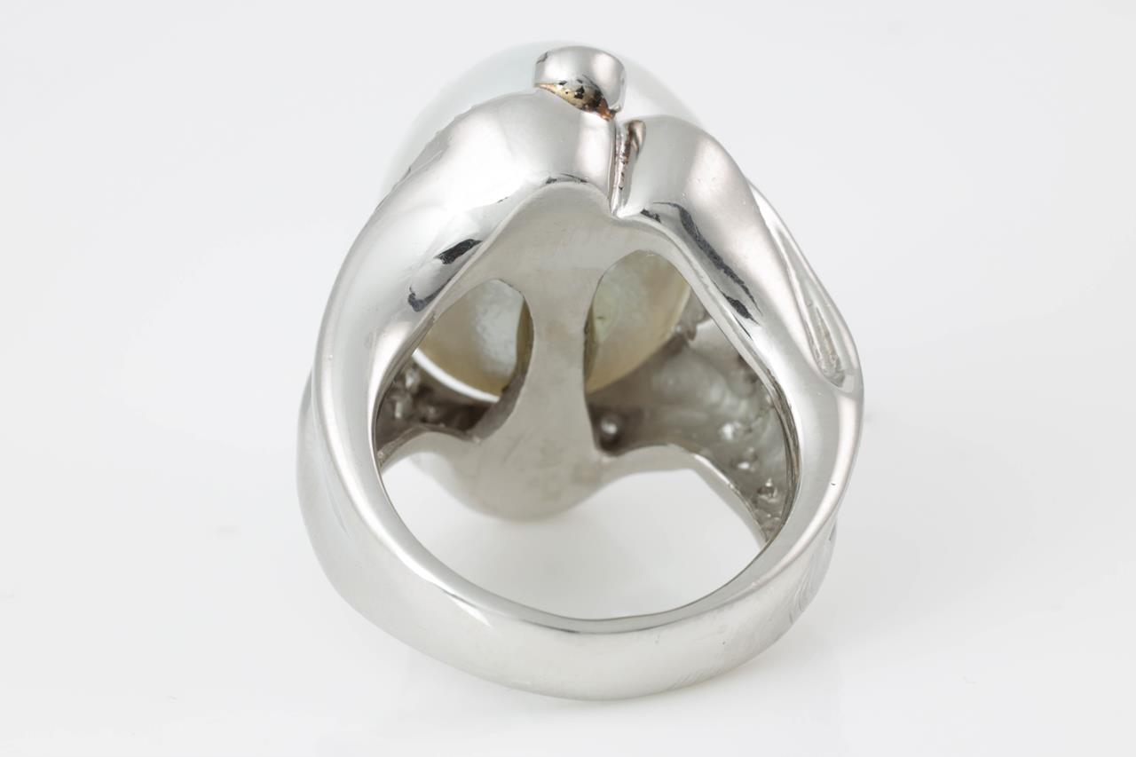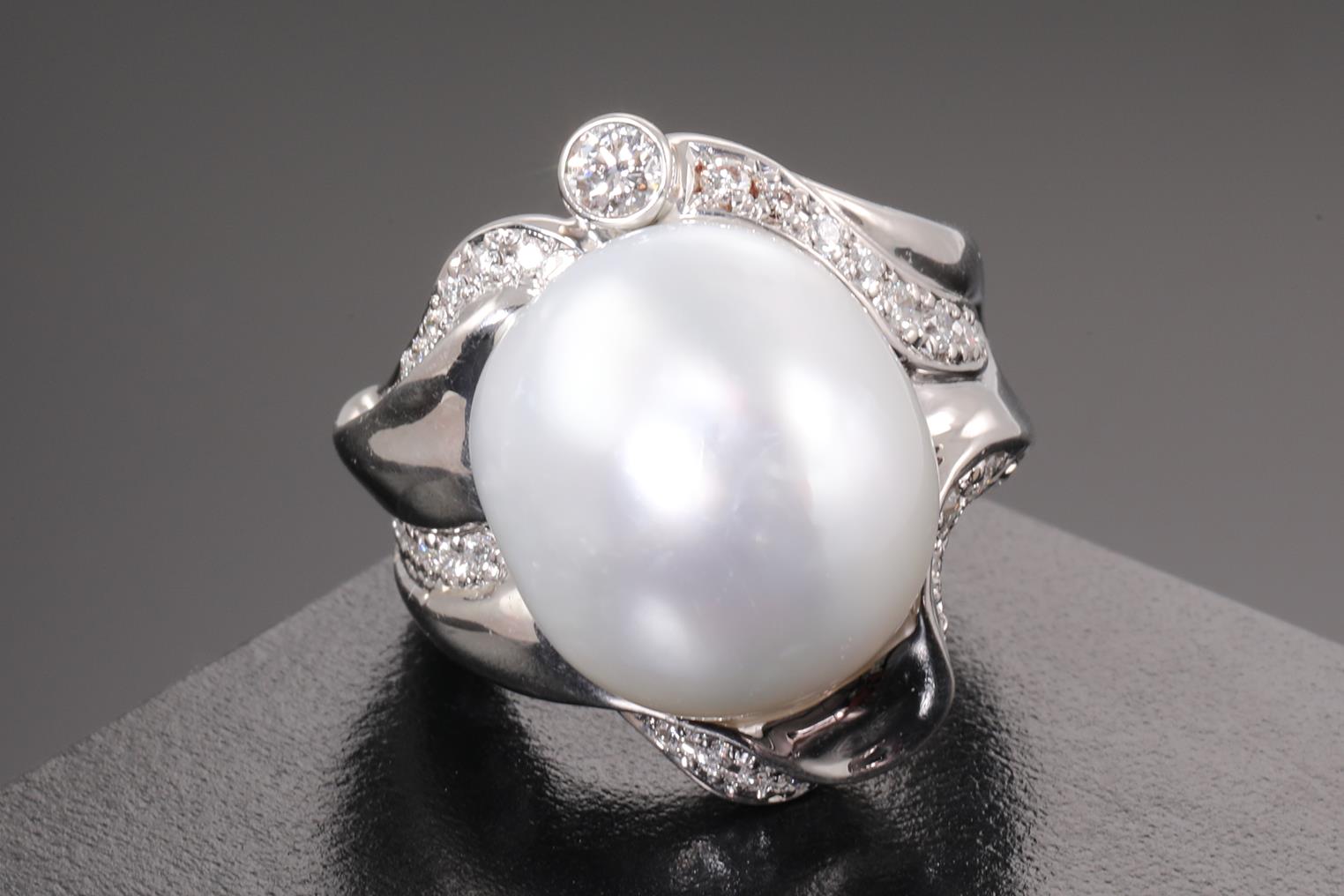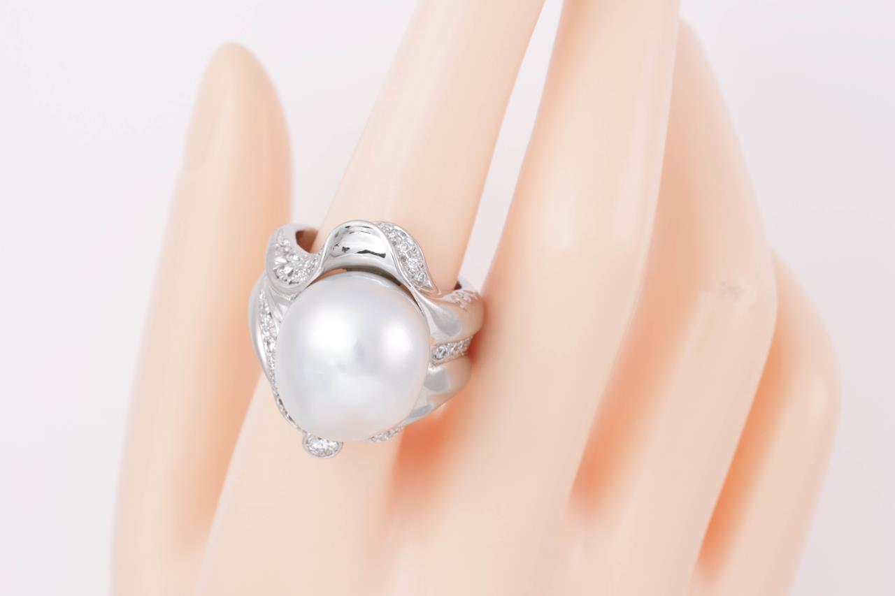 Pearl and Diamond ring with a semi-baroque South Sea Pearl of 16.2mm and Diamonds totalling 1.01cts (Estimated grading: G VS). Platinum. Ring size Q - ring resizing is not recommended. Weight: 33.1g. (Pre-owned)