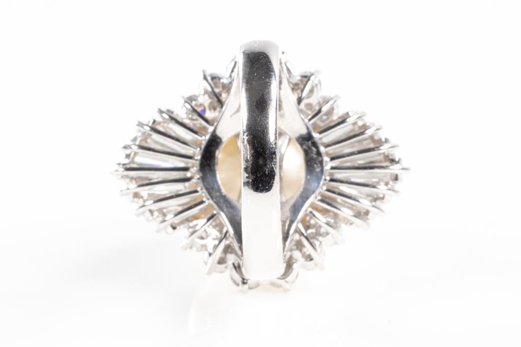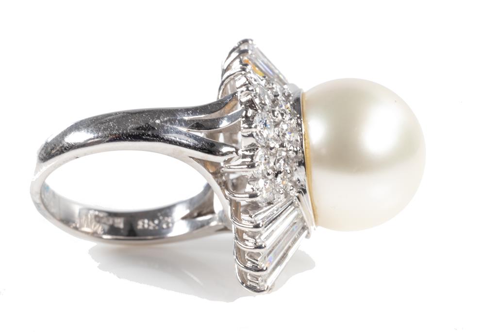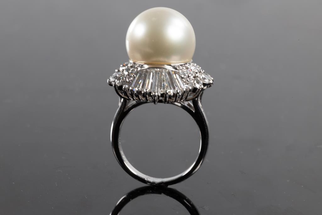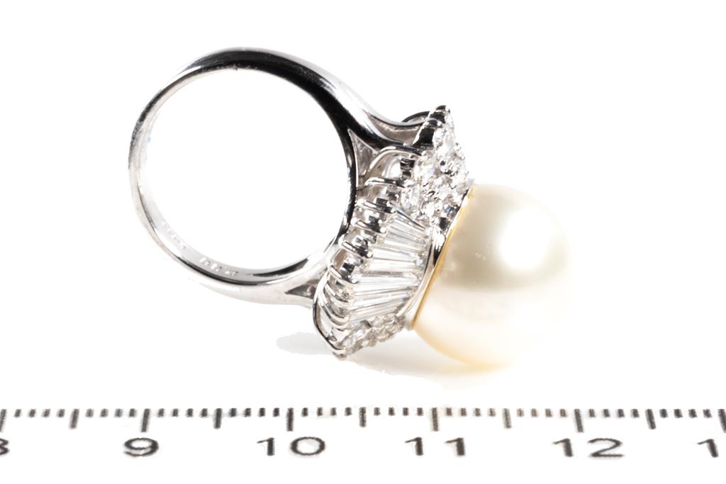 Pearl and Diamond ring with a South Sea Pearl of 13mm and round & baguette cut Diamonds totalling 2.38cts (Estimated grading: G-H VS). Platinum. Ring size I. Weight: 14.2g. (Pre-owned)
