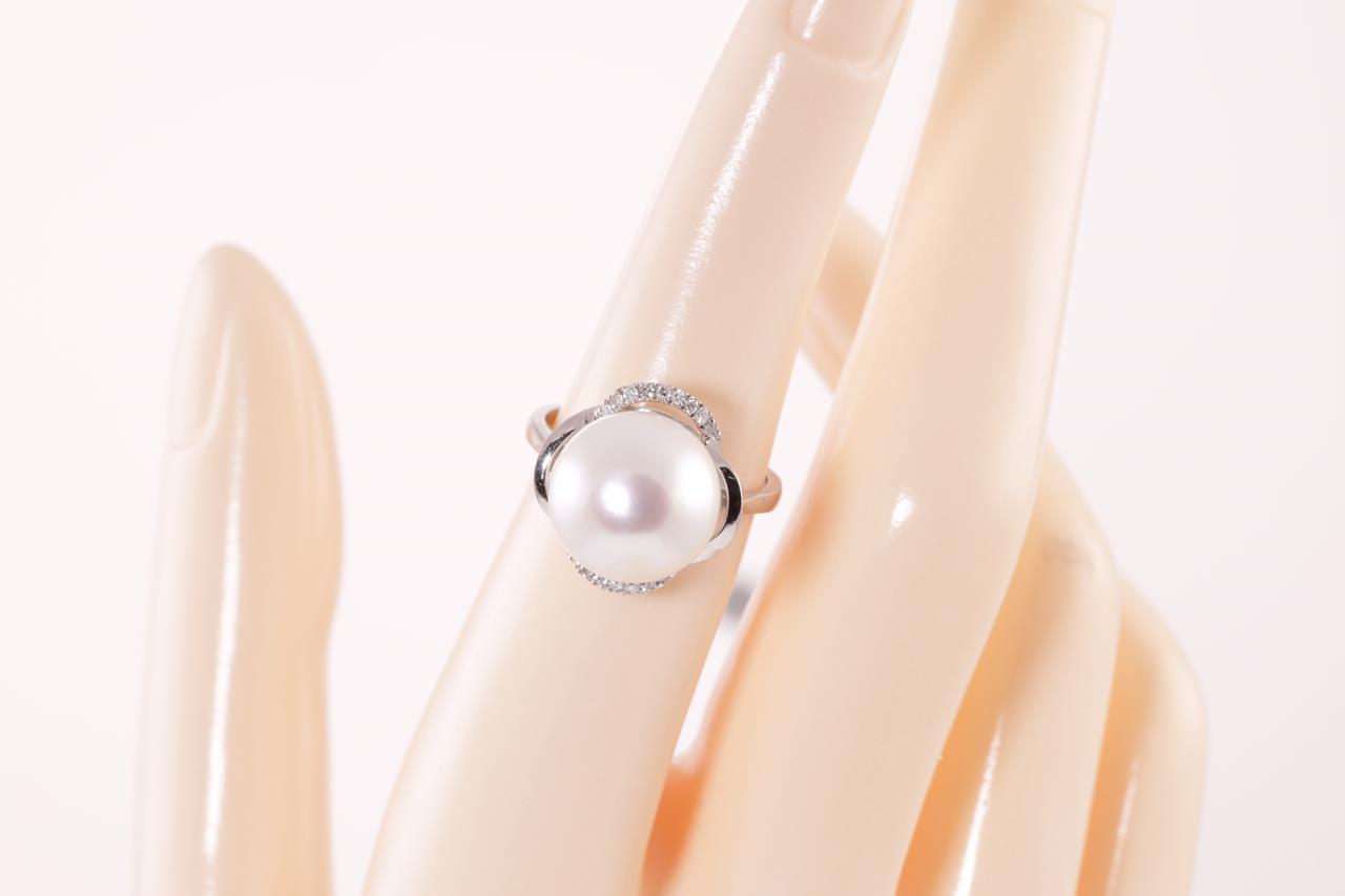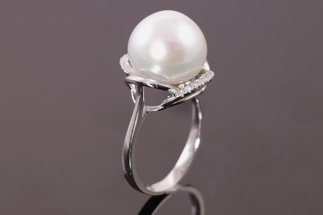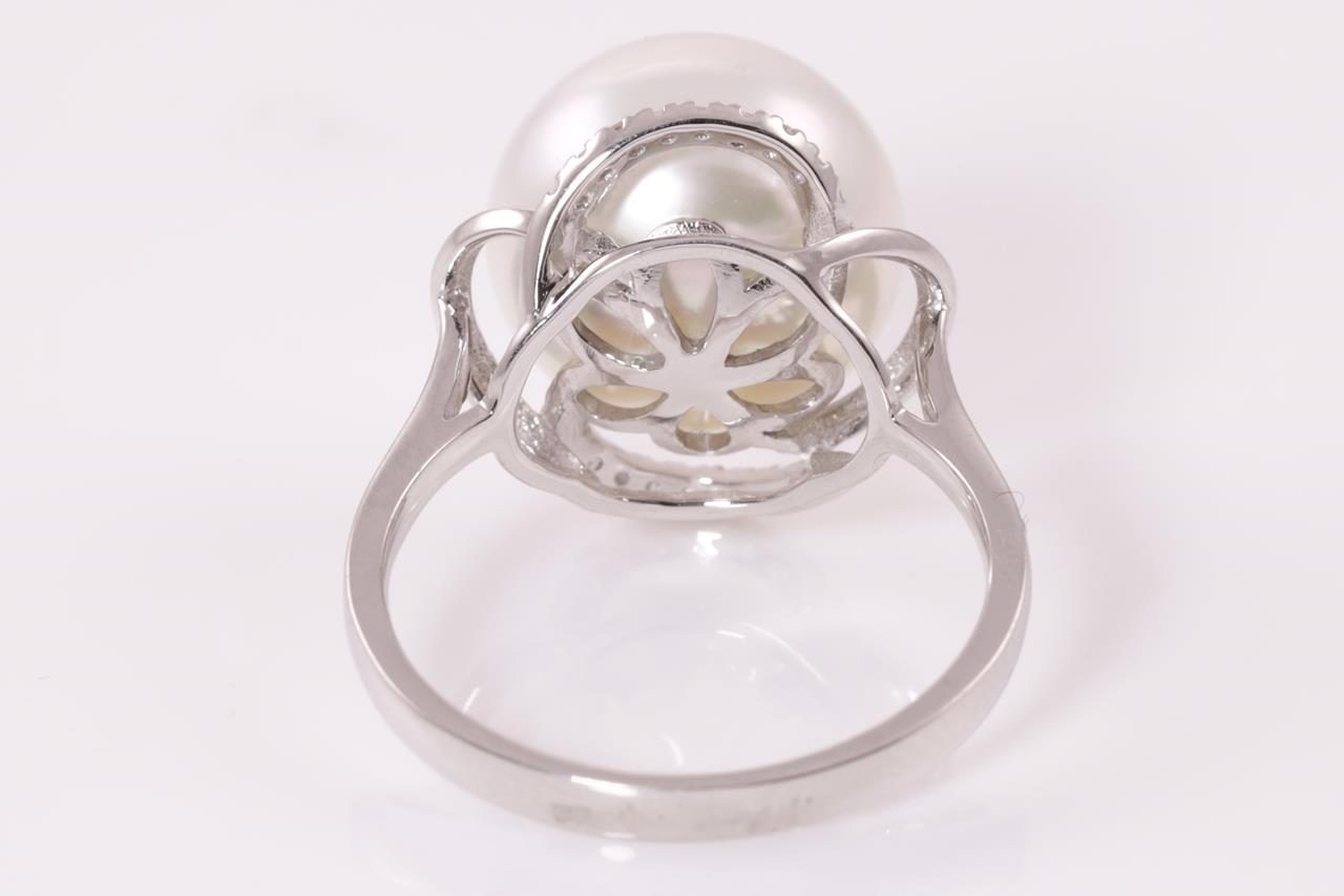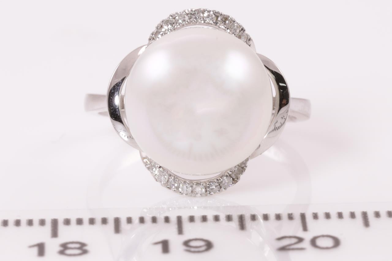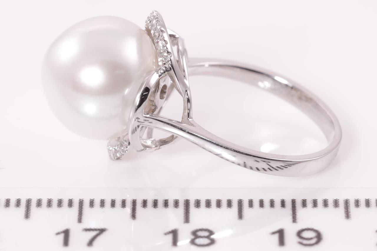 Pearl and Diamond Ring with white South Sea Pearl of 12mm and round Diamonds totalling approximately 0.10cts. 18ct white gold. Ring size L. Weight 5.0g. (As New)