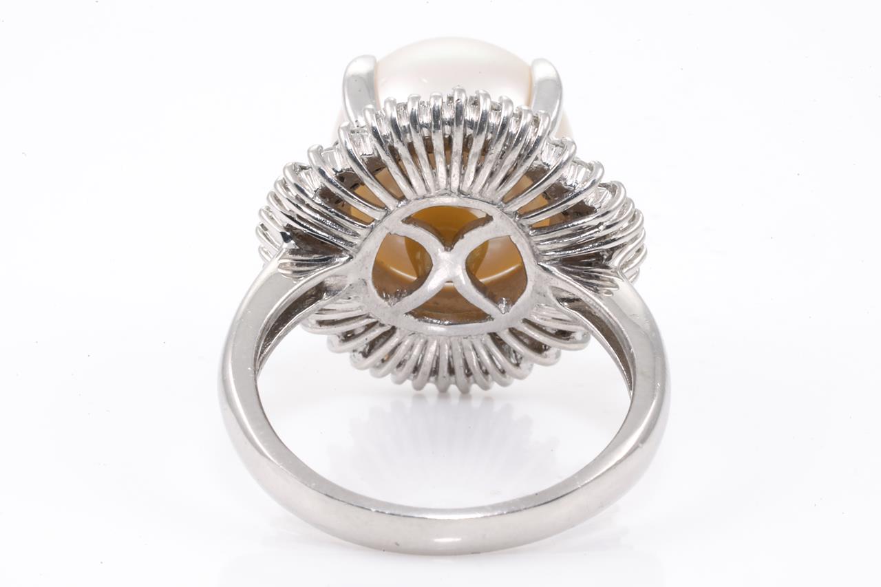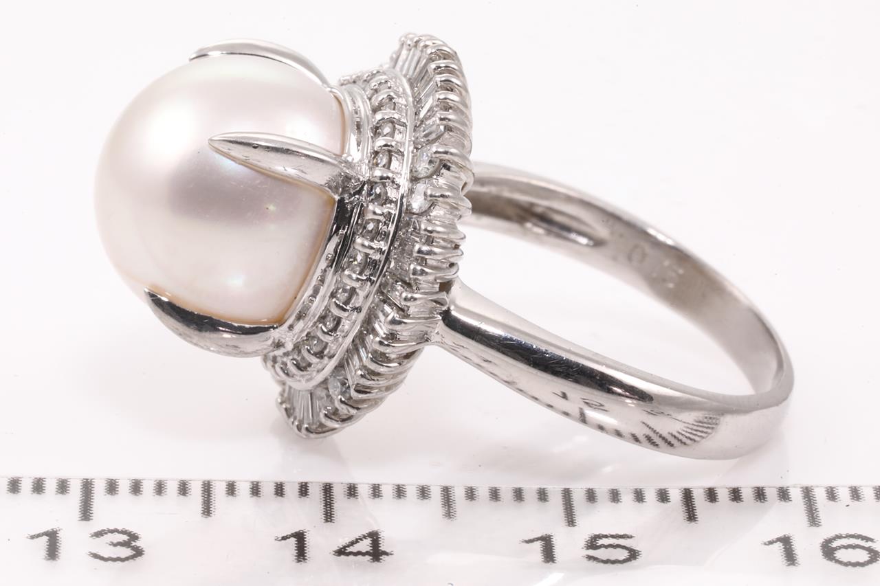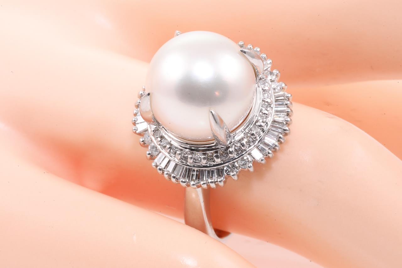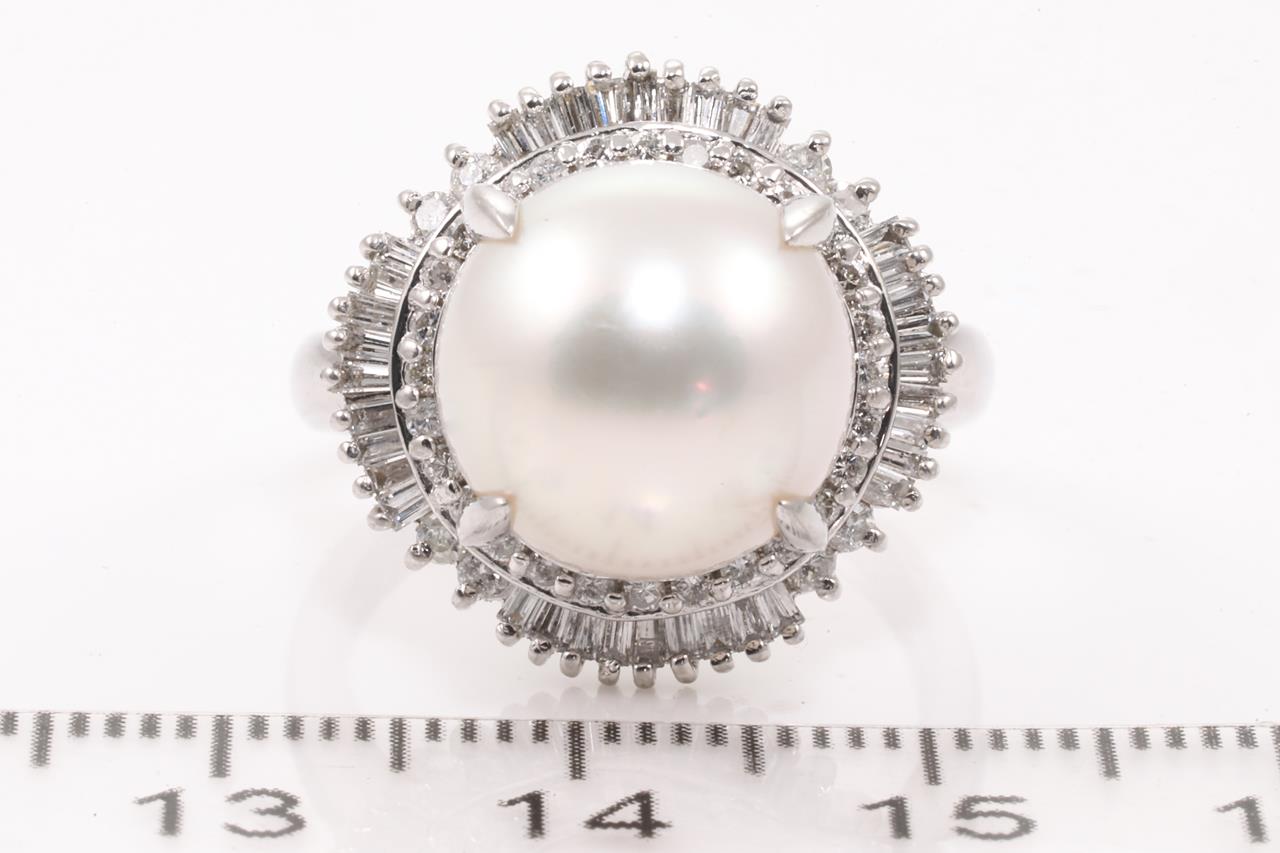 Pearl and Diamond ring with South Sea Pearl of 11.8mm and surrounding round and baguette cut Diamonds totalling 0.75cts (Estimated grading: G-H SI-P1). Platinum. Ring size: N. Weight: 12.9g. (Pre-owned)