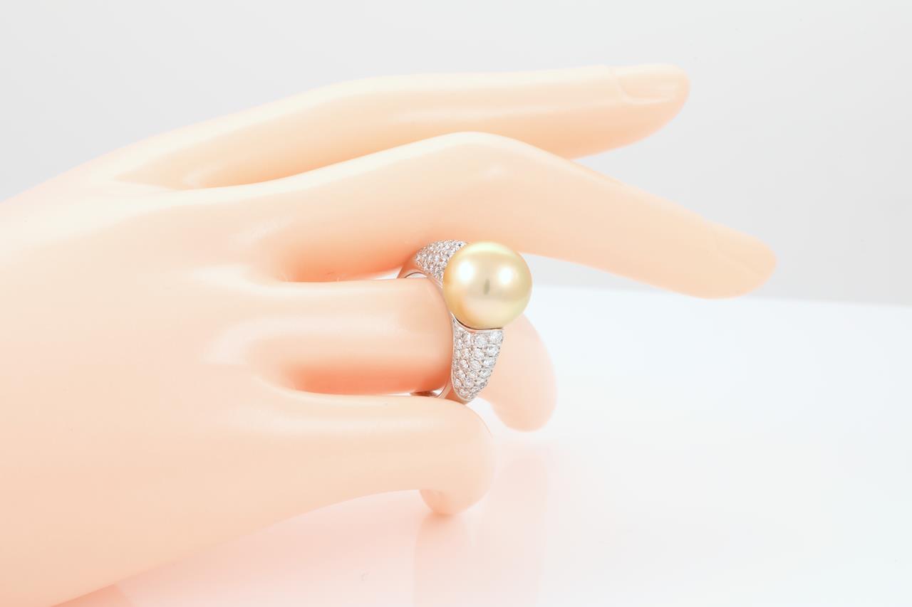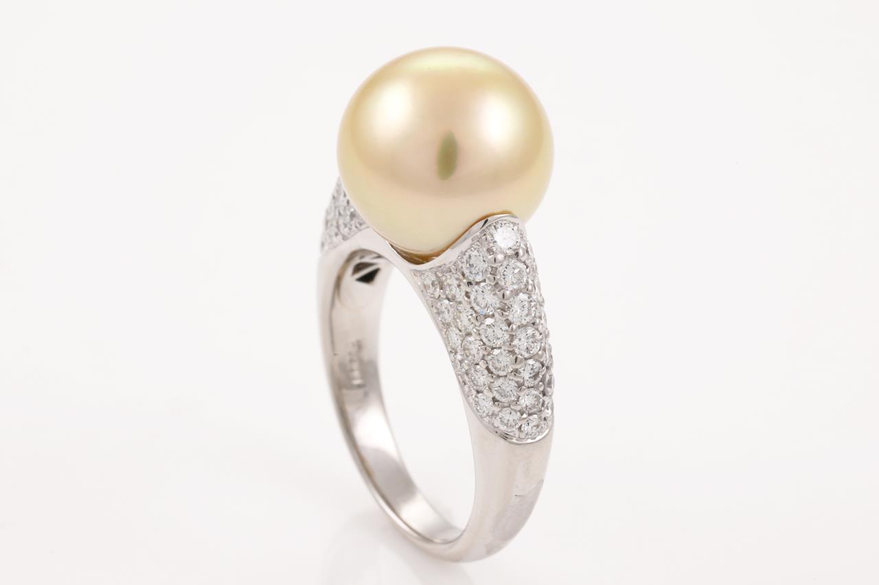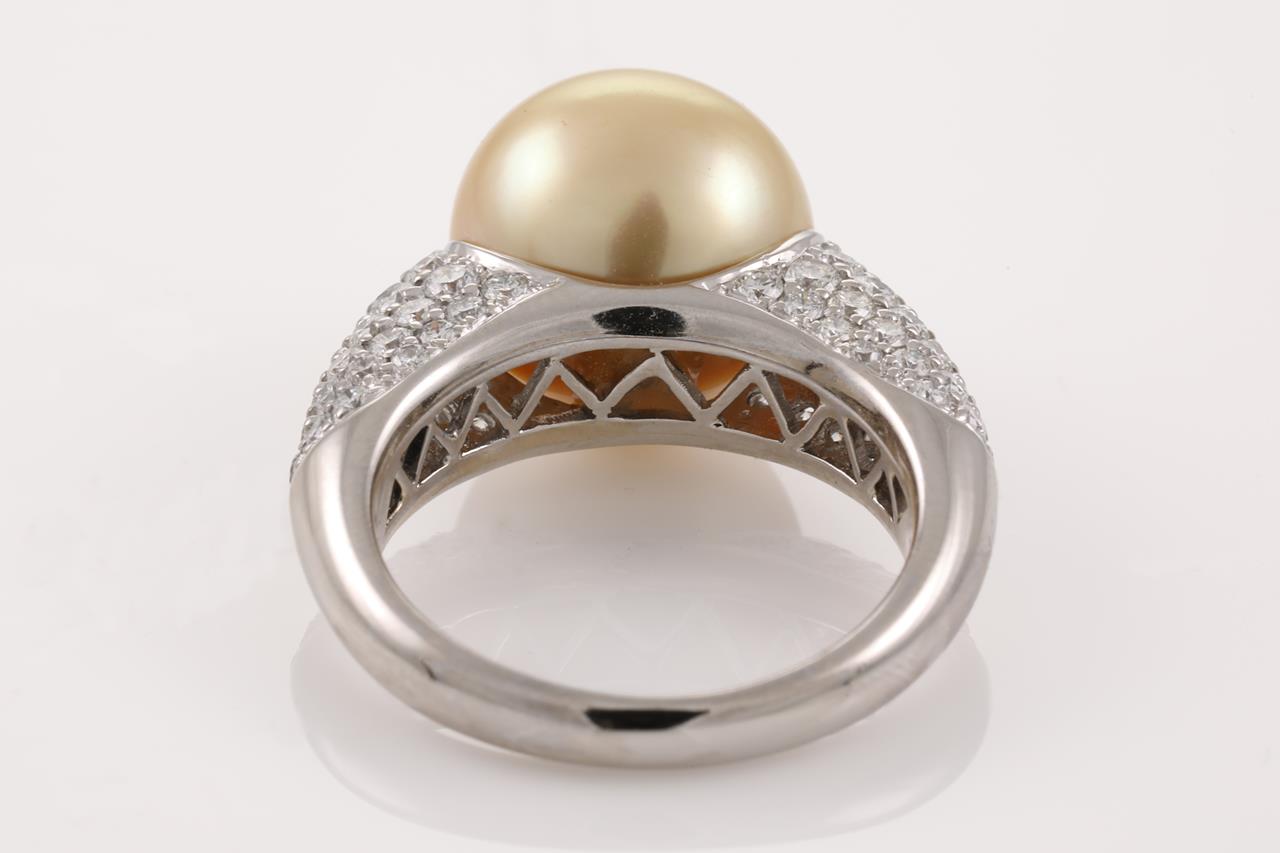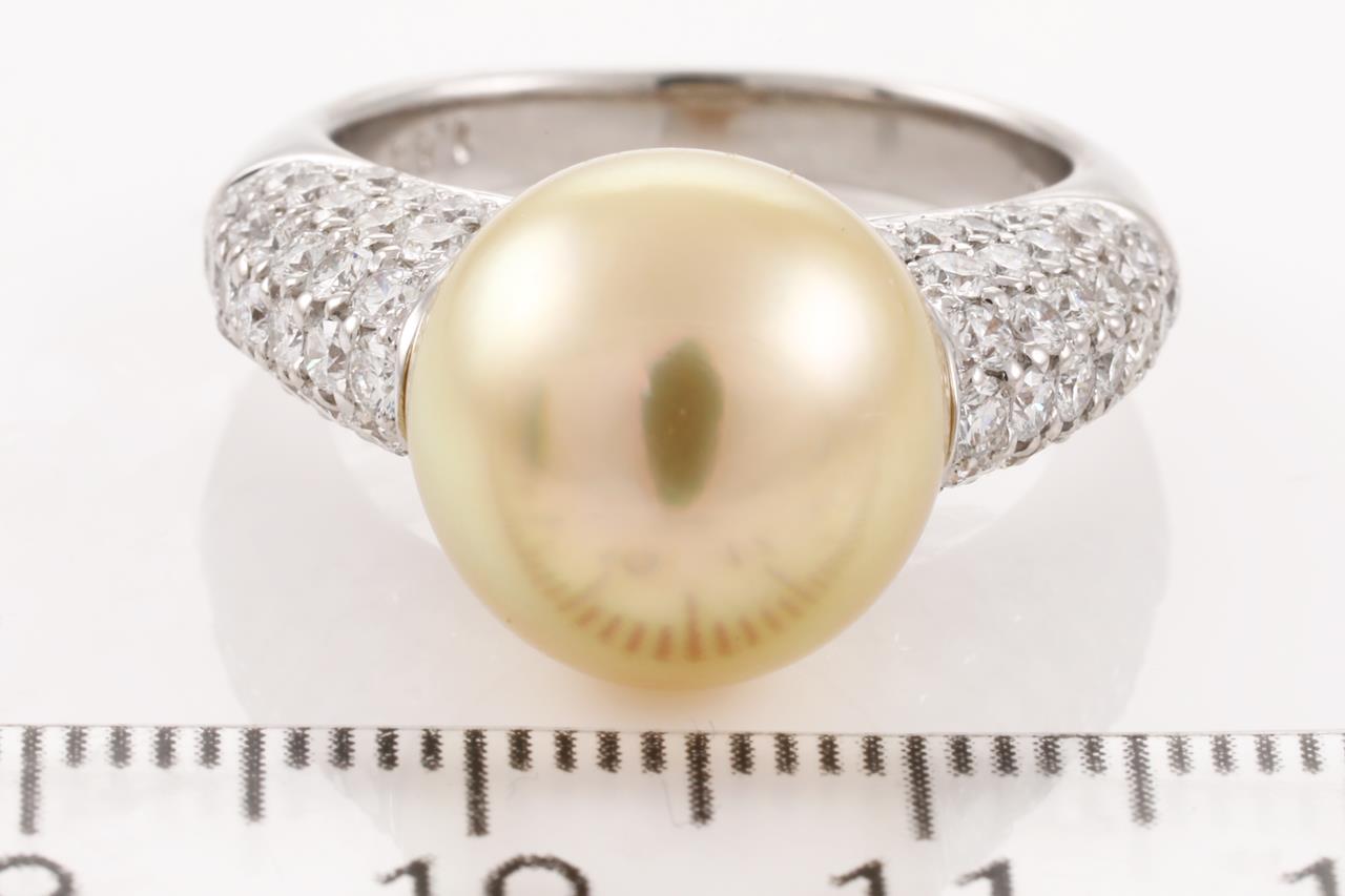 Pearl and Diamond Ring with a golden South Sea Pearl of 12.4mm and Diamonds totalling 1.40cts (Estimated grading: G-H VS-SI). Platinum. Ring size M1/2 - ring resizing is not recommended. Weight: 11.2g. (Pre-owned)
