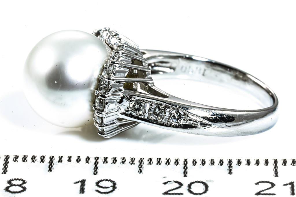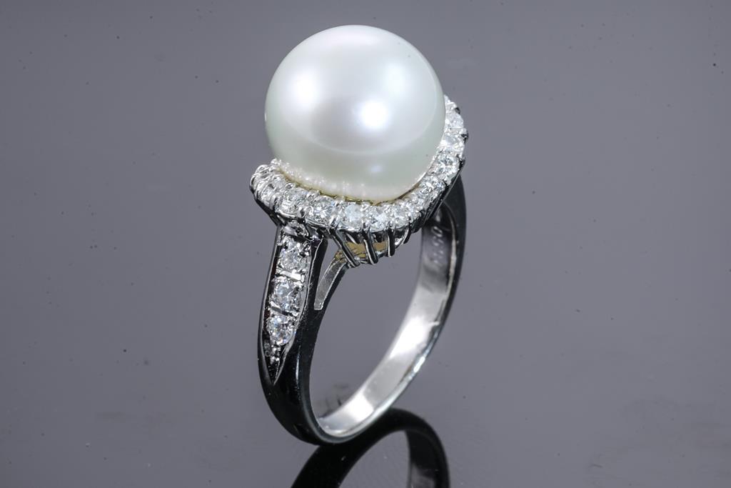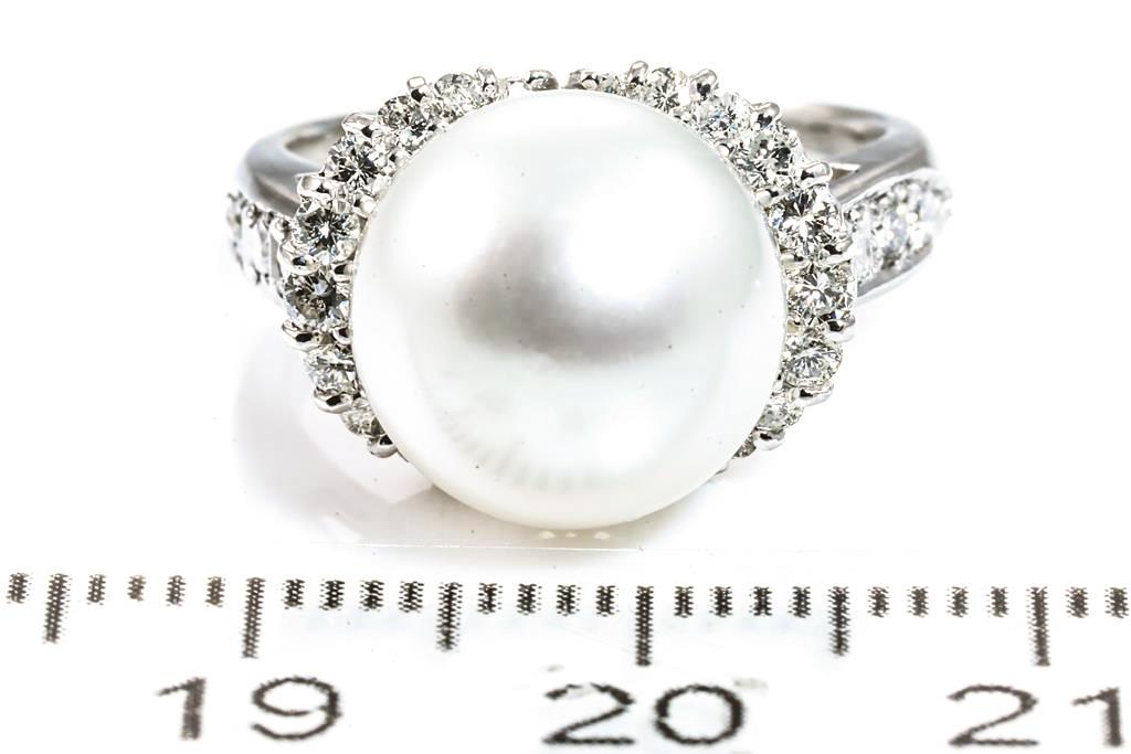 Pearl and Diamond ring with South Sea Pearl of 11mm and round Diamonds totalling 0.58cts (Estimated grading: H SI). Platinum. Ring size: J. Weight: 9.3g. (Pre-owned)