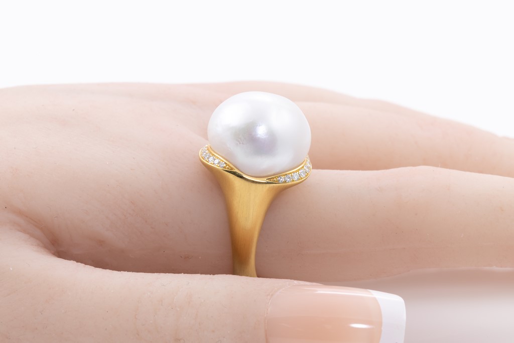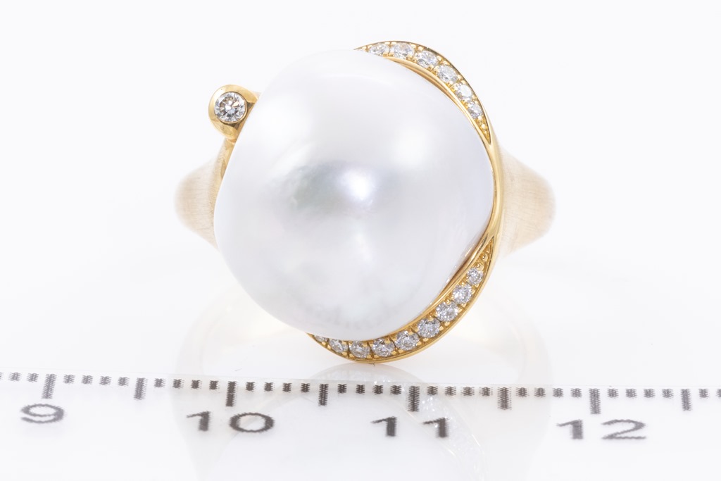 South Sea Pearl and Diamond ring with baroque South Sea Pearl of 15-16mm and round Diamonds totalling approximately 0.30cts (Estimated grading H VS). 18ct frosted yellow gold. Ring size P. Weight 17.0g. (As New)
