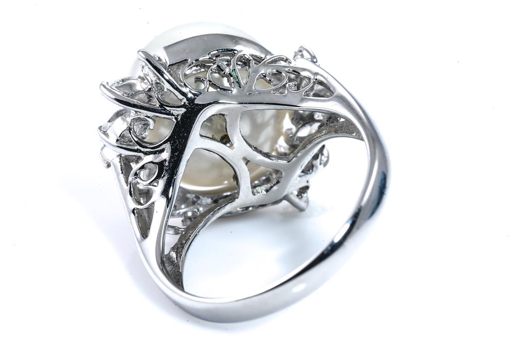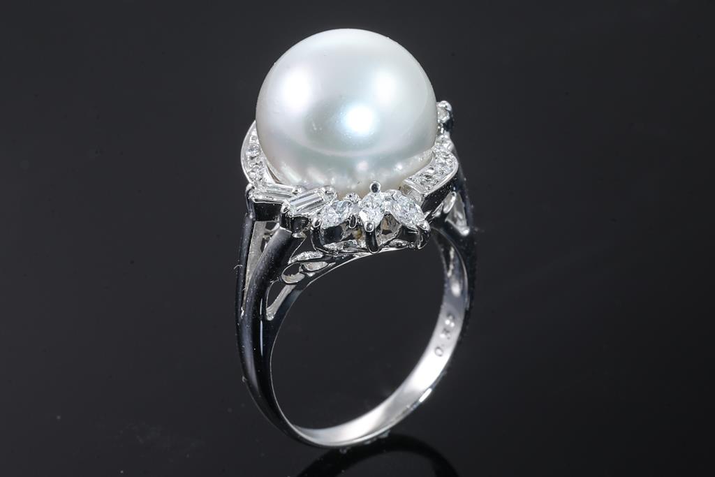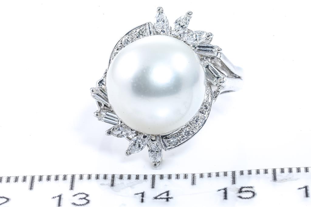 Pearl and Diamond ring with a South Sea Pearl of 12.1mm and round, marquise & baguette cut Diamonds totalling 0.52cts (Estimated girding: G SI). Platinum. Ring size L1/2. Weight: 9.9g. (Pre-owned)